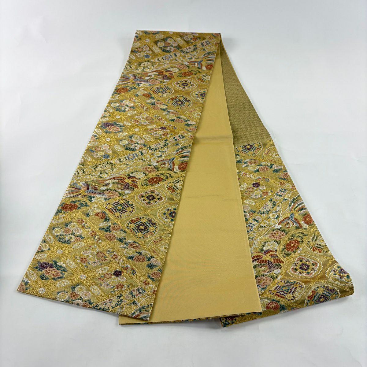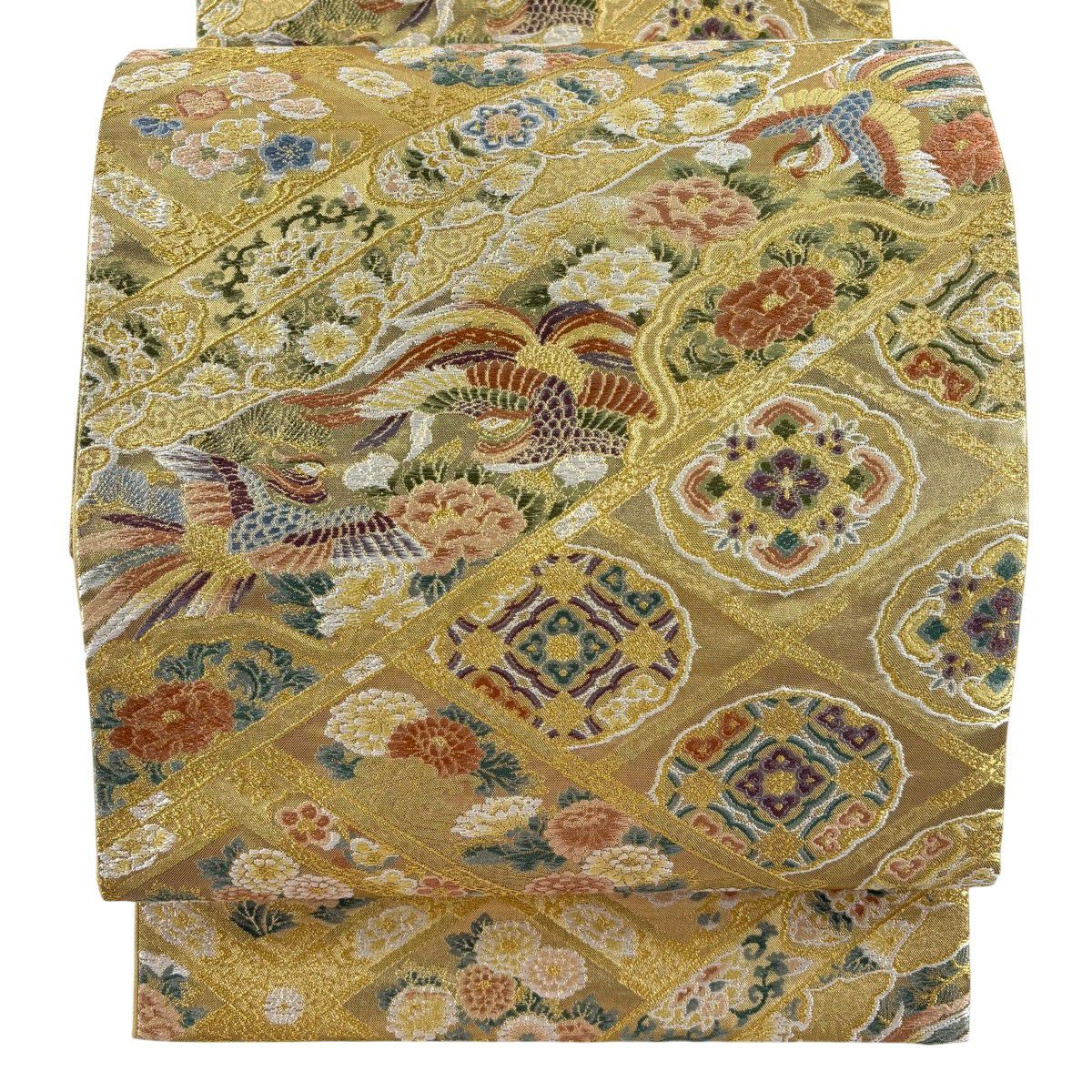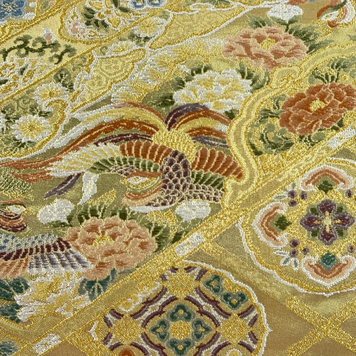 【美品】 袋帯 秀品 やまと 鳳凰 草花 金糸 箔 金色 六通 正絹