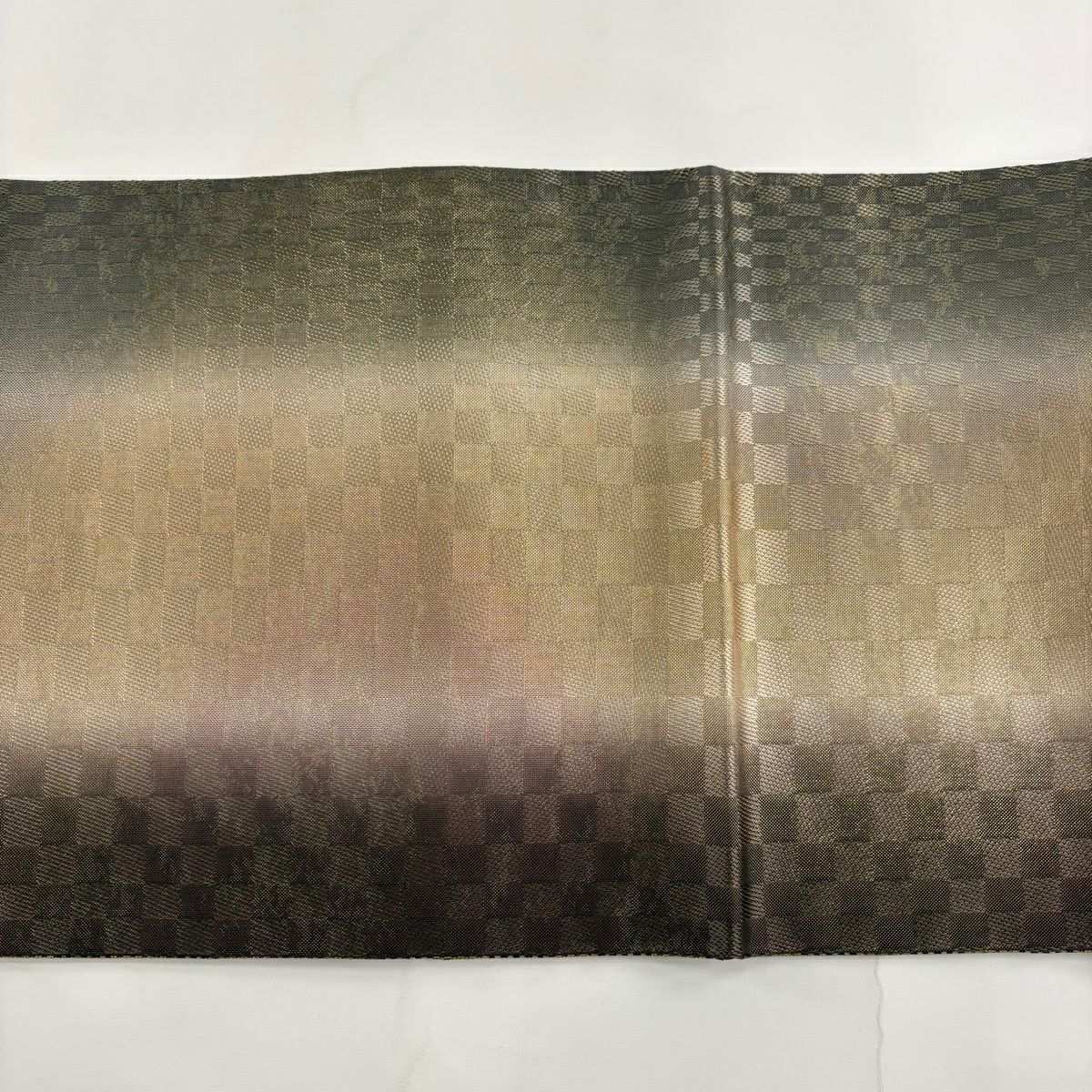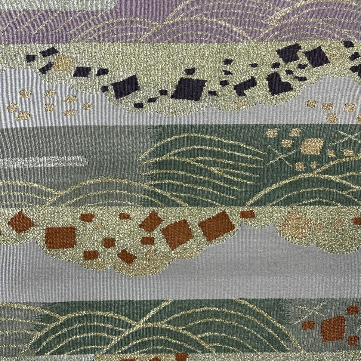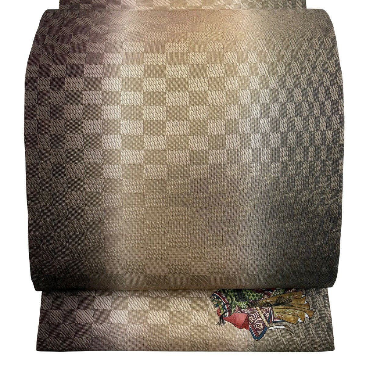 【美品】 袋帯 秀品 変わり市松 幾何学模様 箔 茶紫 全通 正絹