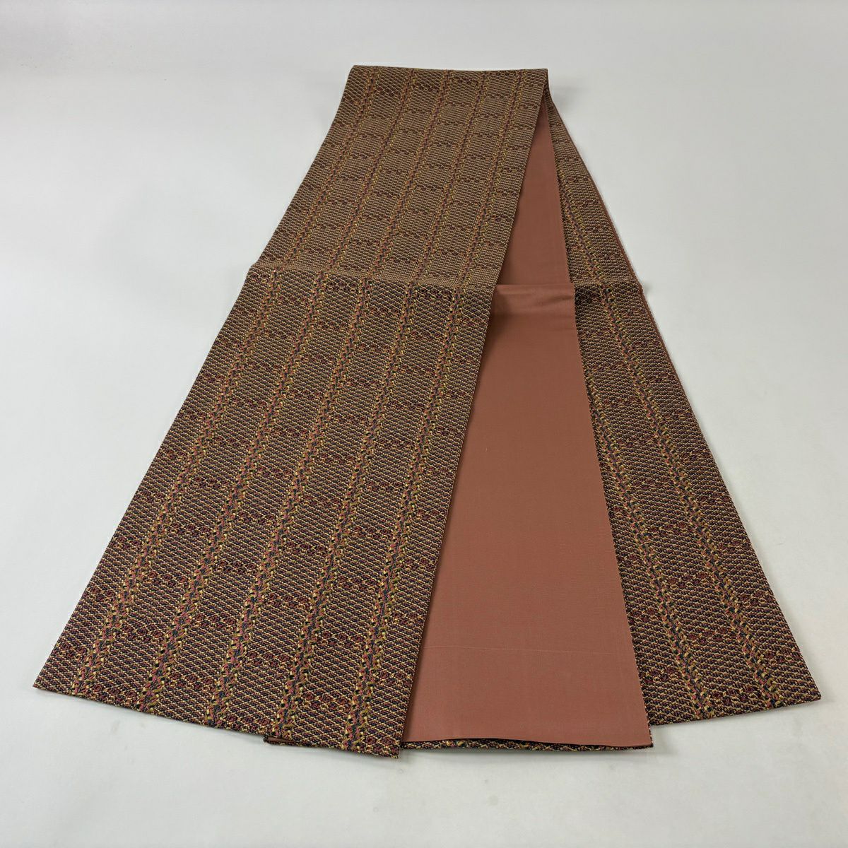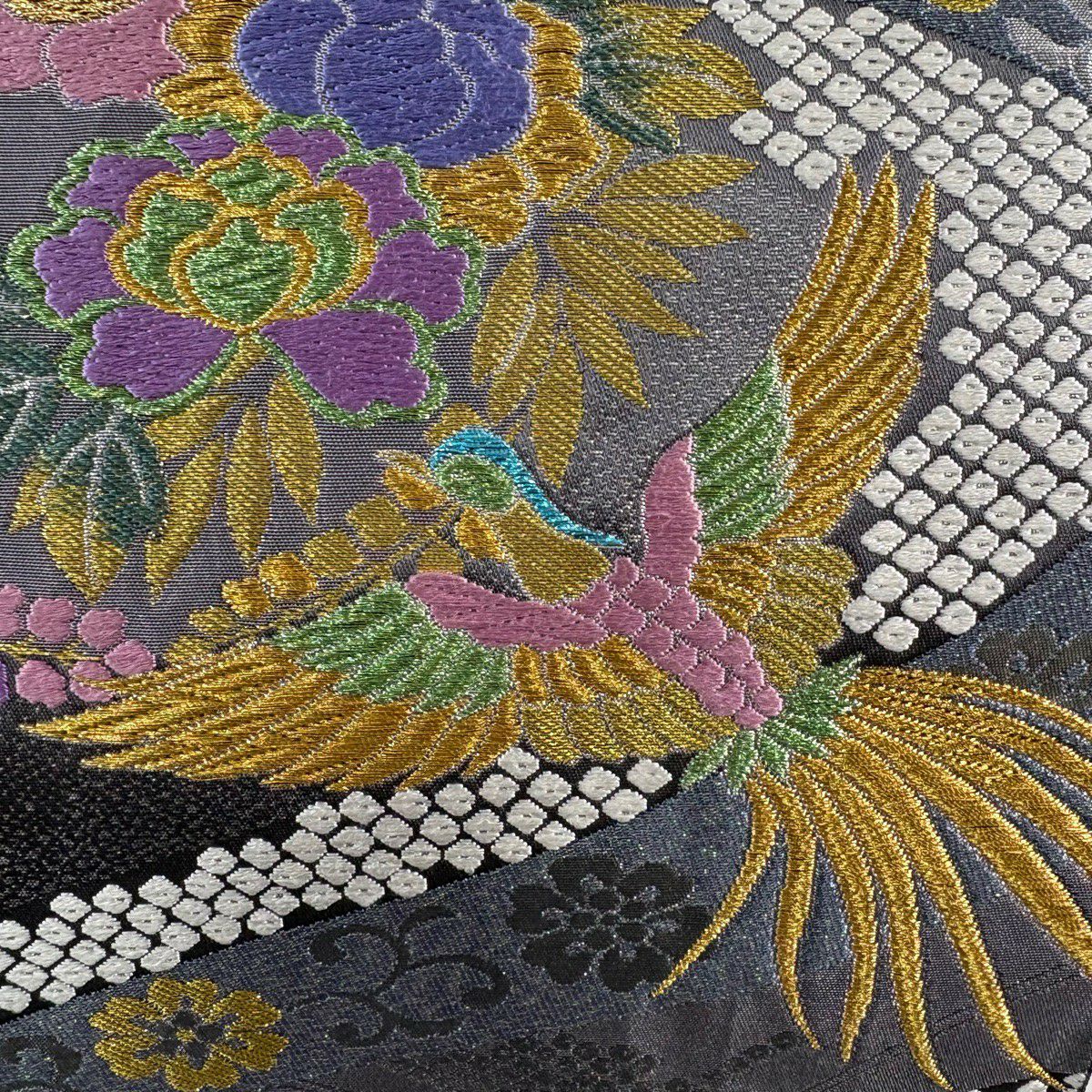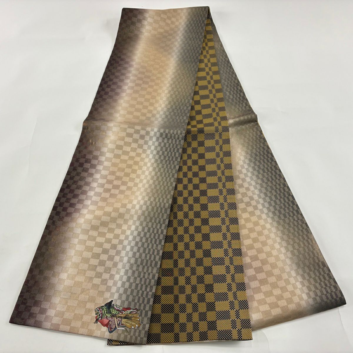 【美品】 袋帯 秀品 変わり市松 幾何学模様 箔 茶紫 全通 正絹