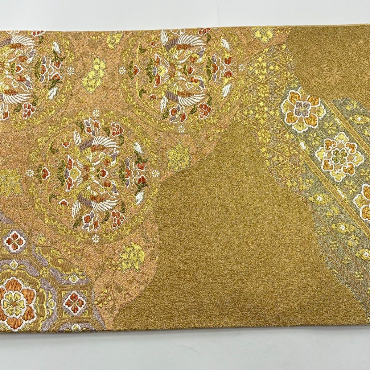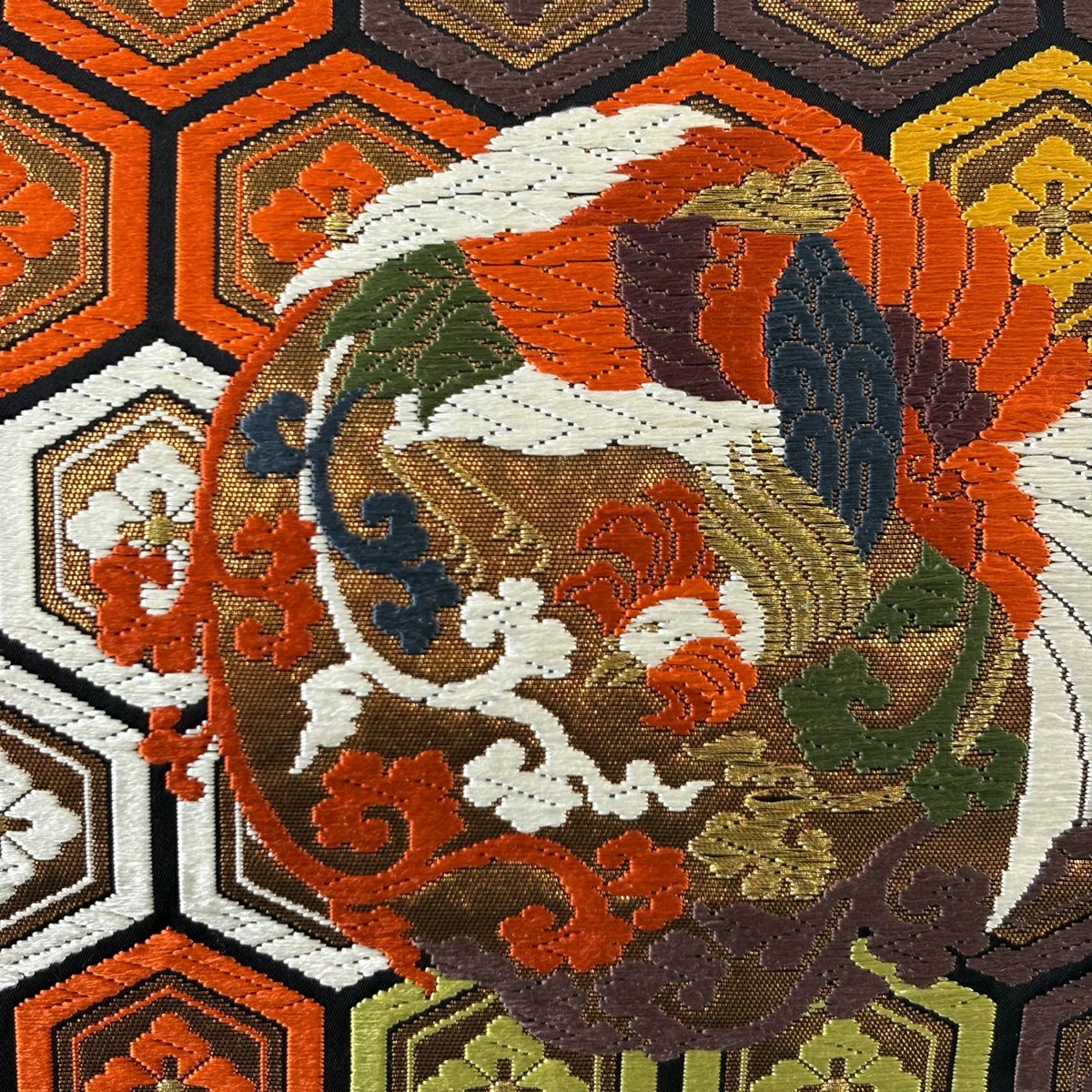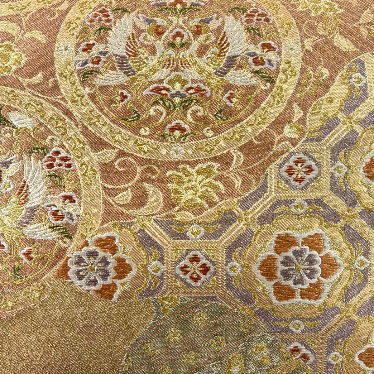 【美品】 袋帯 秀品 亀甲 鳳凰 箔 唐織 オレンジ 六通 正絹