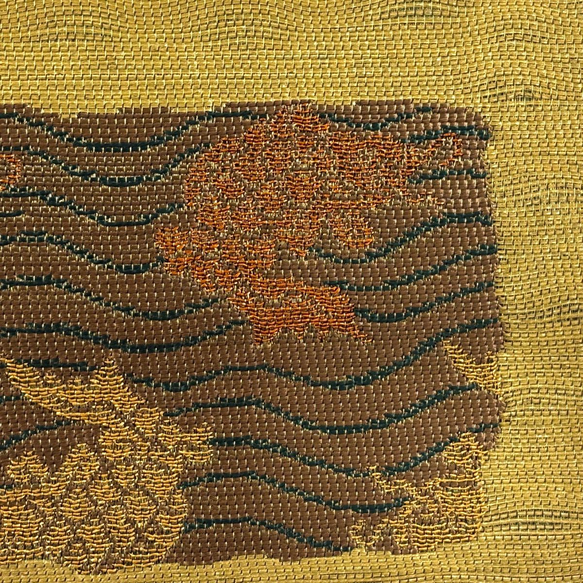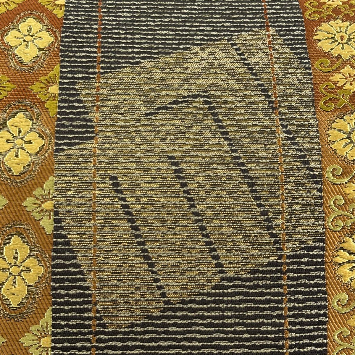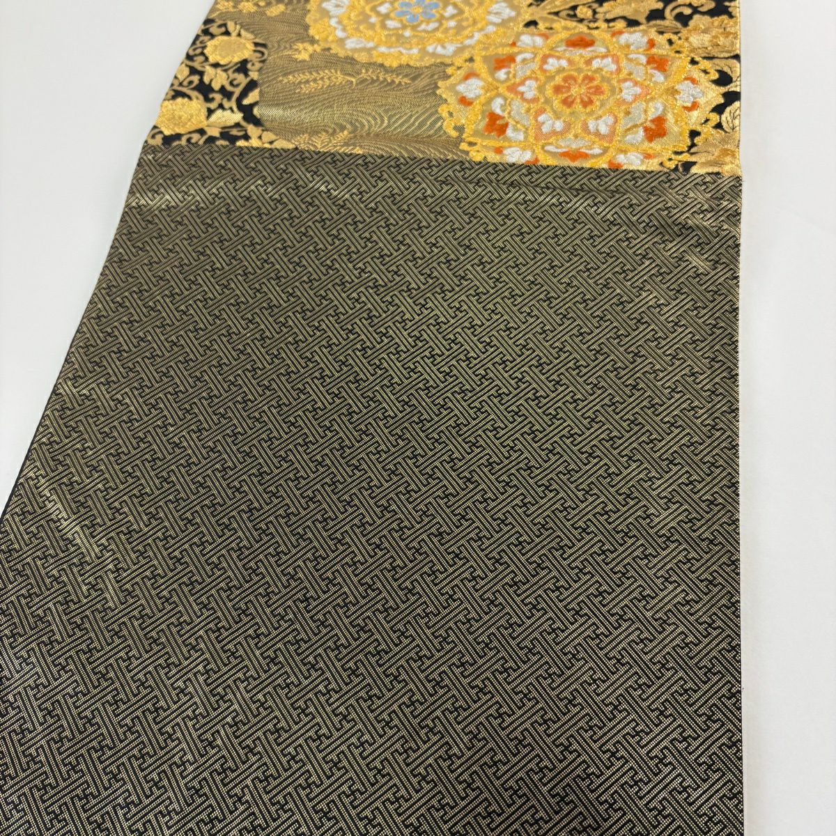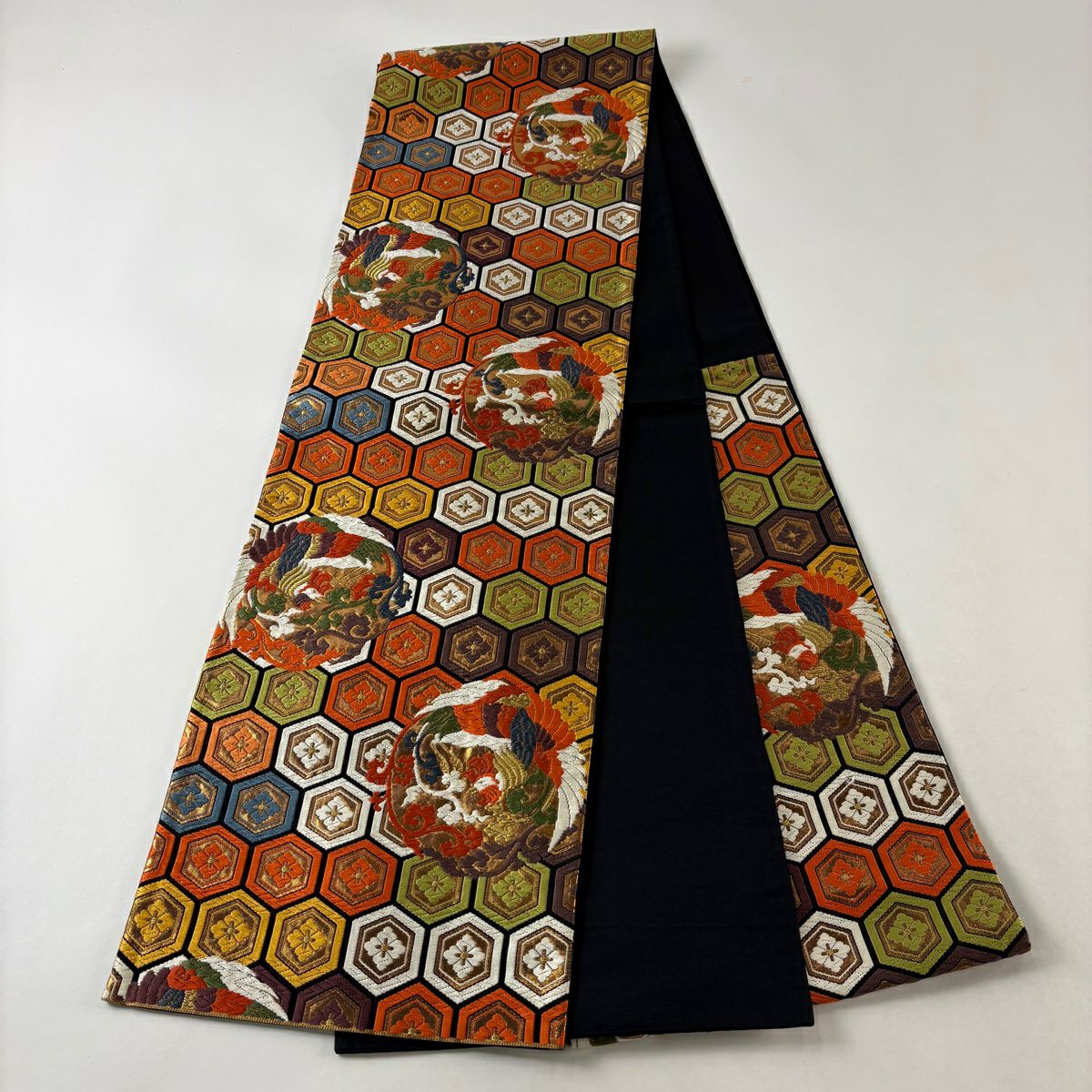 【美品】 袋帯 秀品 亀甲 鳳凰 箔 唐織 オレンジ 六通 正絹