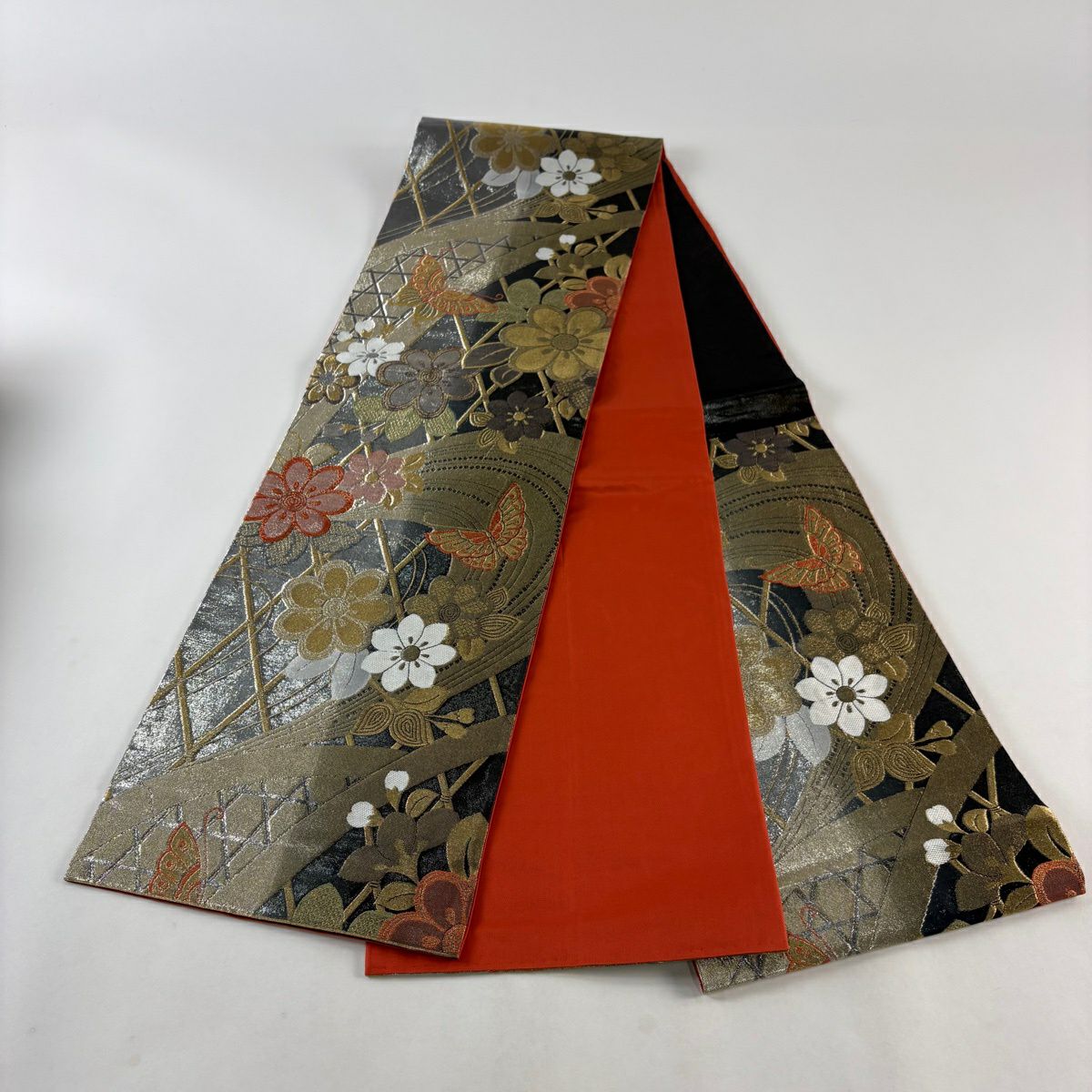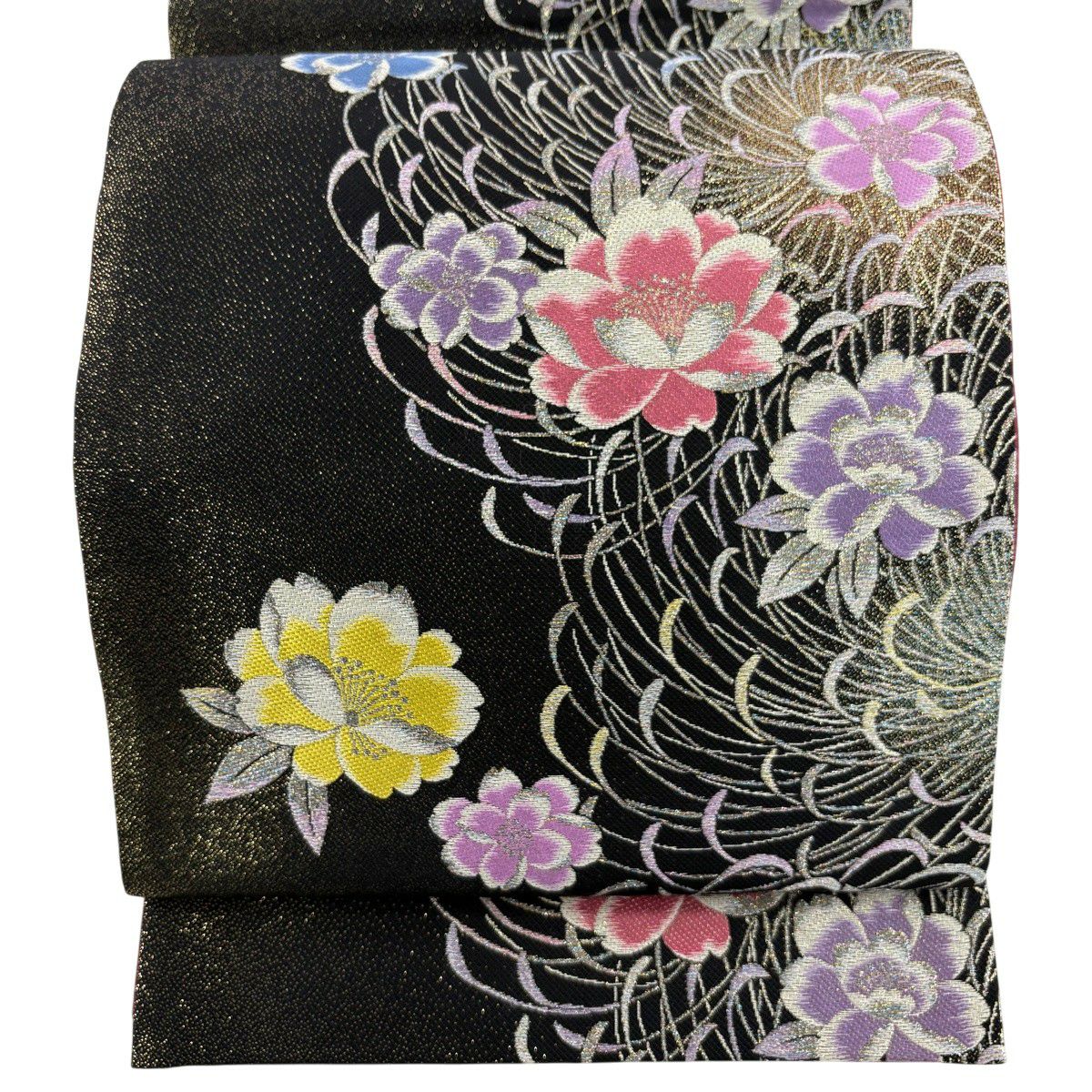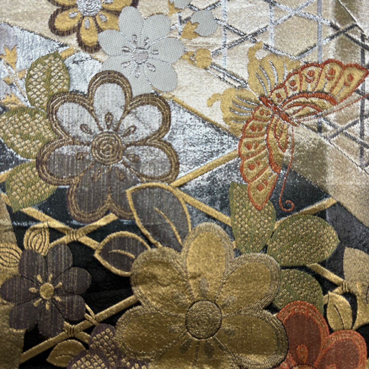 【美品】 袋帯 秀品 振袖向き 花 蝶 金糸 箔 銀色 六通 正絹