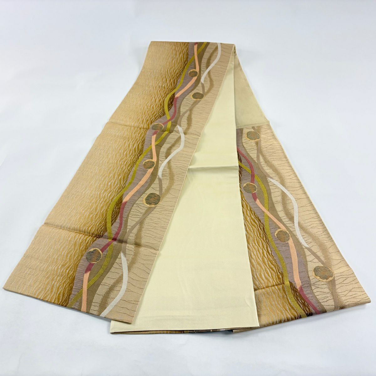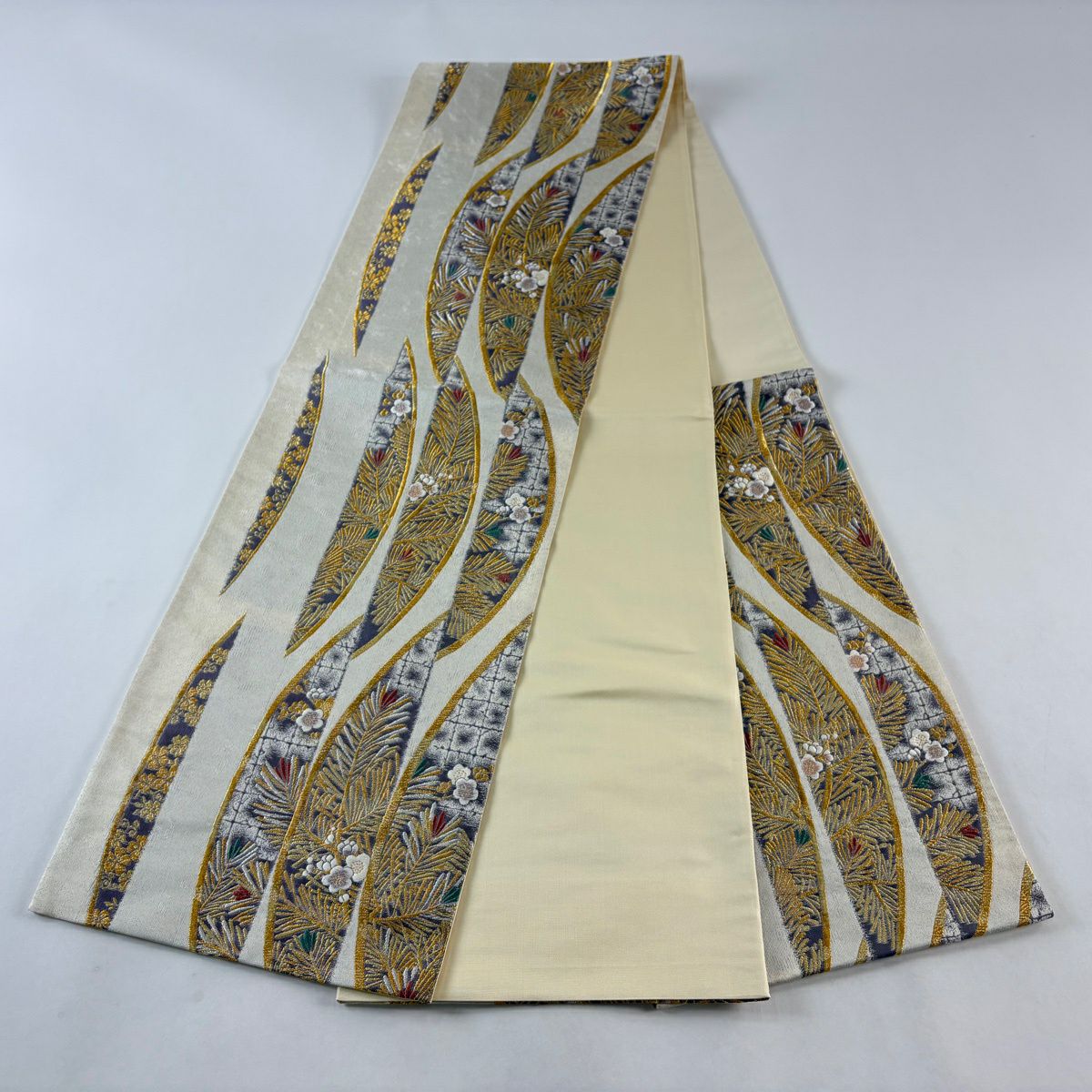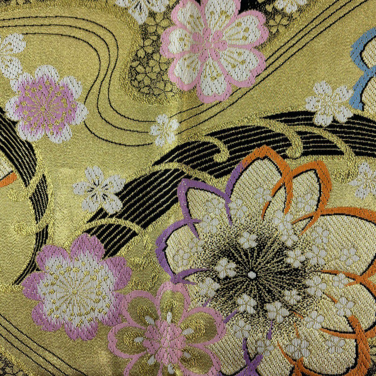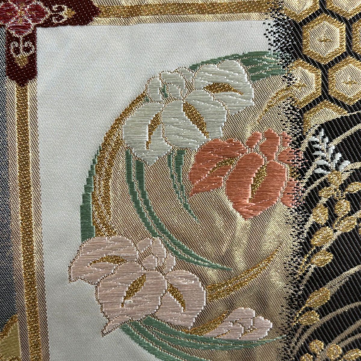 袋帯 秀品 関西仕立て 花丸文 波 金糸 箔 クリーム 六通 正絹