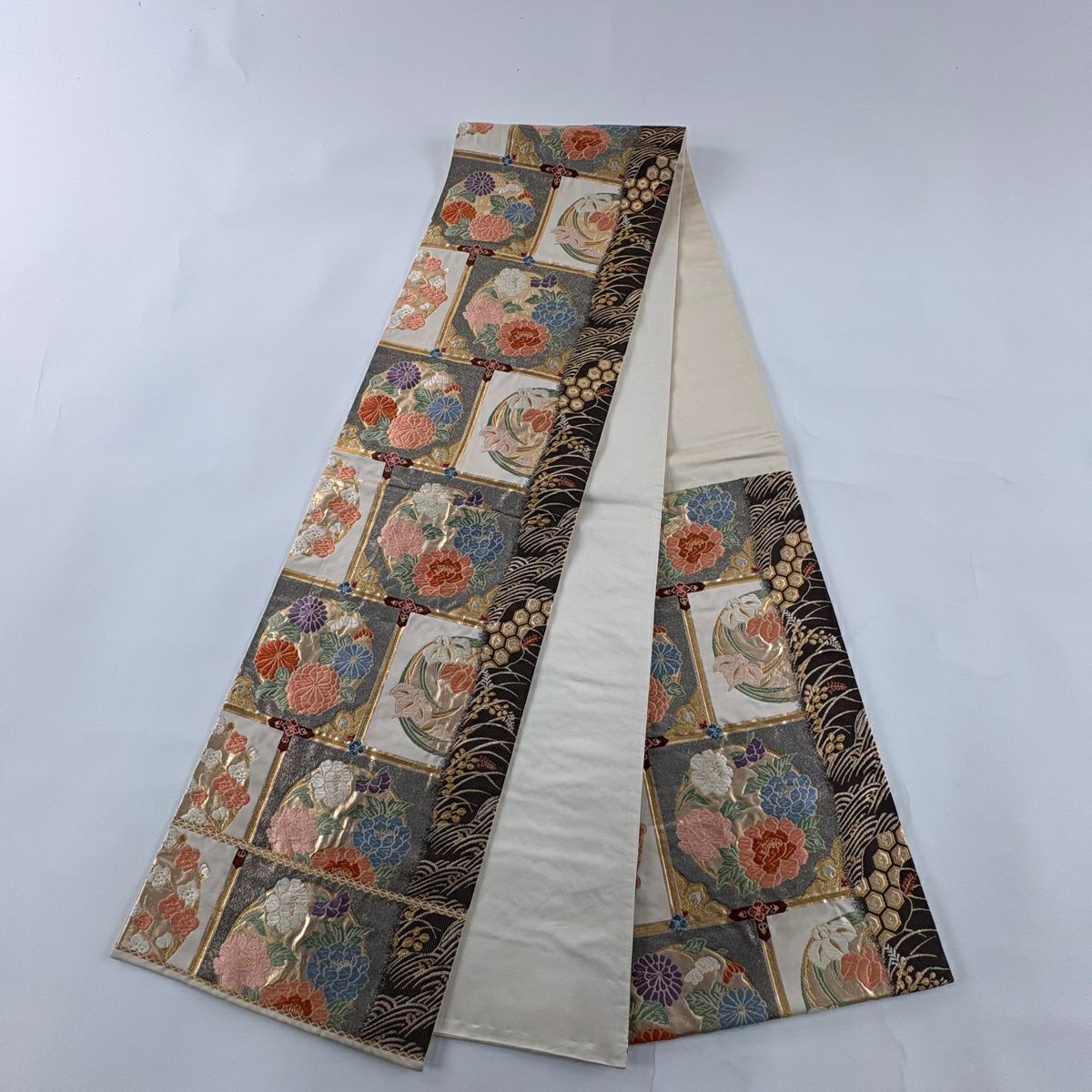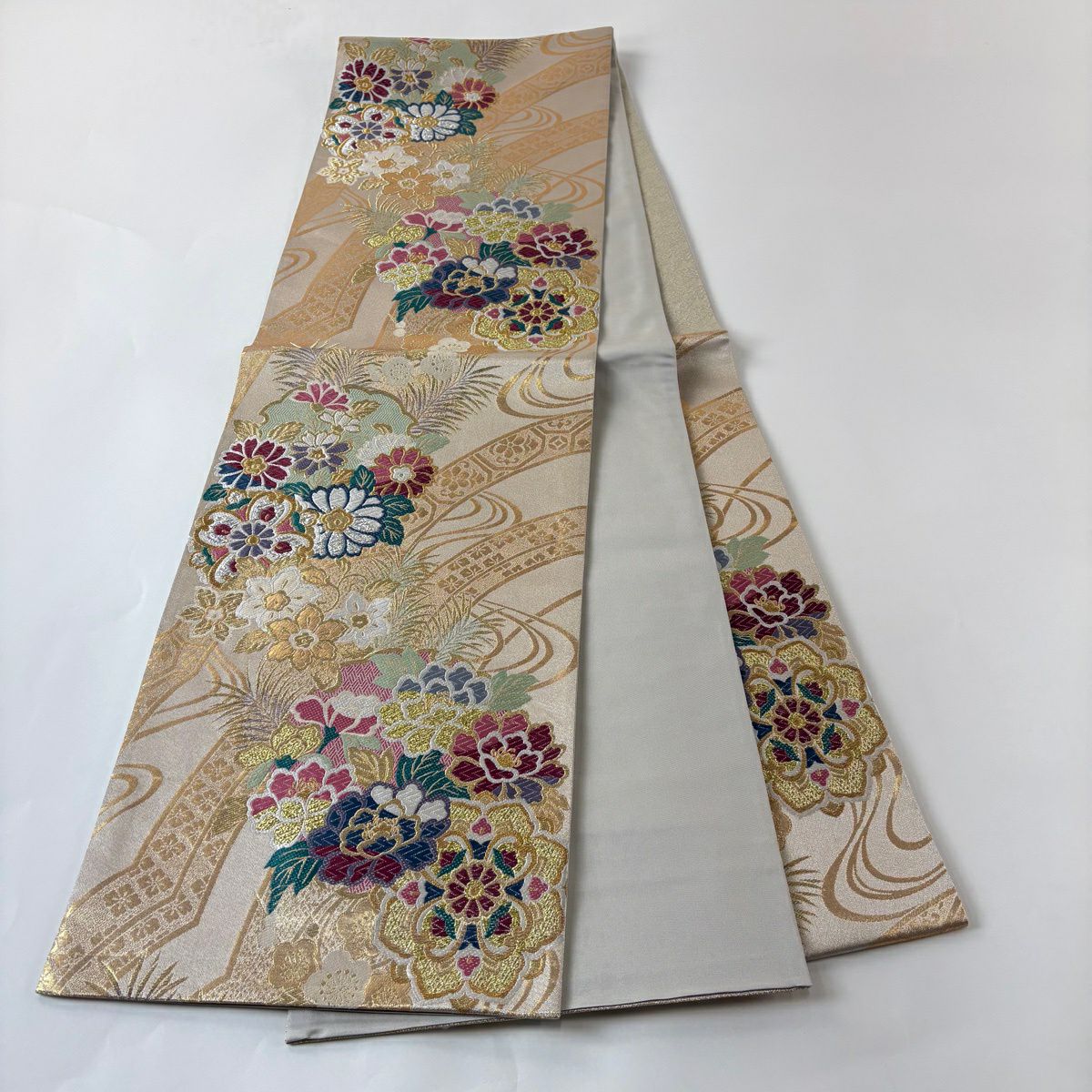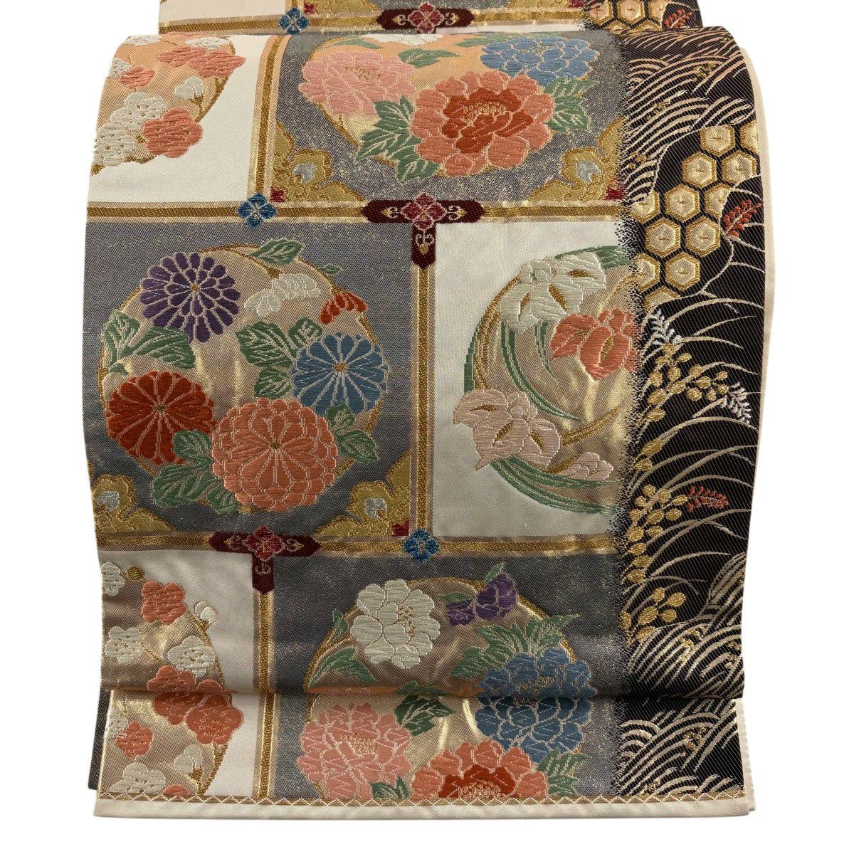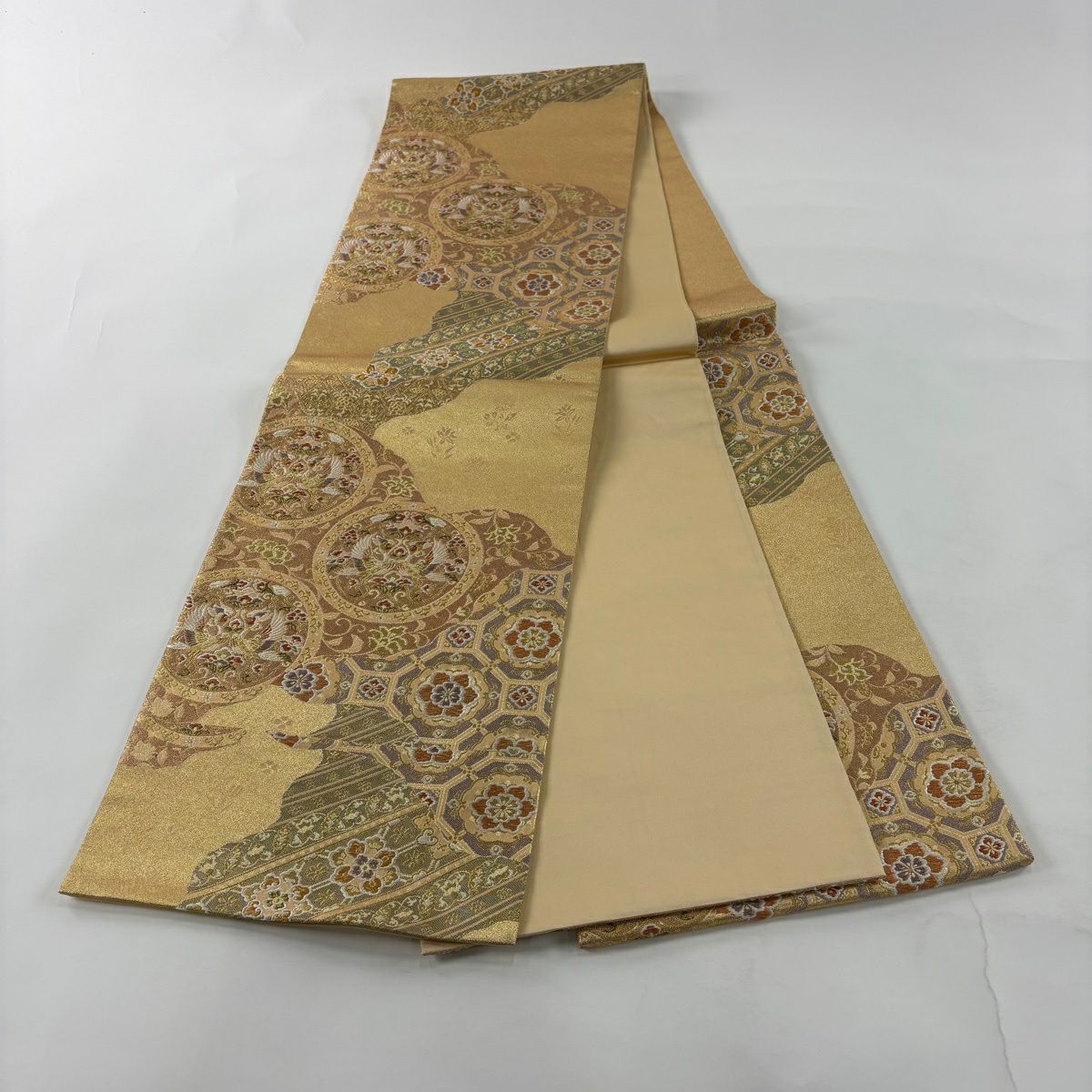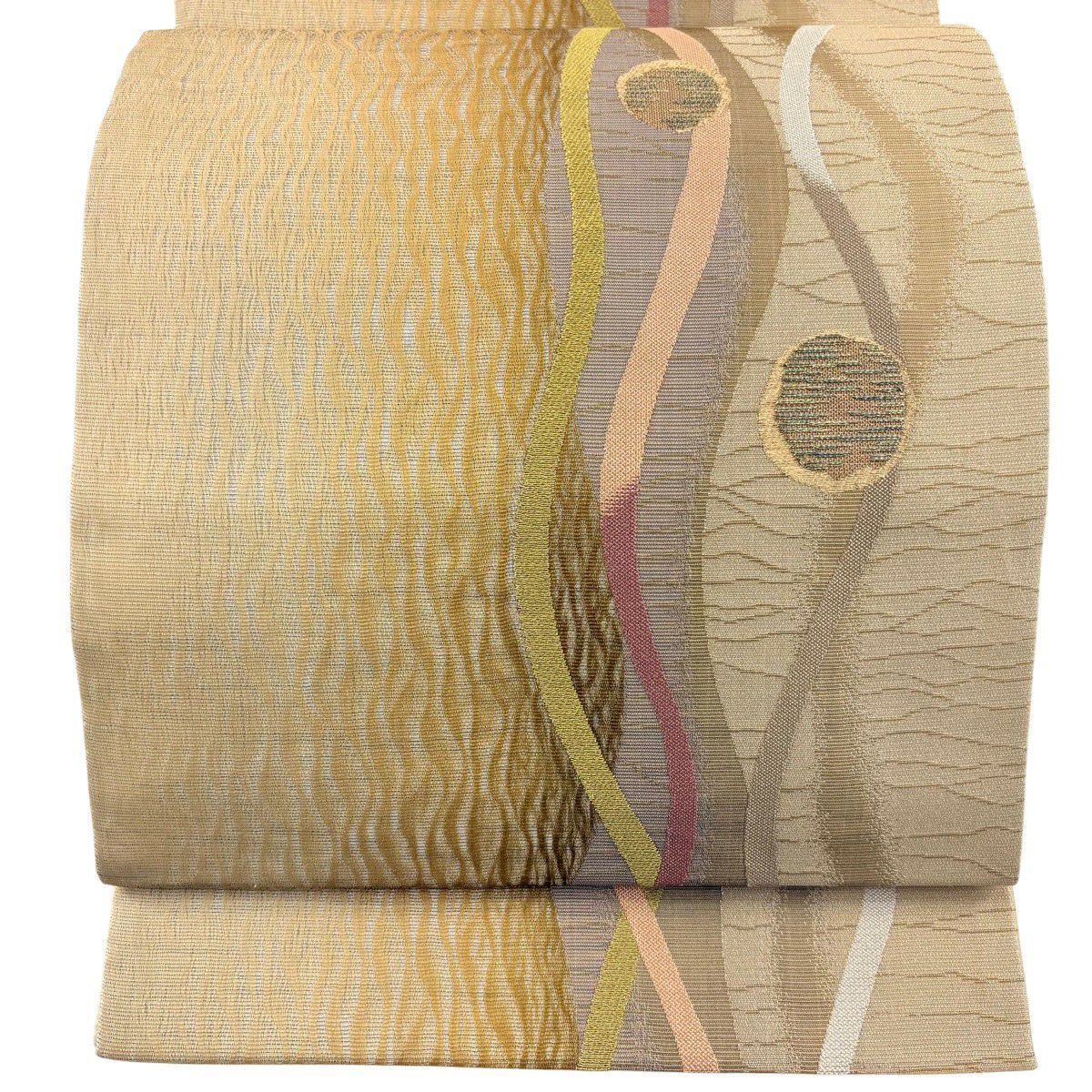 袋帯 秀品 関西仕立て 花丸文 波 金糸 箔 クリーム 六通 正絹