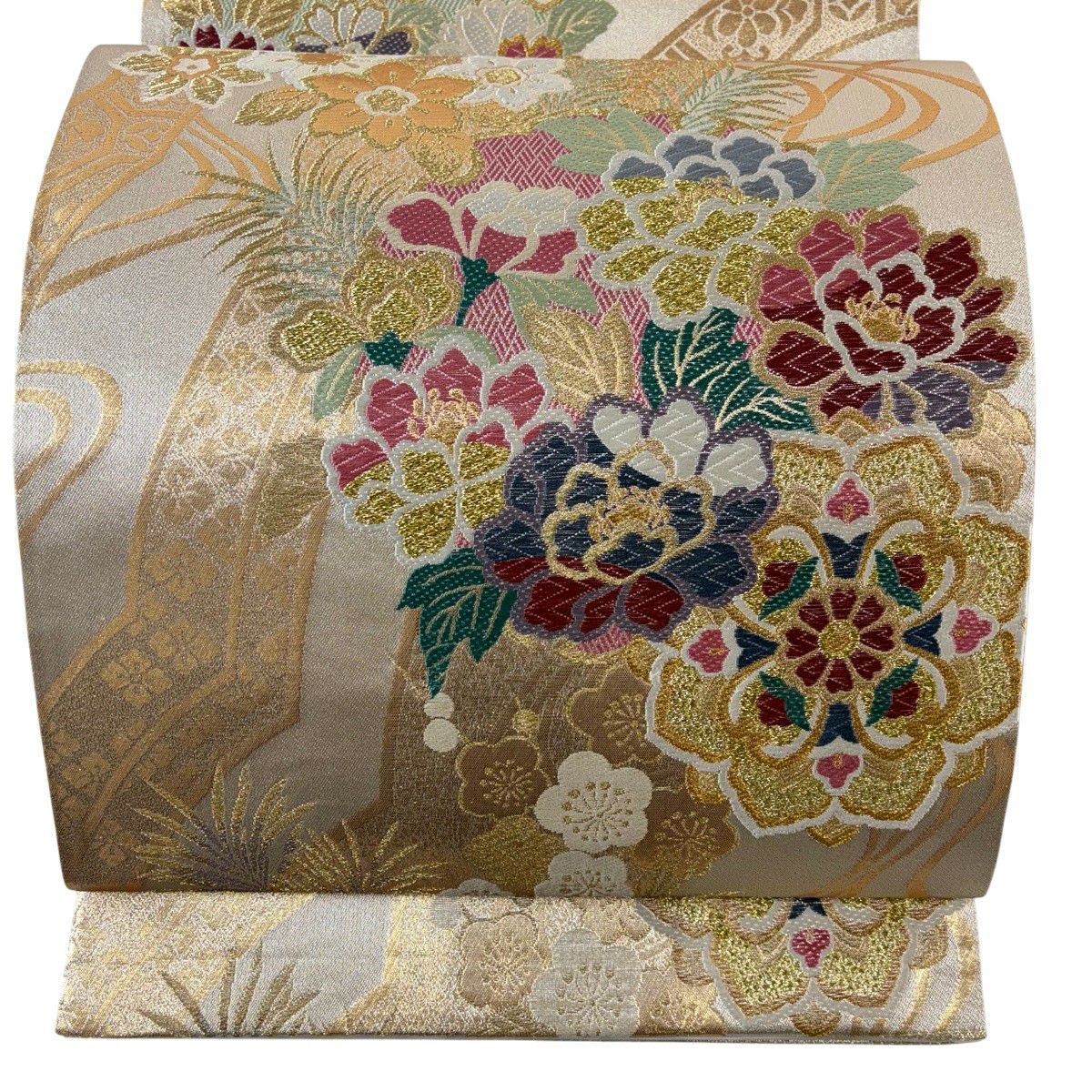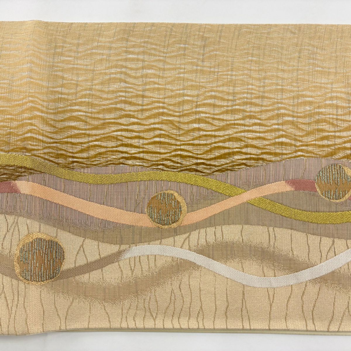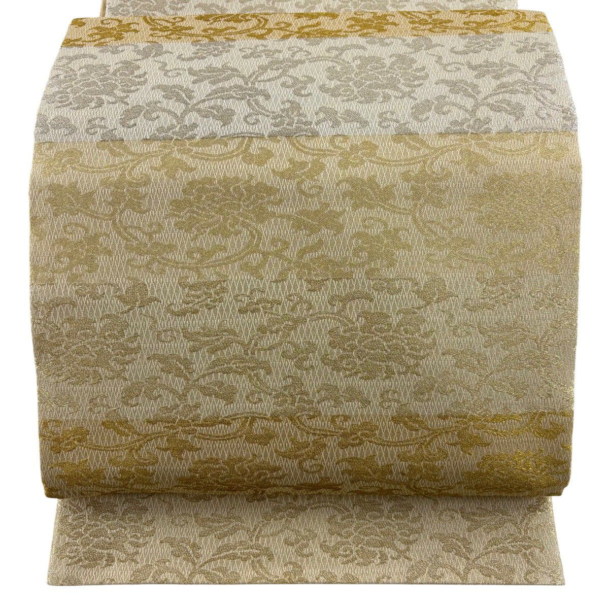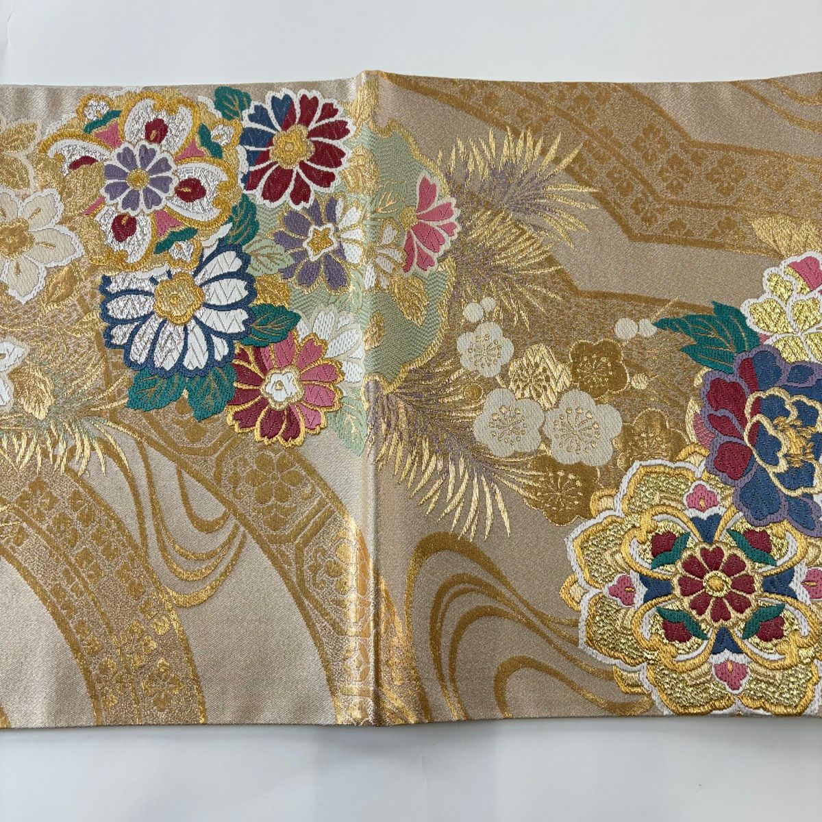 袋帯 秀品 関西仕立て 花丸文 波 金糸 箔 クリーム 六通 正絹