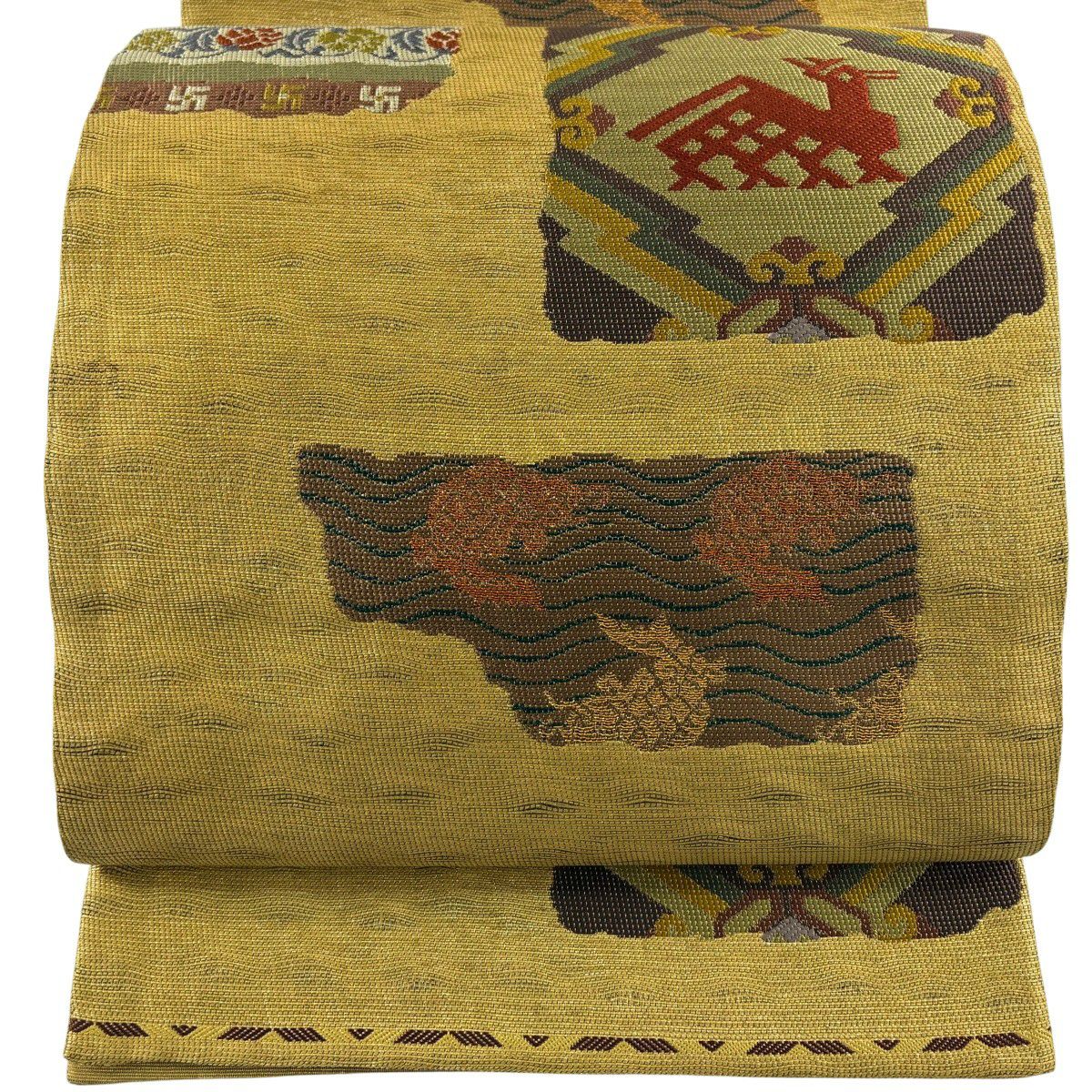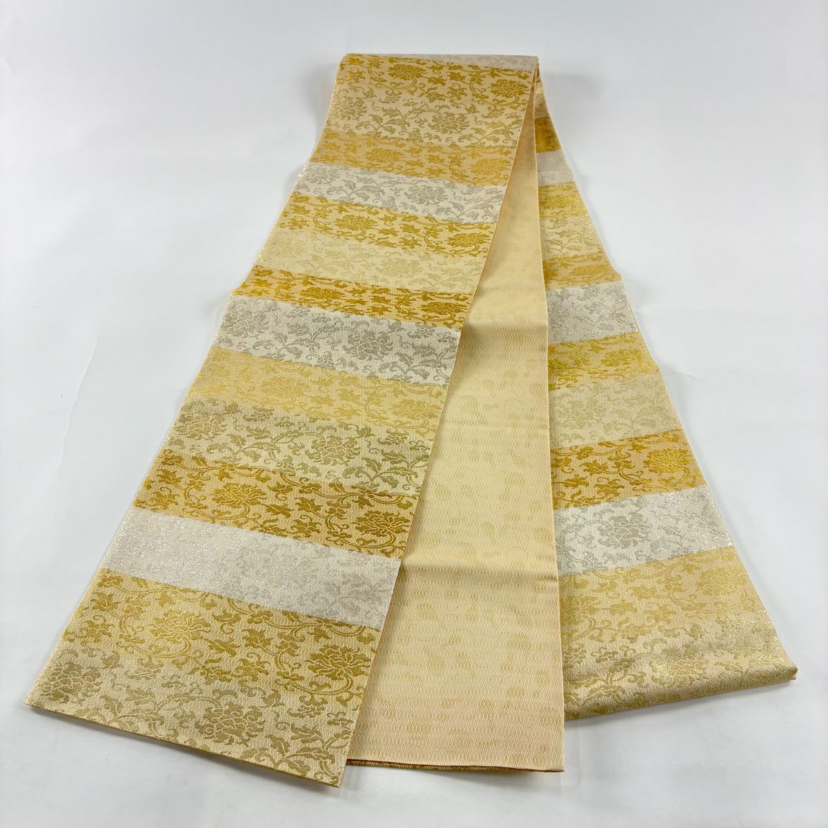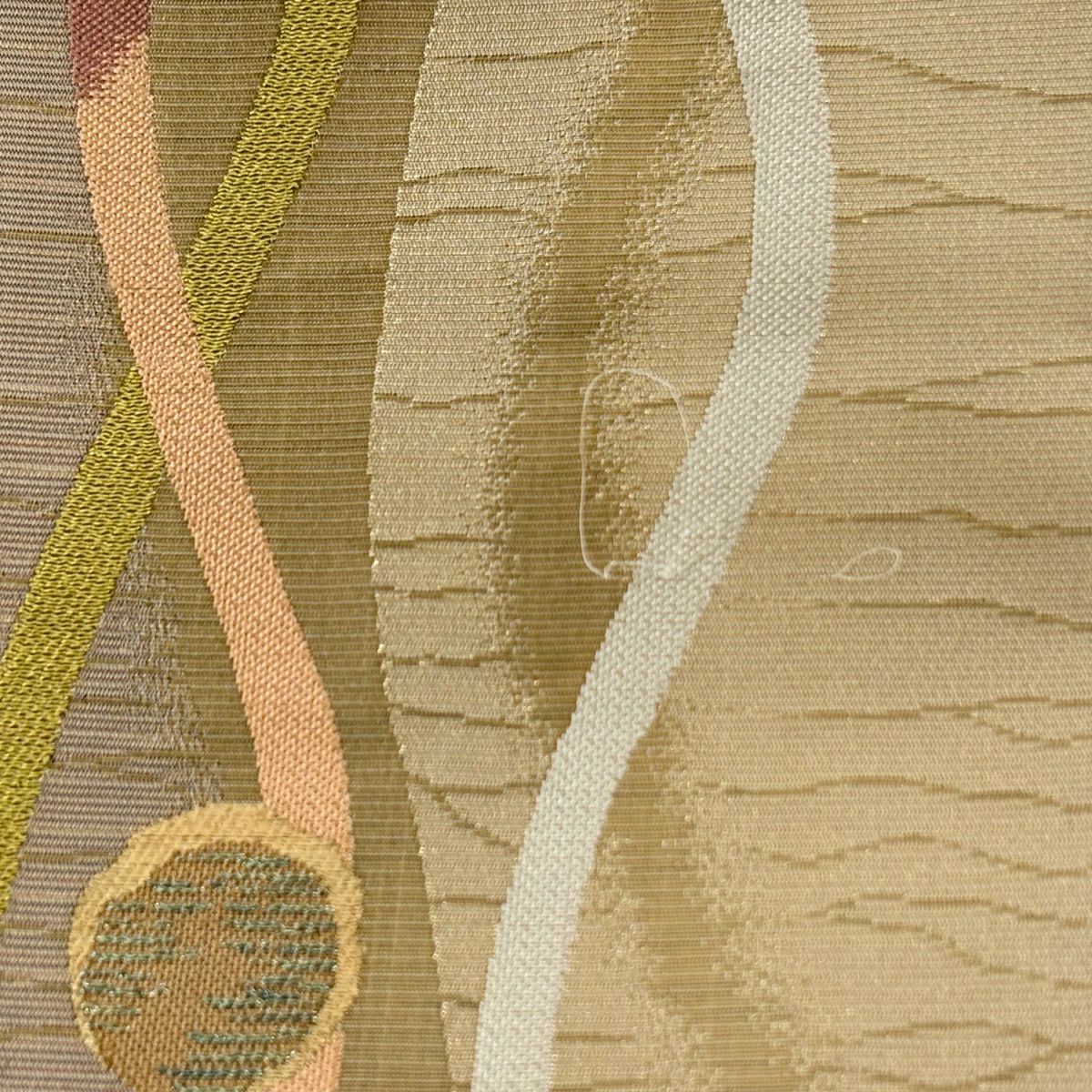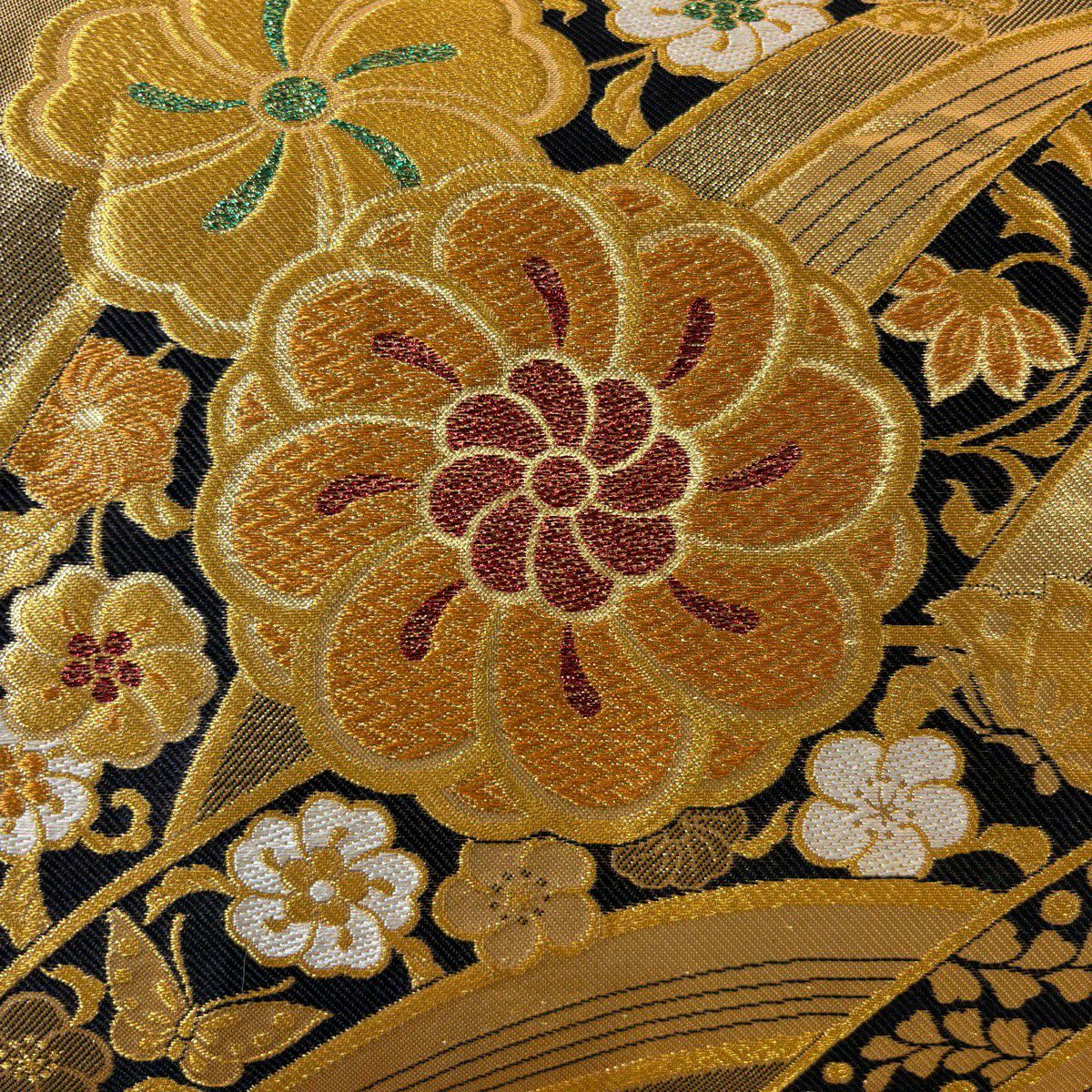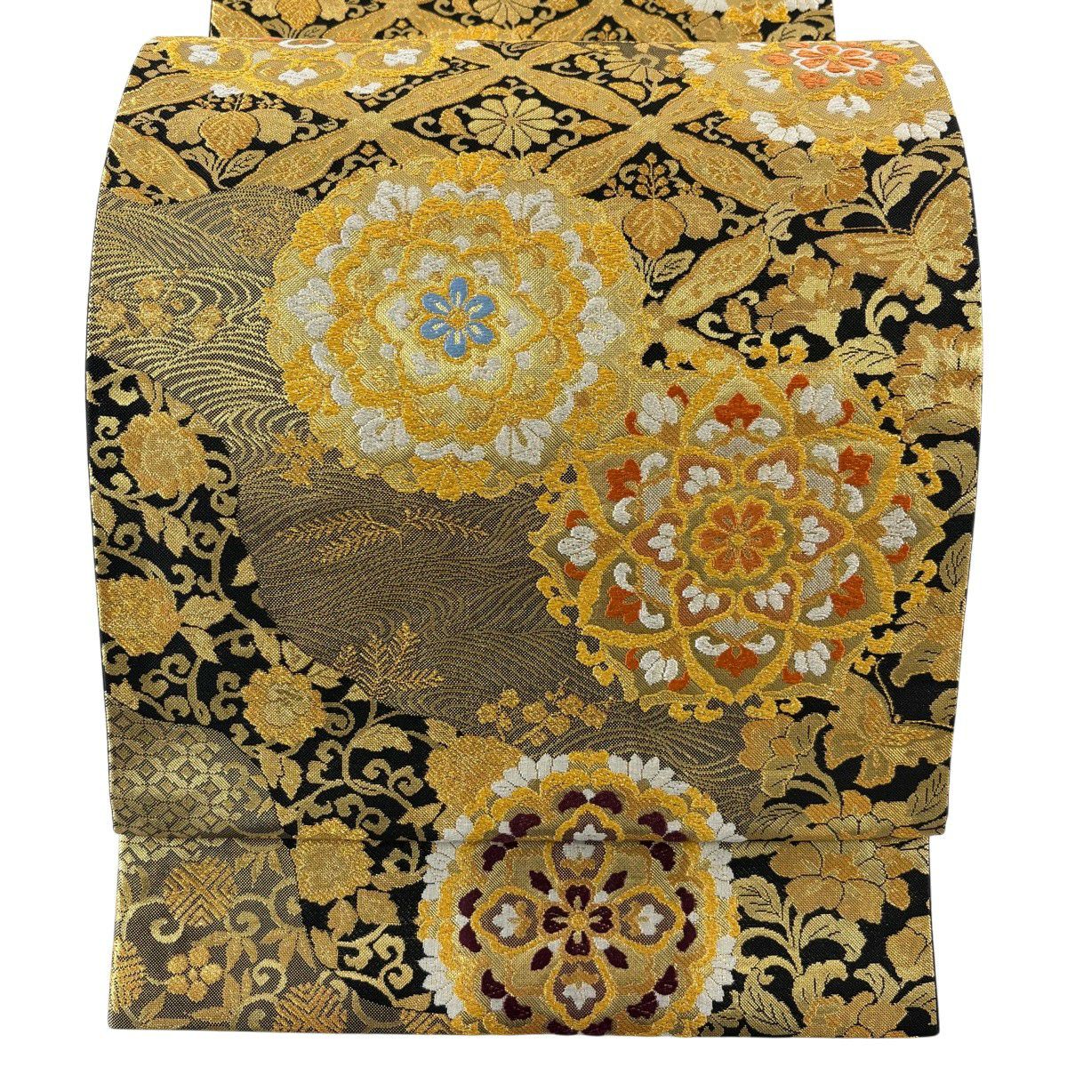 袋帯 秀品 関西仕立て 花丸文 波 金糸 箔 クリーム 六通 正絹