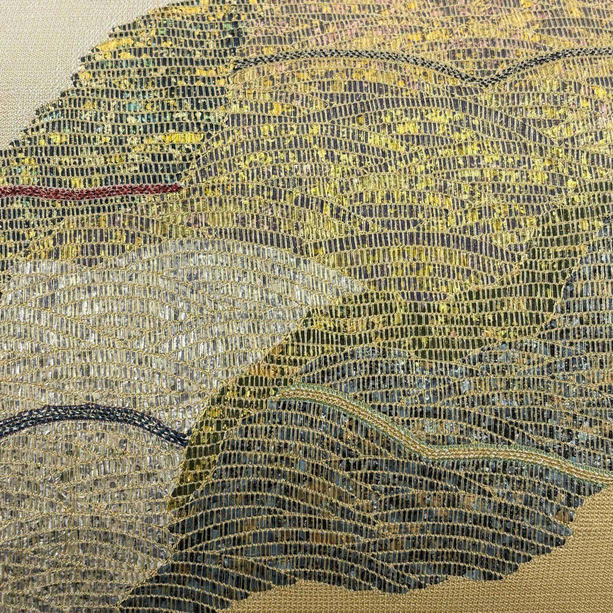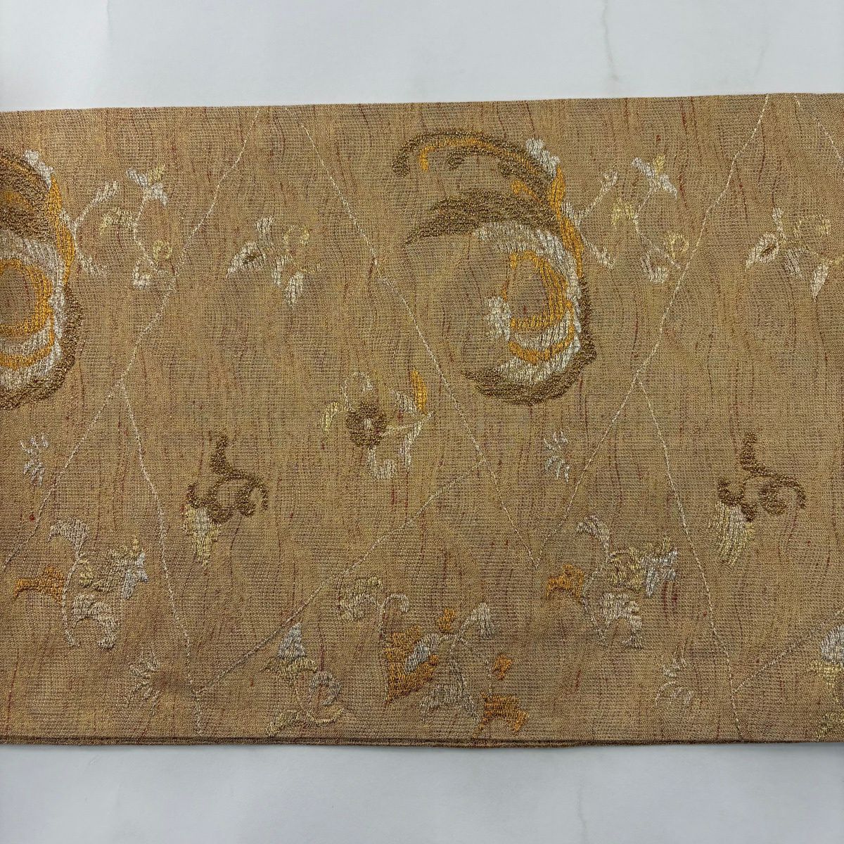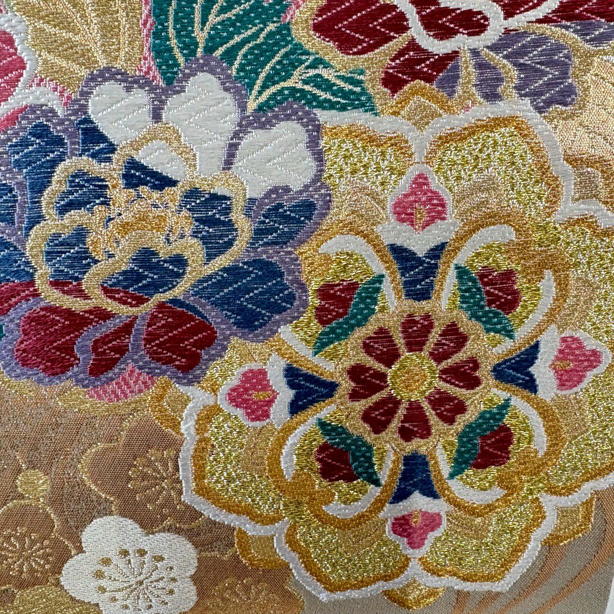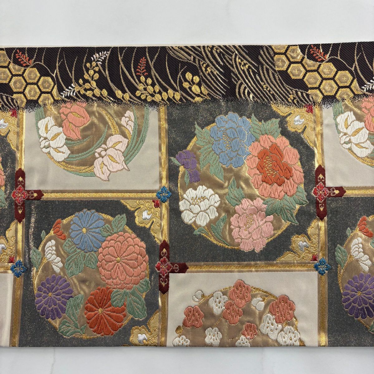 袋帯 秀品 関西仕立て 花丸文 波 金糸 箔 クリーム 六通 正絹