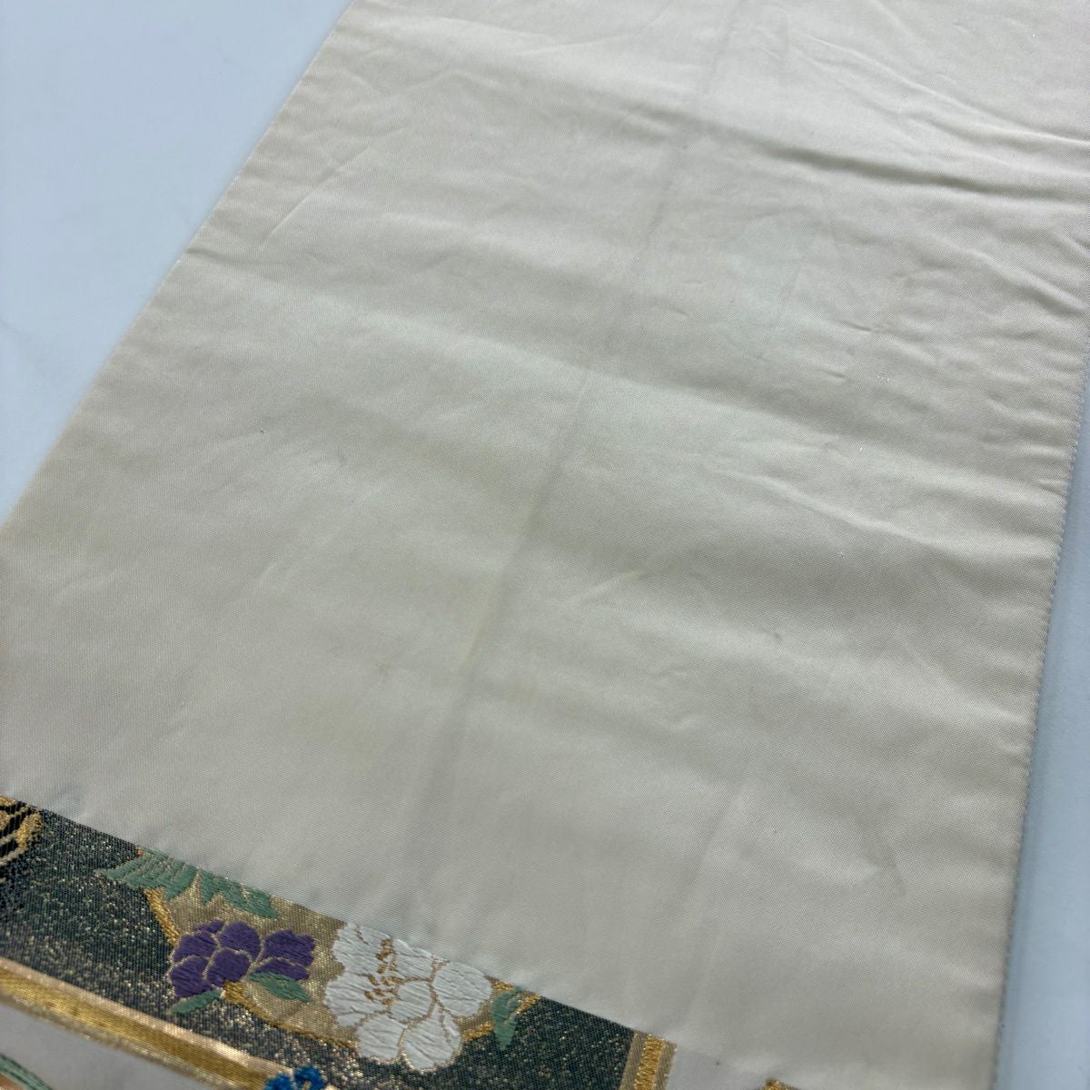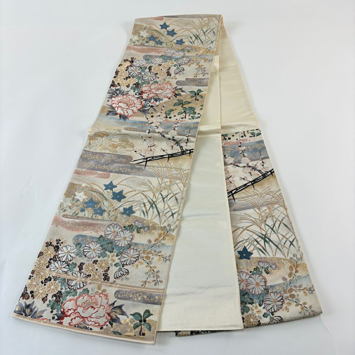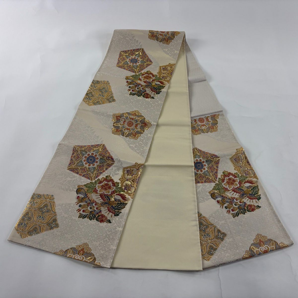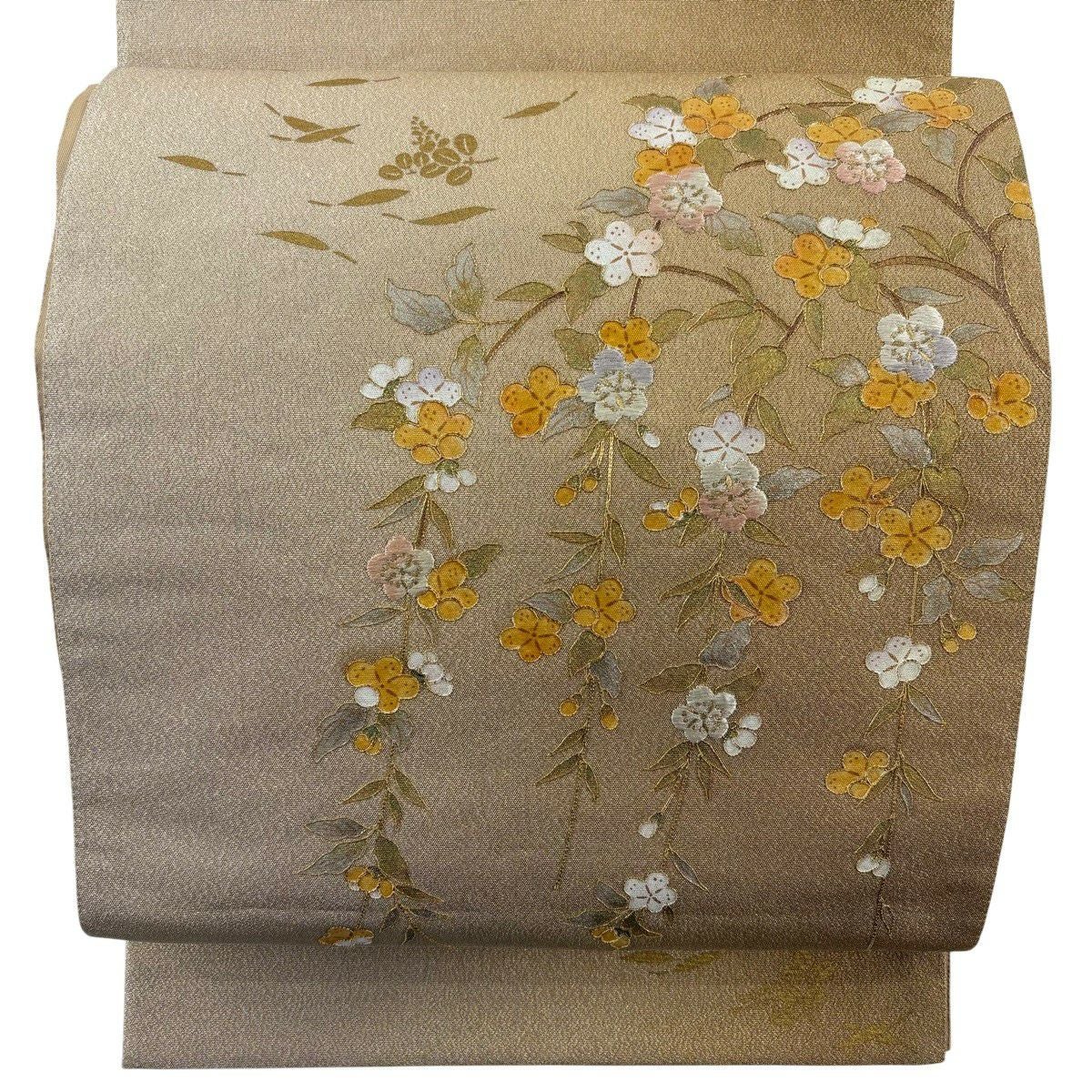 袋帯 秀品 関西仕立て 桧扇 草花 金糸 箔 クリーム 六通 正絹
