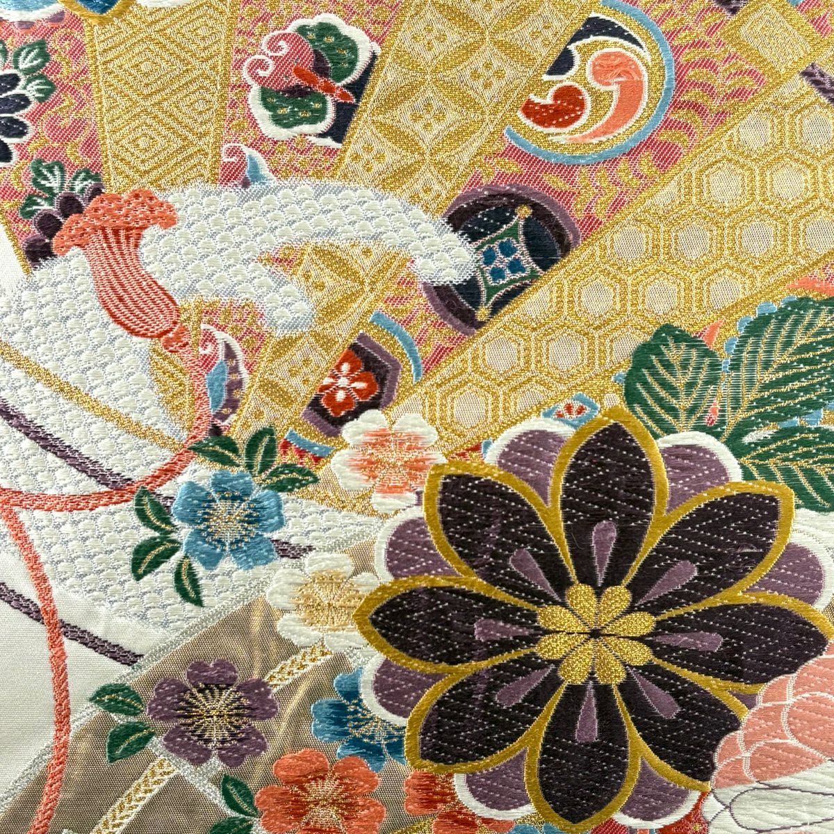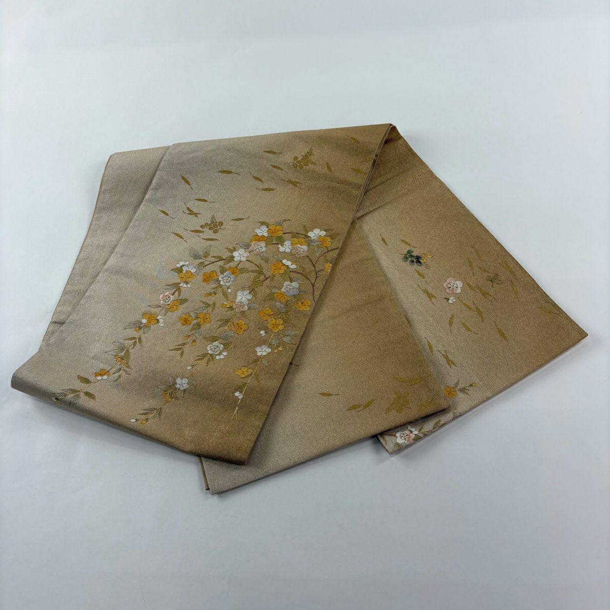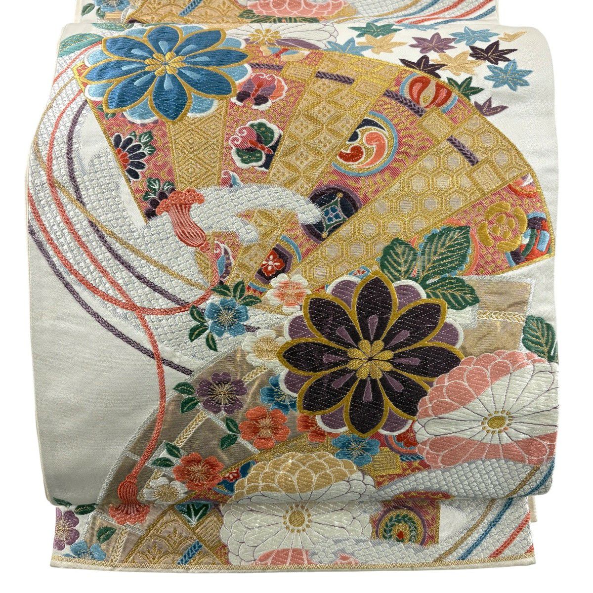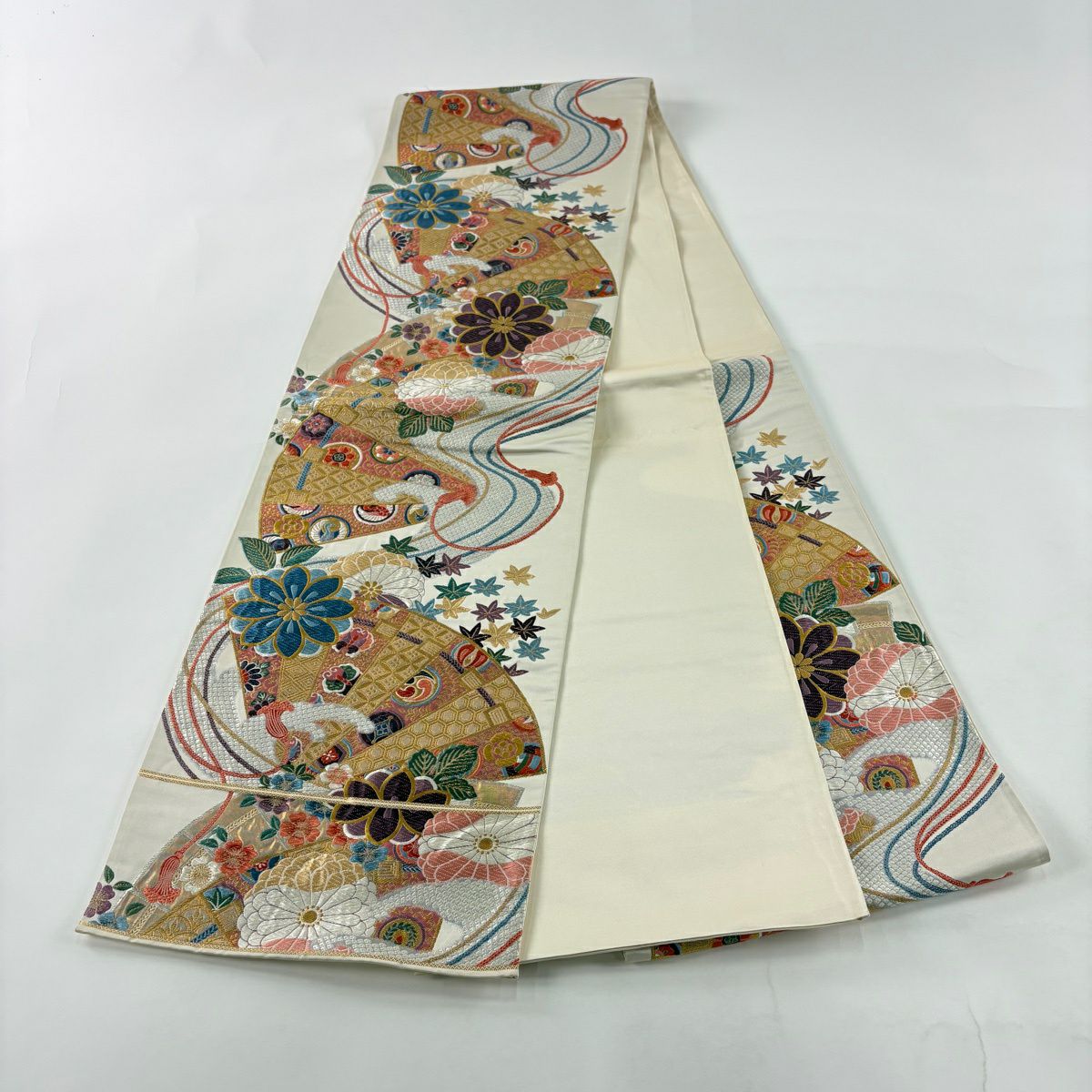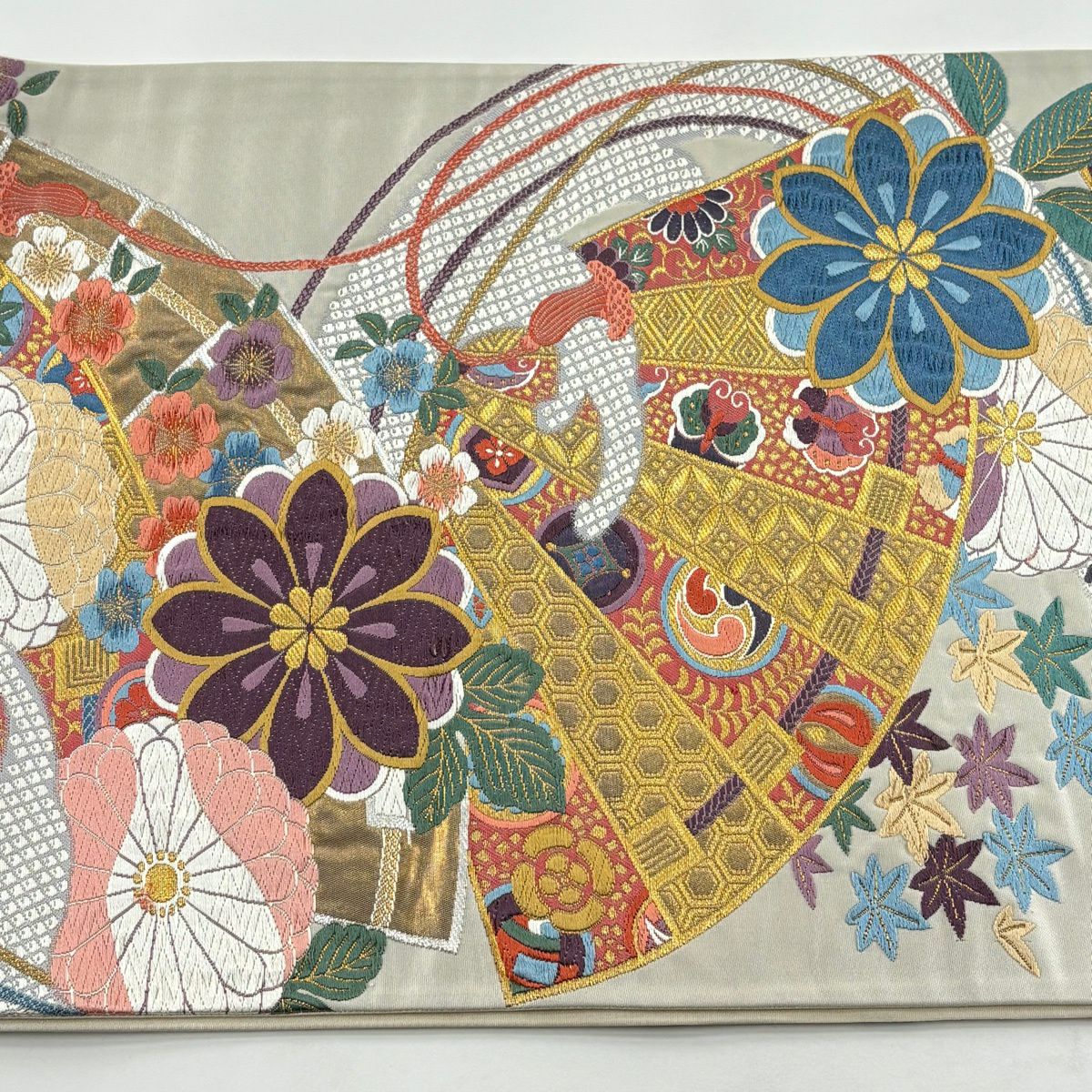 袋帯 秀品 関西仕立て 桧扇 草花 金糸 箔 クリーム 六通 正絹