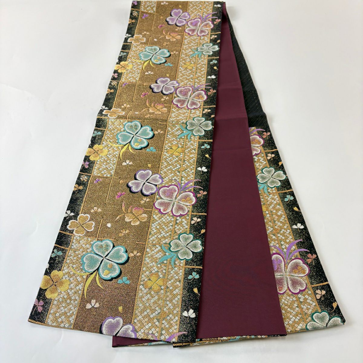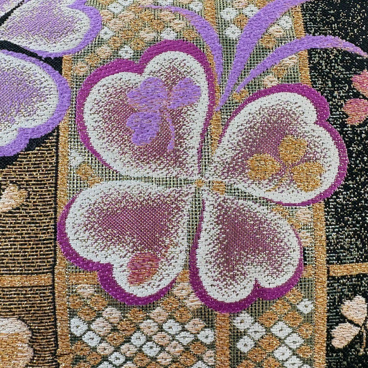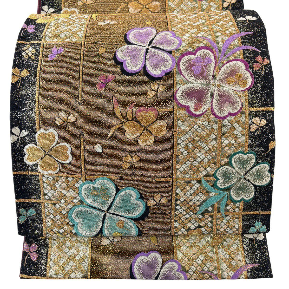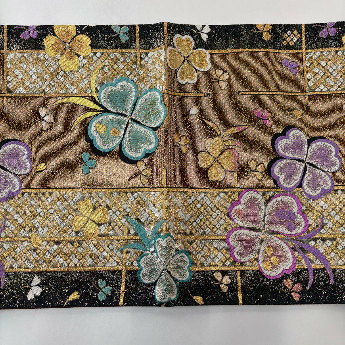 【美品】 袋帯 秀品 クローバー 疋田 金糸 箔 金色 六通 正絹