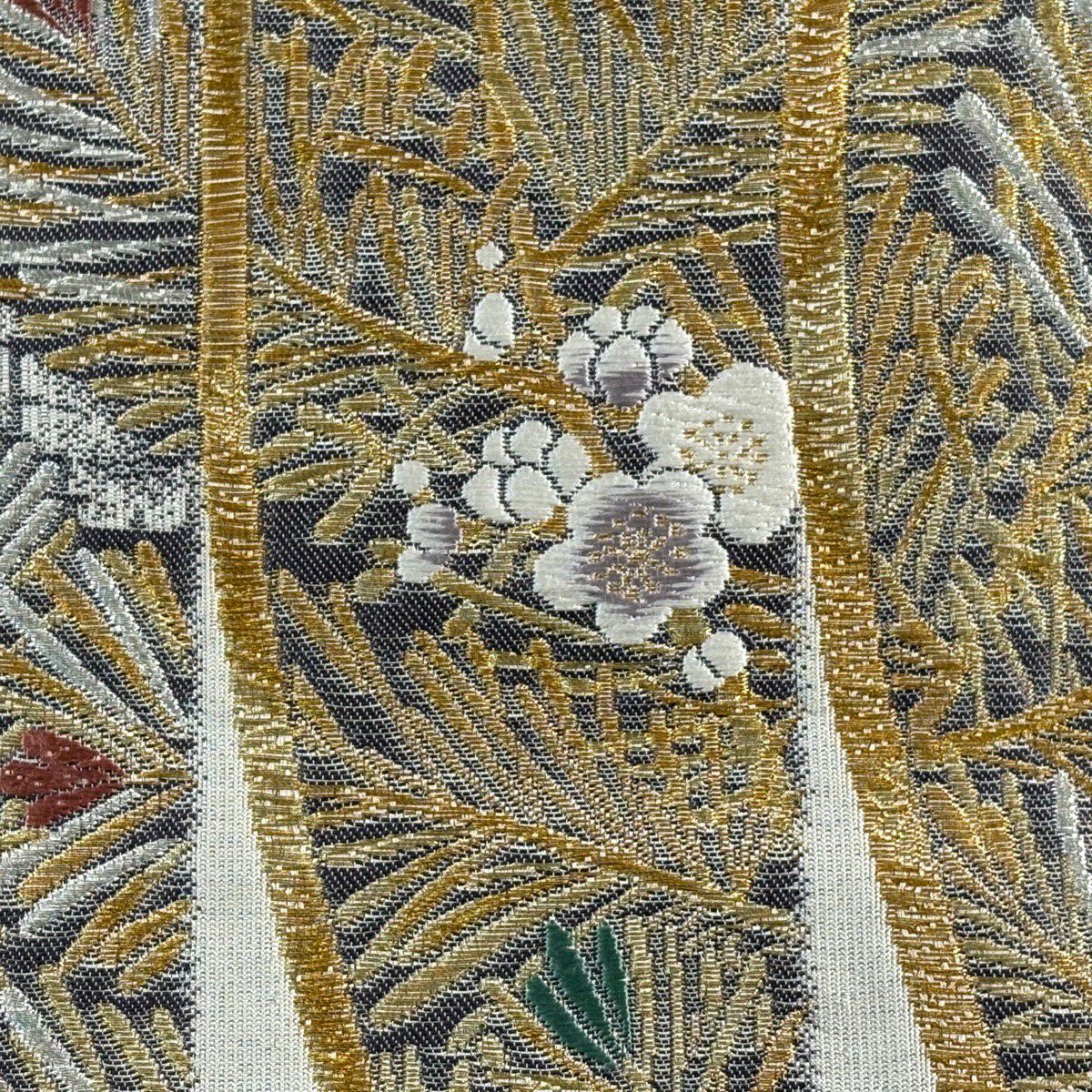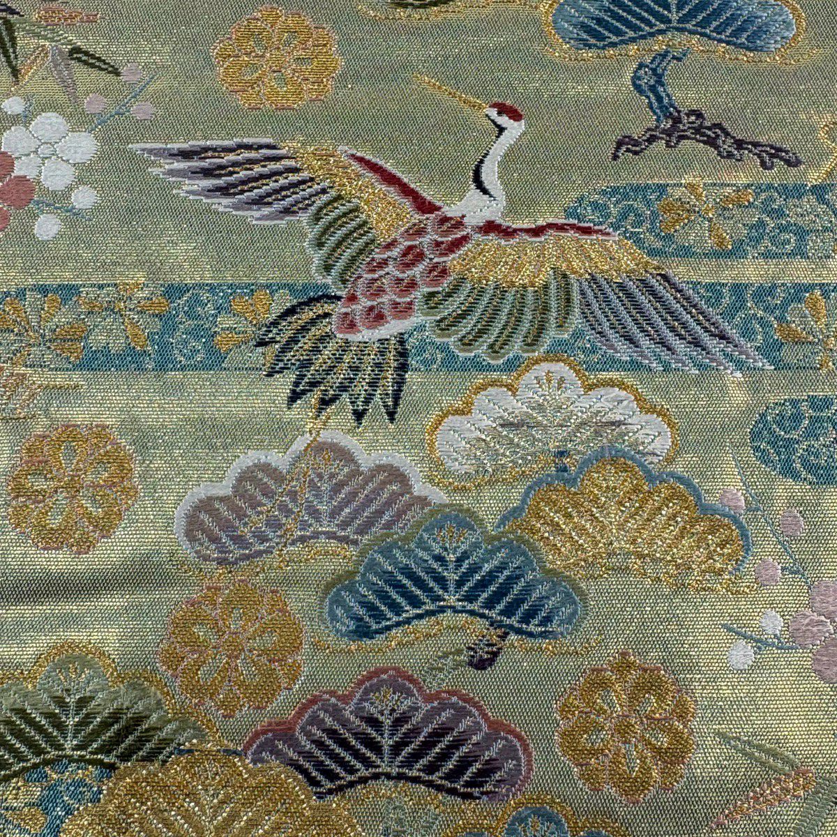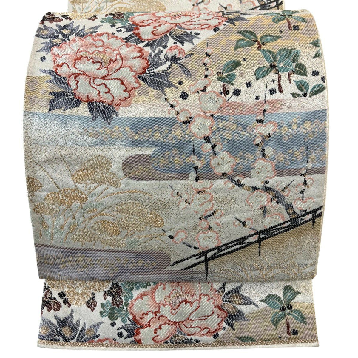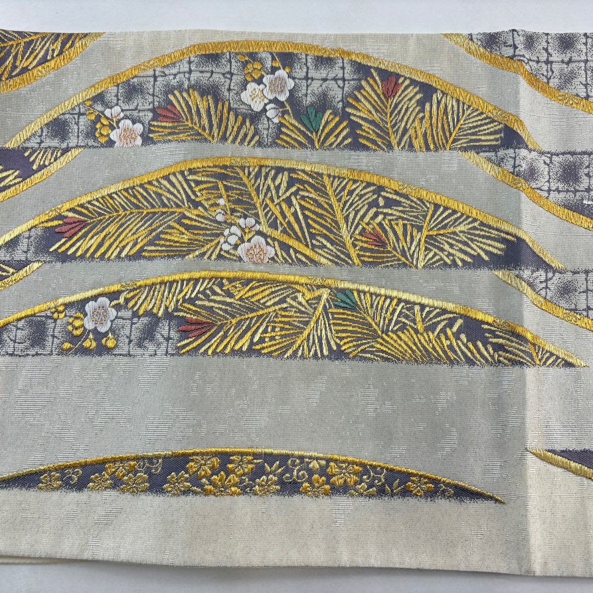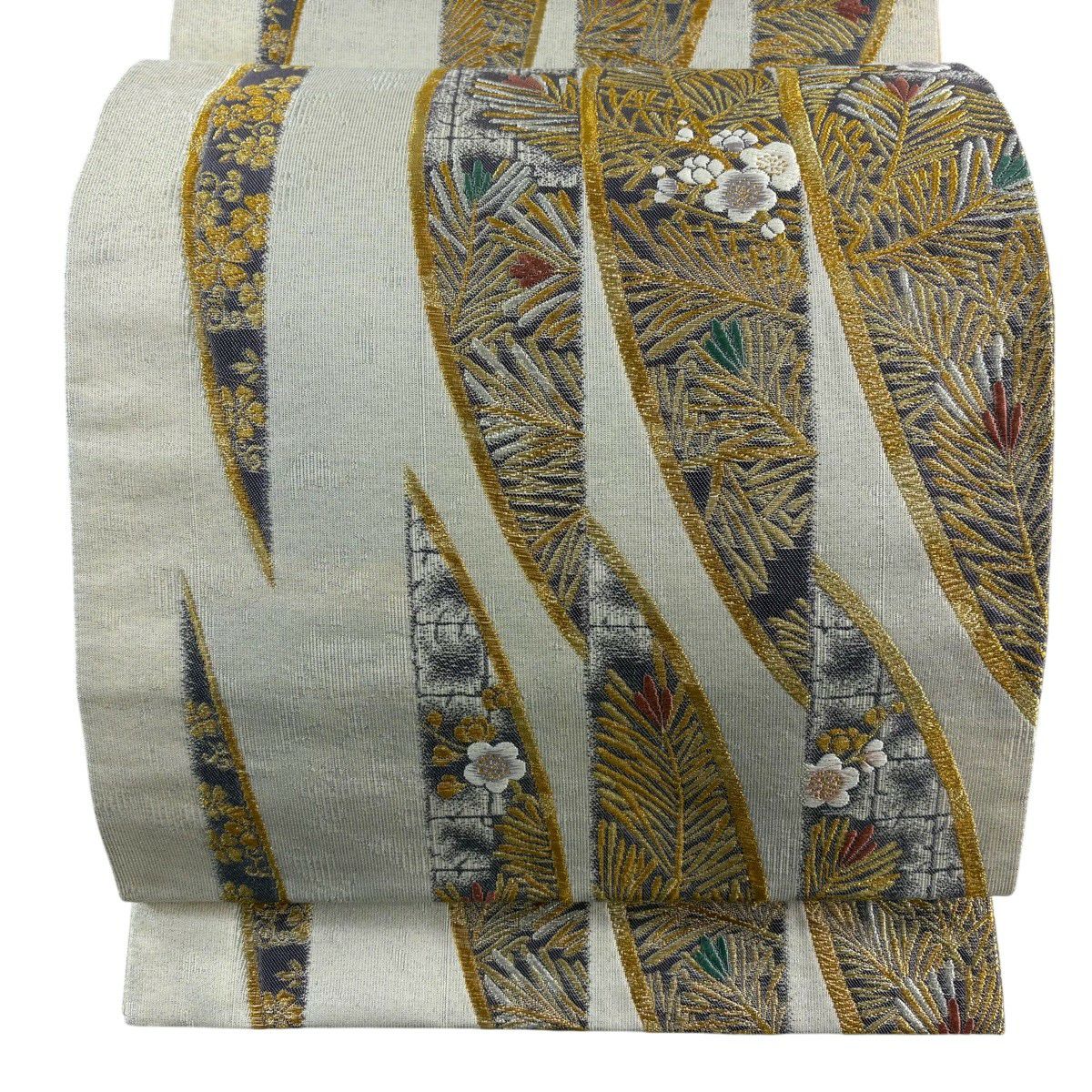 【美品】 袋帯 秀品 若松 梅 金銀糸 刺繍 クリーム 六通 正絹
