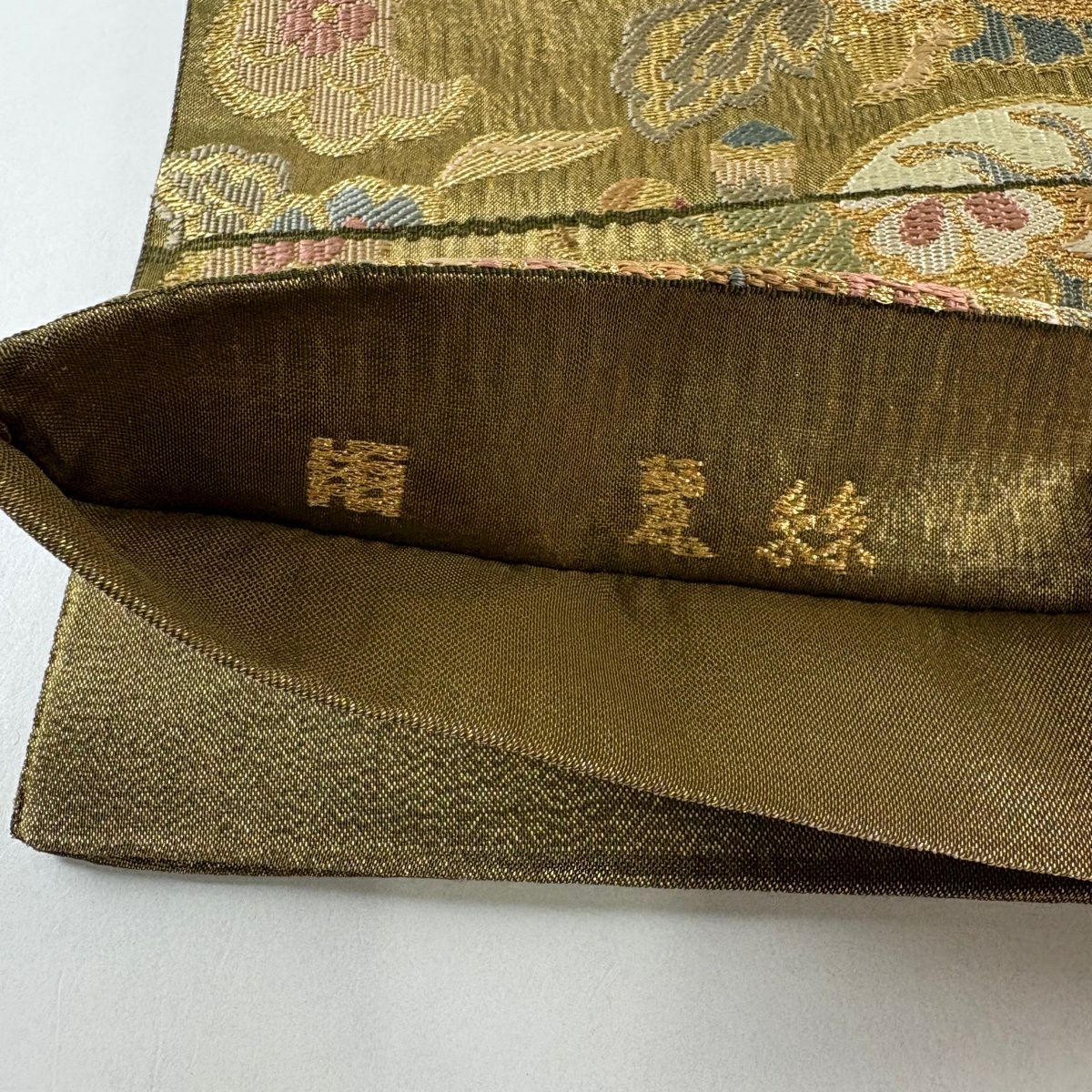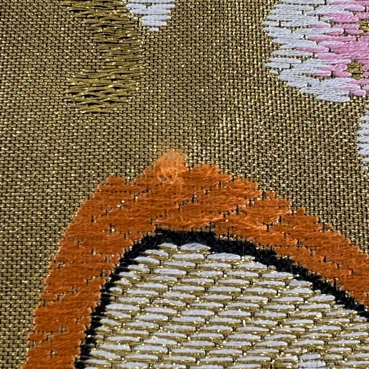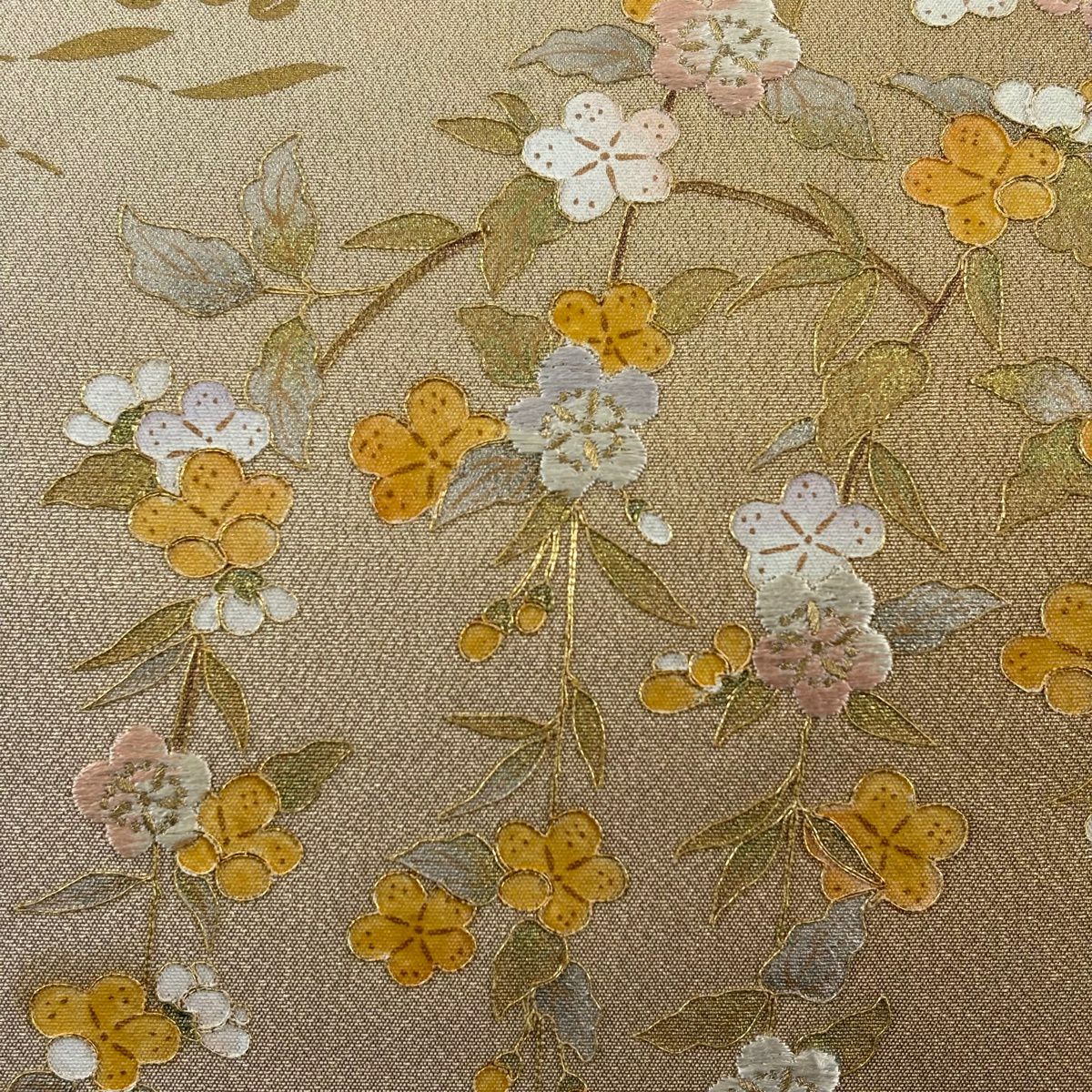 袋帯 秀品 落款あり 関西仕立て 草花 刺繍 金糸 金茶 六通 正絹
