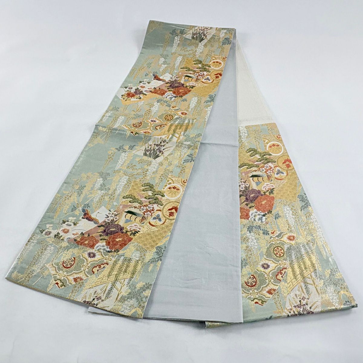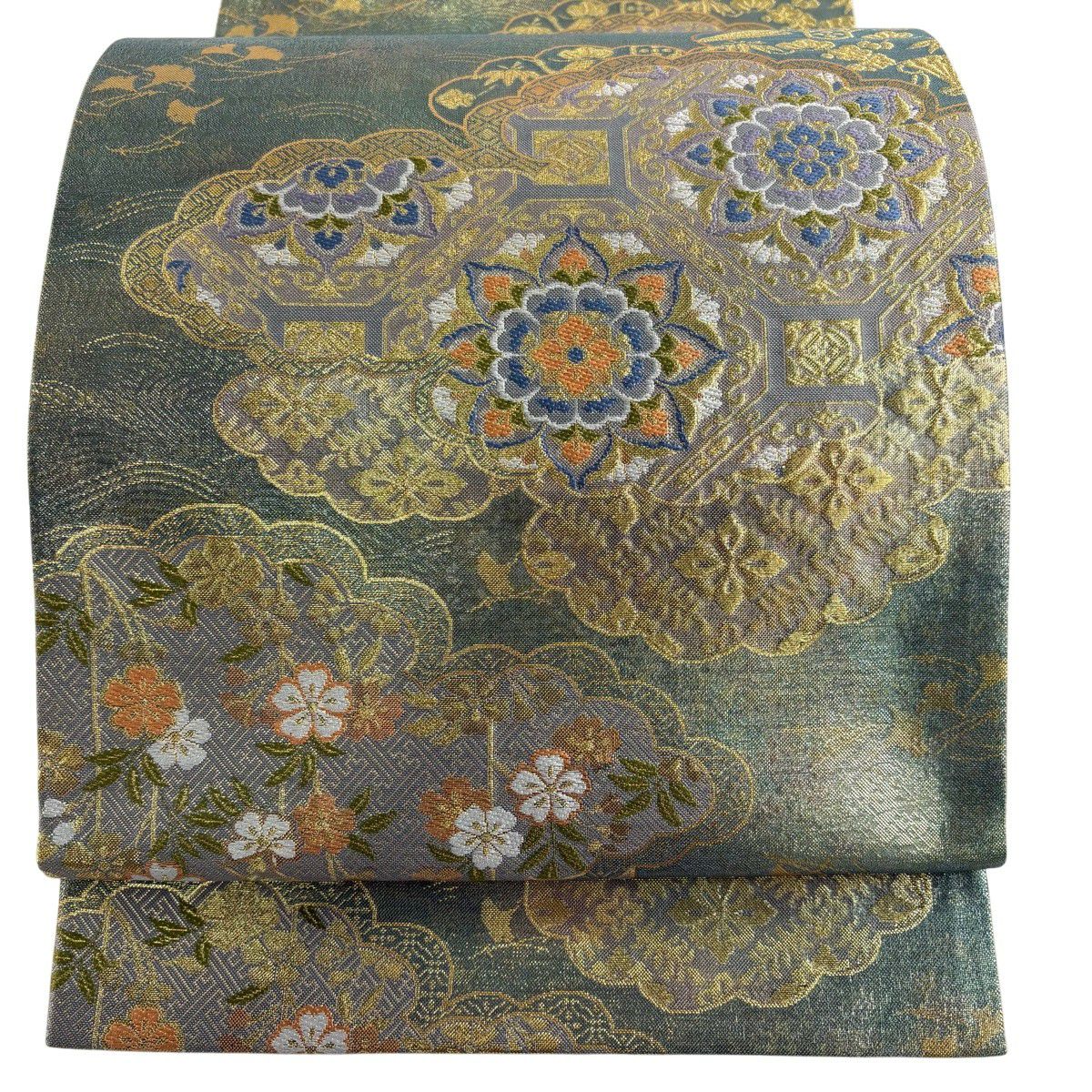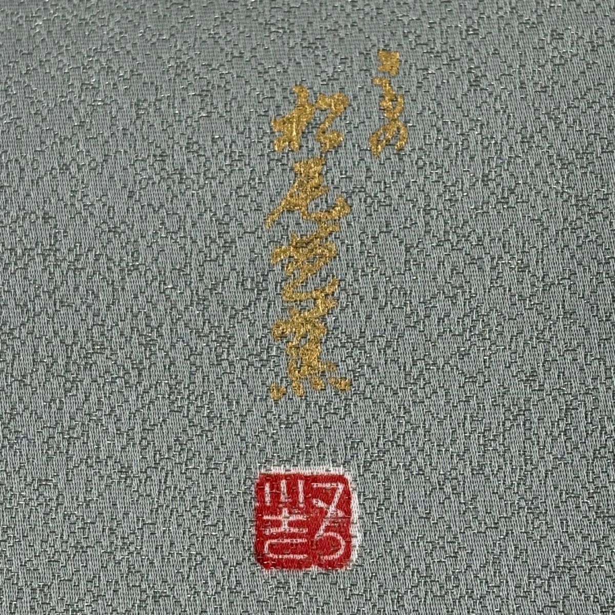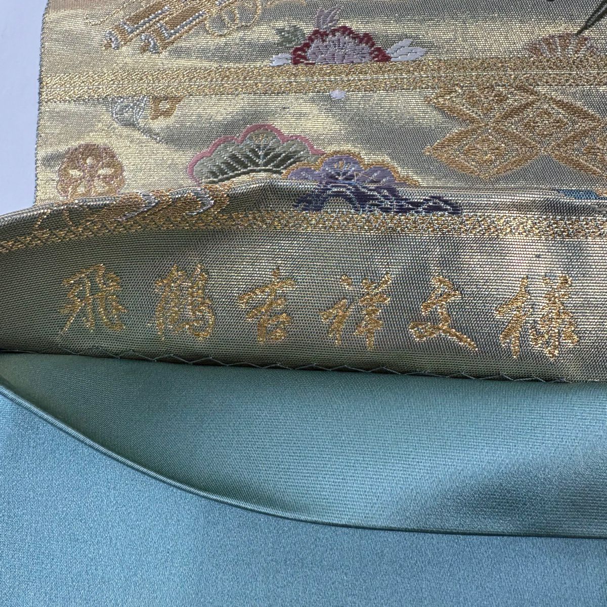 【美品】 袋帯 秀品 蜀江華文 雲文 金糸 刺繍 灰緑 六通 正絹