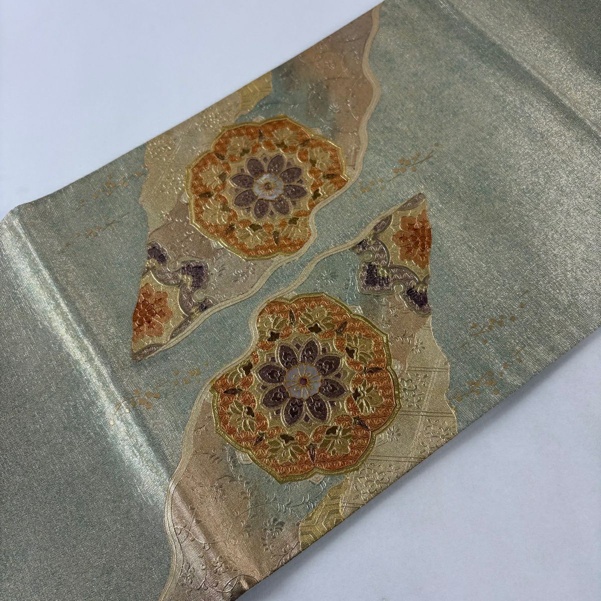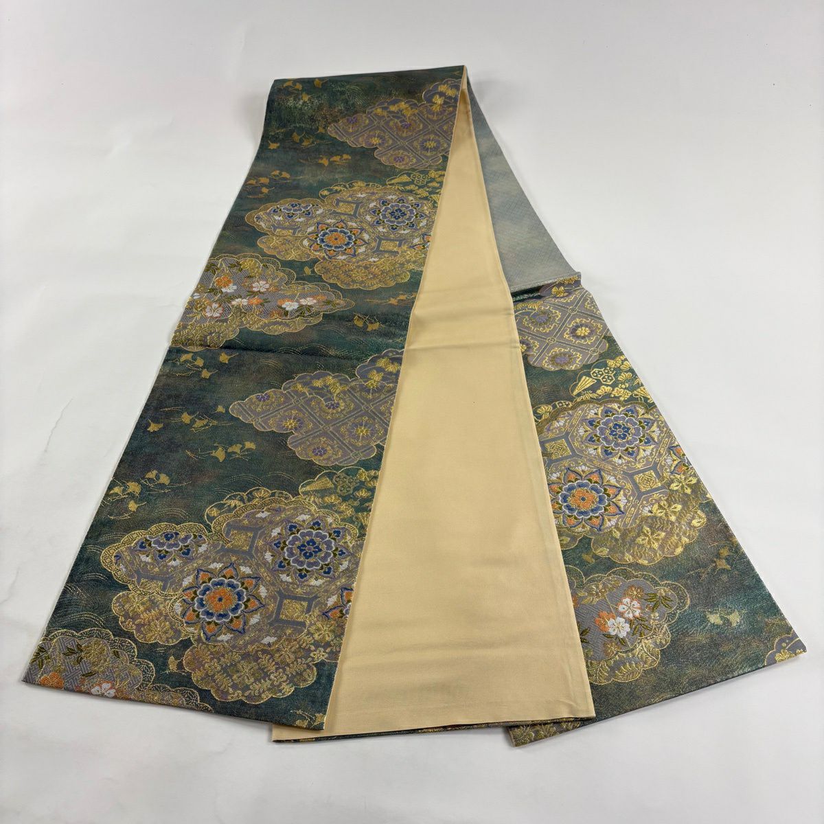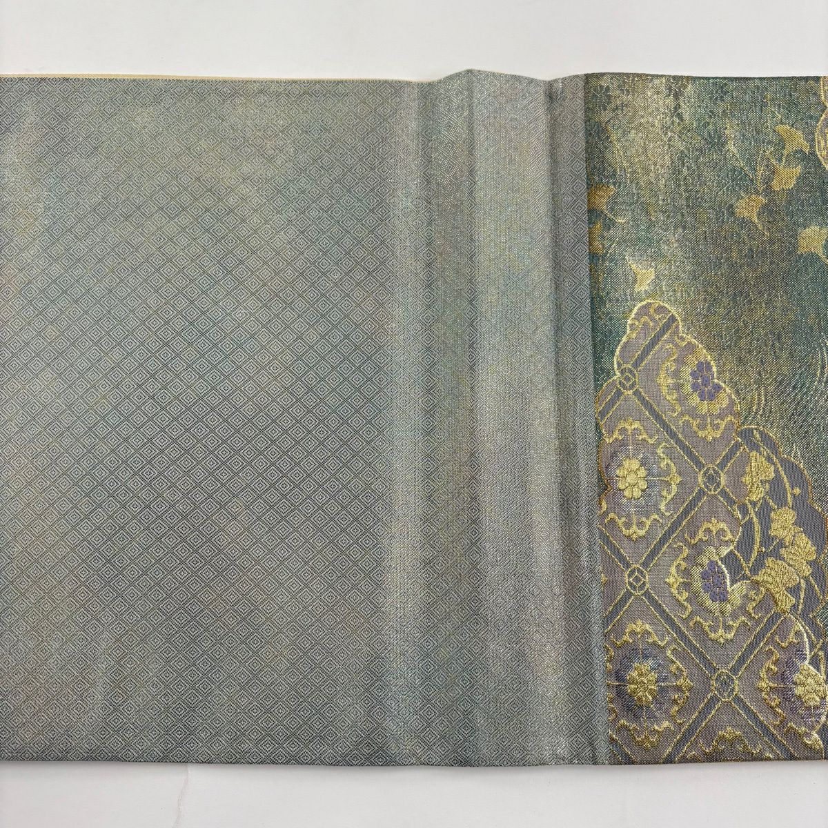 【美品】 袋帯 秀品 蜀江華文 雲文 金糸 刺繍 灰緑 六通 正絹