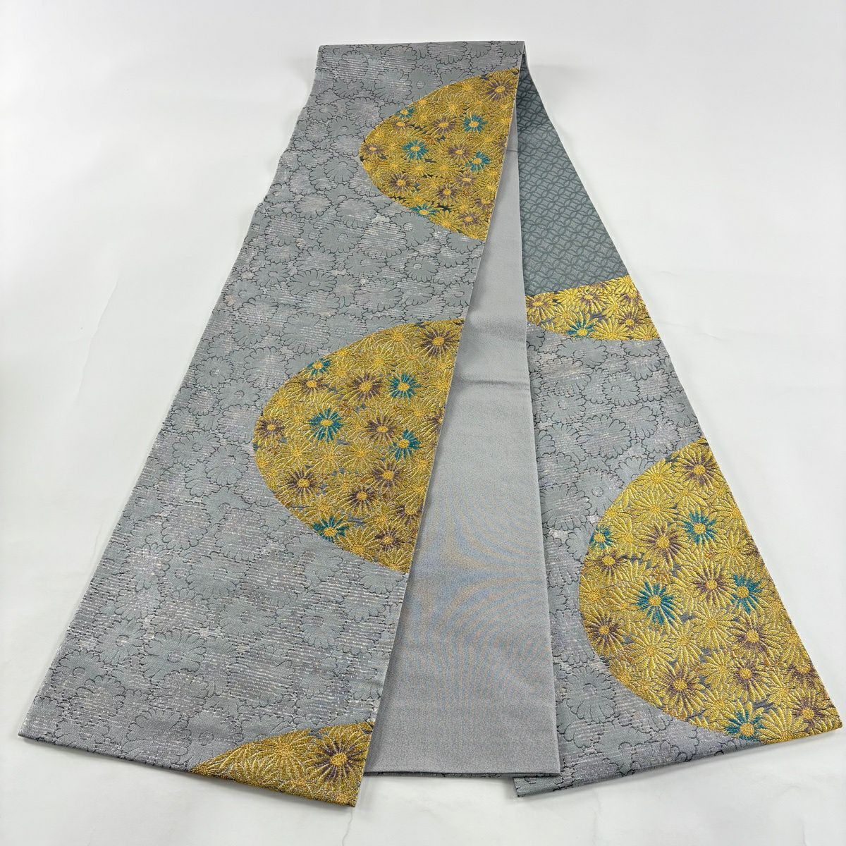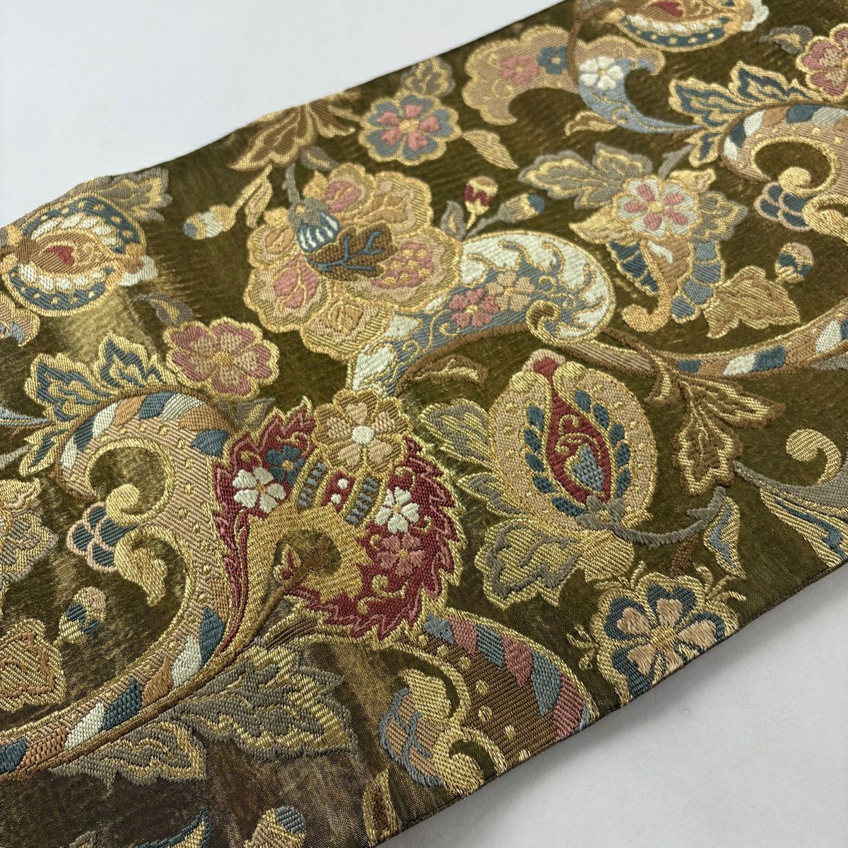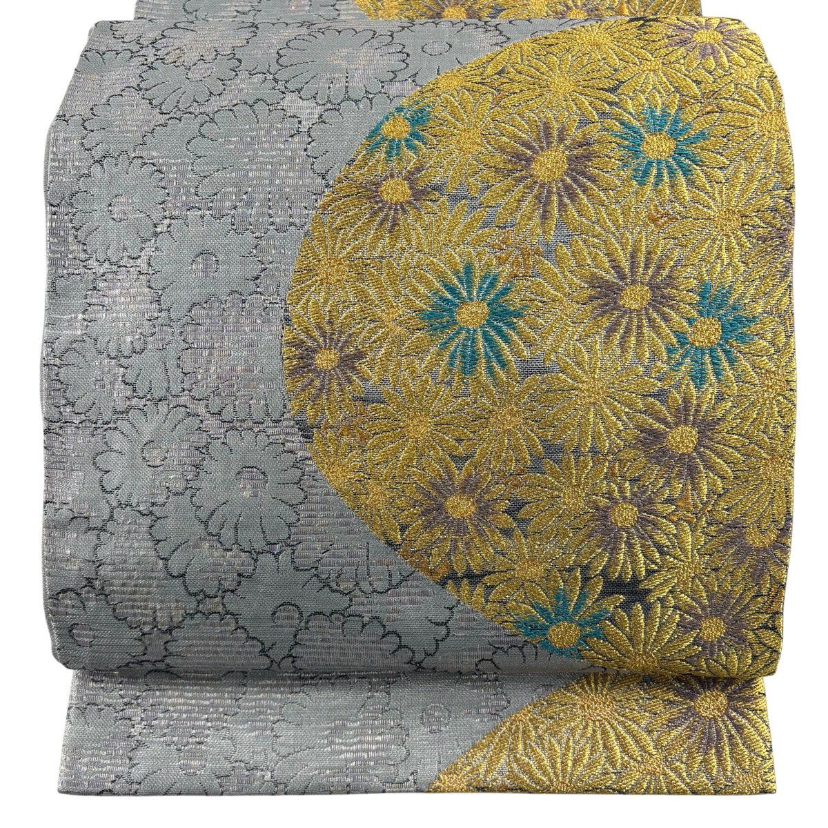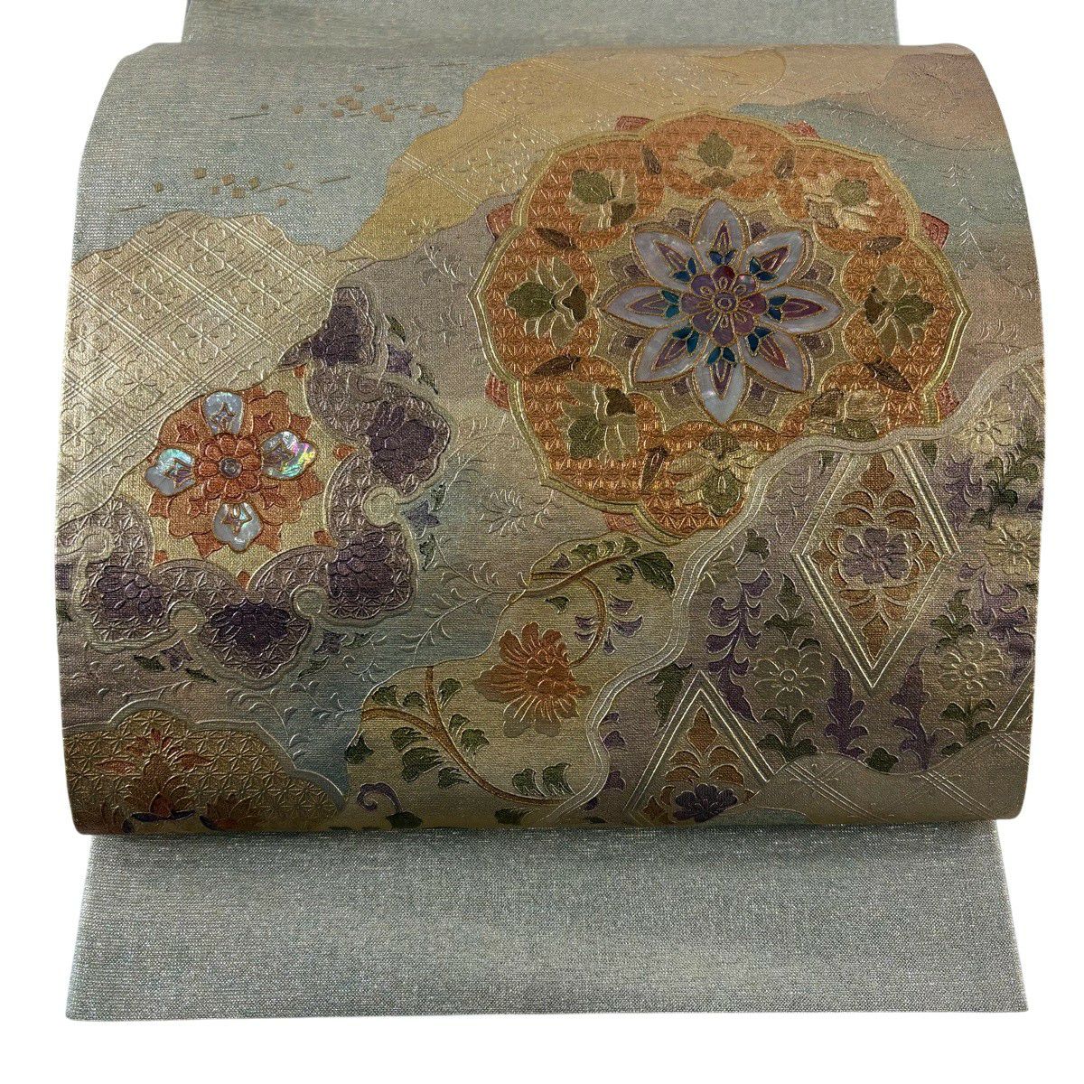 【美品】 袋帯 秀品 蜀江華文 雲文 金糸 刺繍 灰緑 六通 正絹
