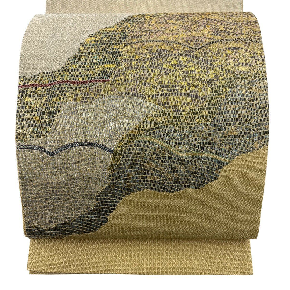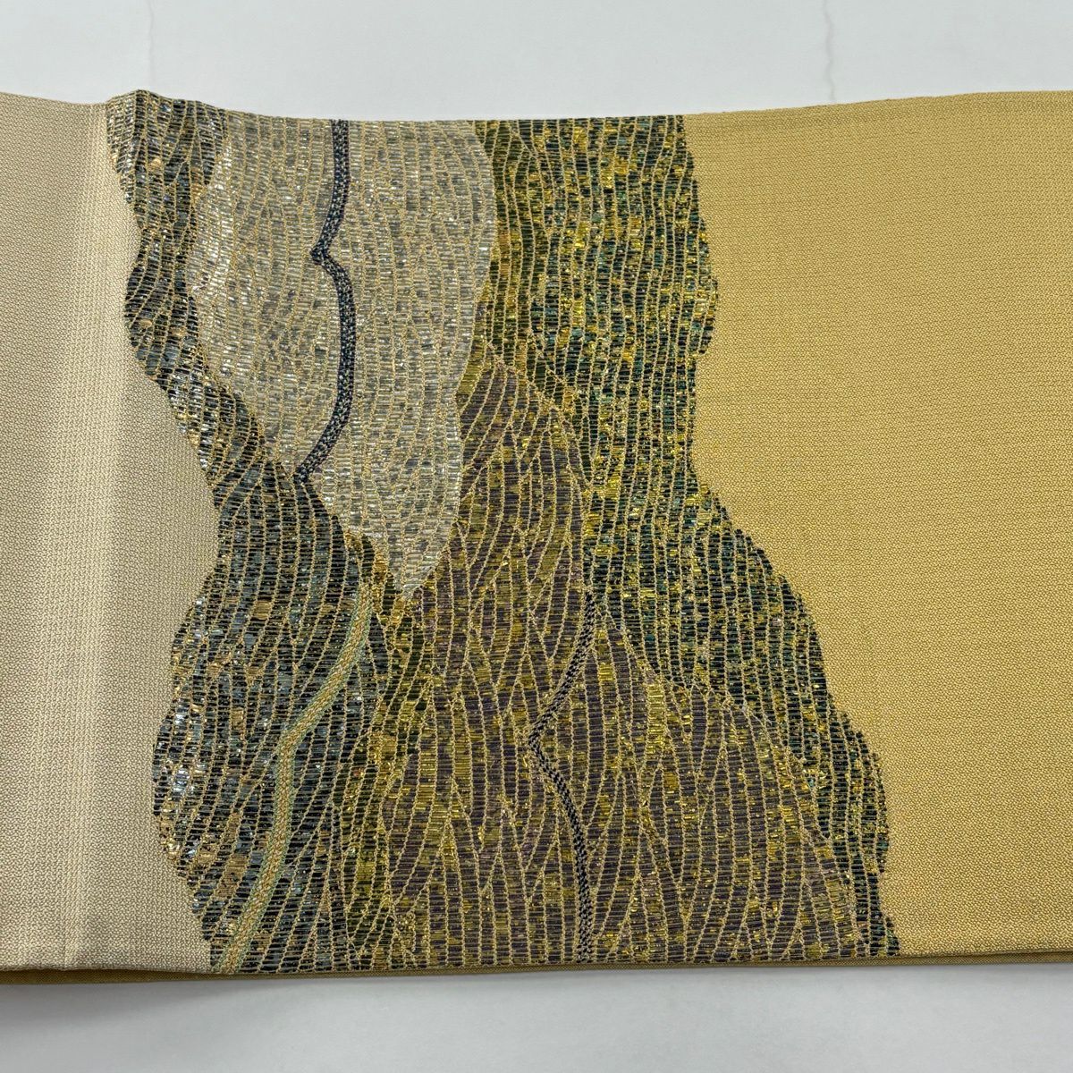 【美品】 袋帯 秀品 波 道長取り 金糸 箔 薄黄 お太鼓柄 正絹