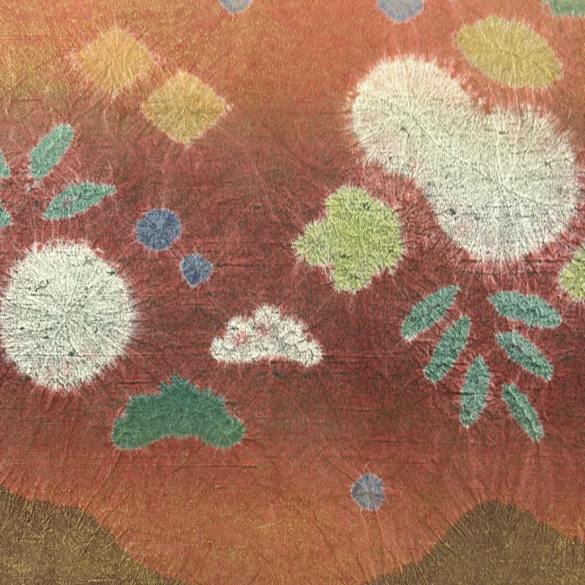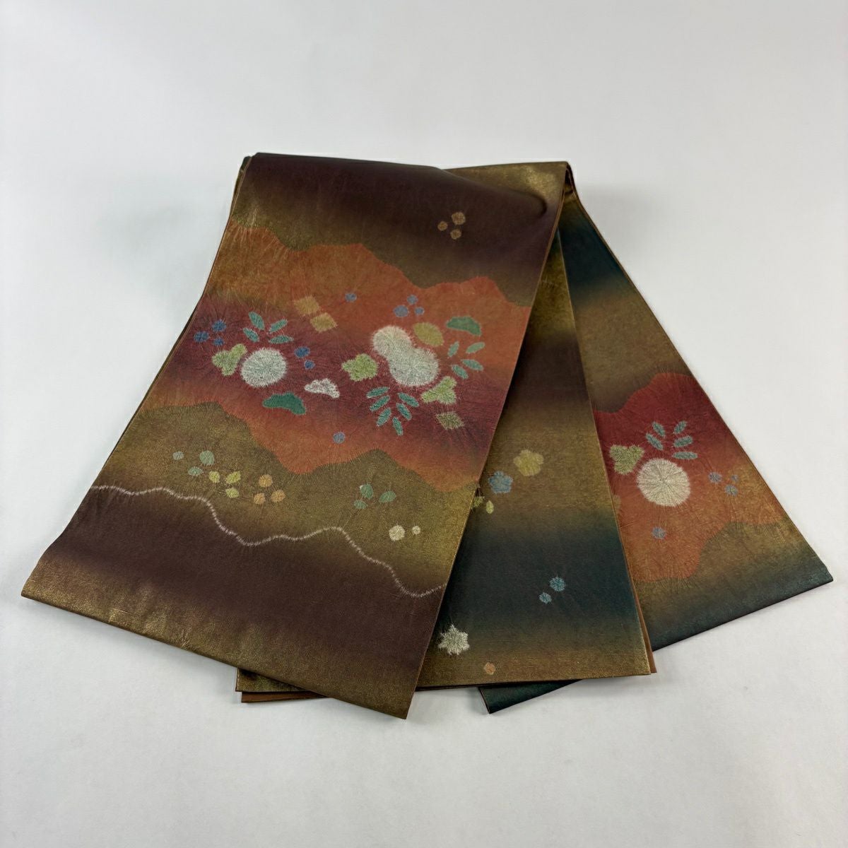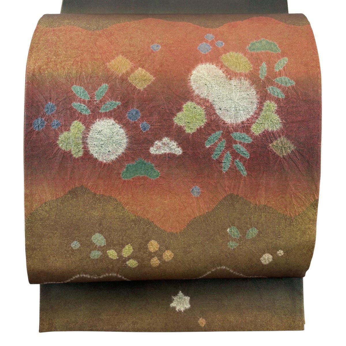 【美品】 袋帯 秀品 扇面 草花 絞り 銀糸 茶色 お太鼓柄 正絹