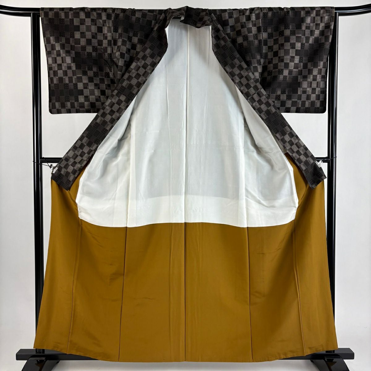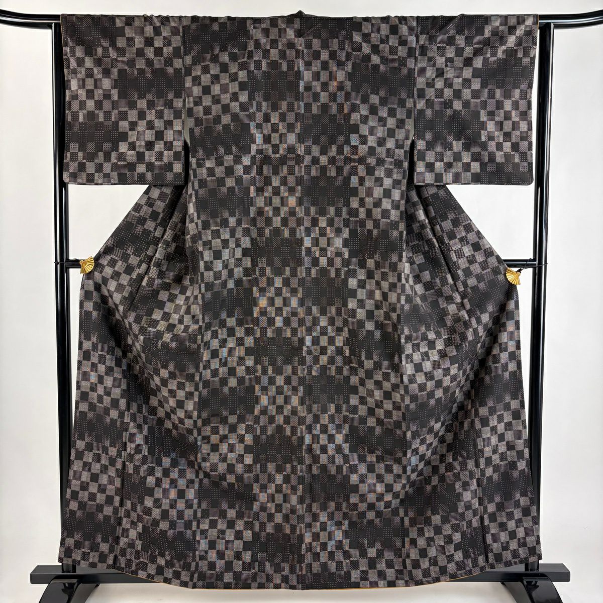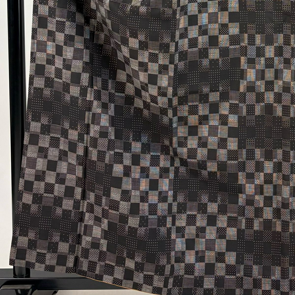 紬 身丈161cm 裄丈64.5cm M 袷 市松 墨色 正絹 秀品