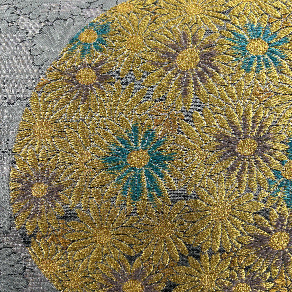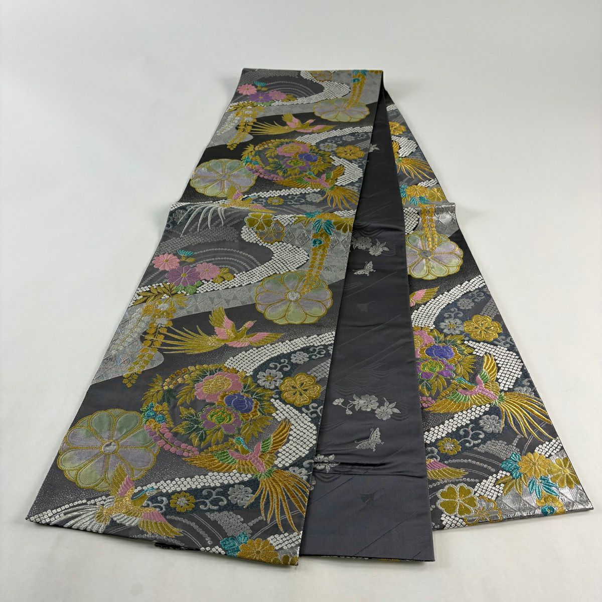 【美品】 袋帯 秀品 花丸文 尾長鳥 金銀糸 箔 灰色 全通 正絹