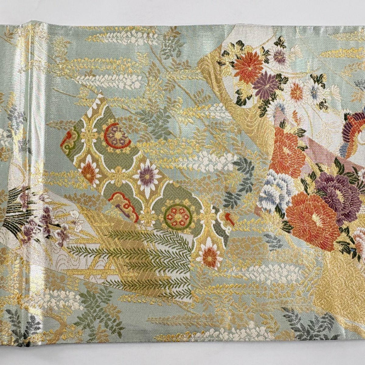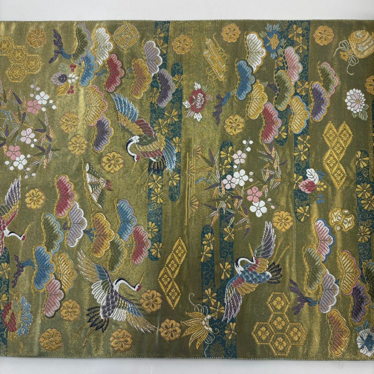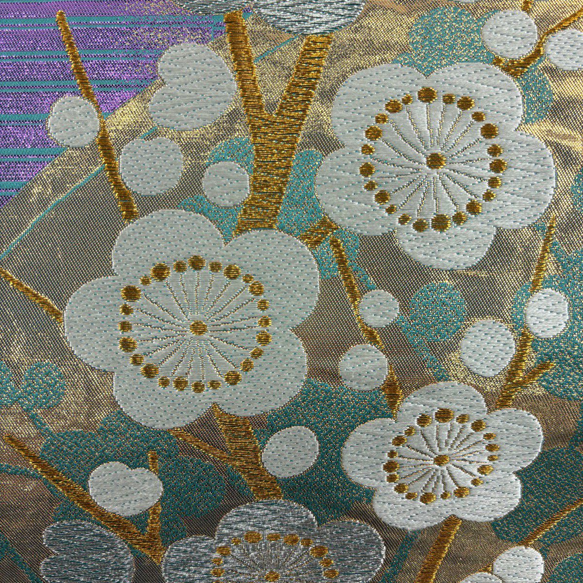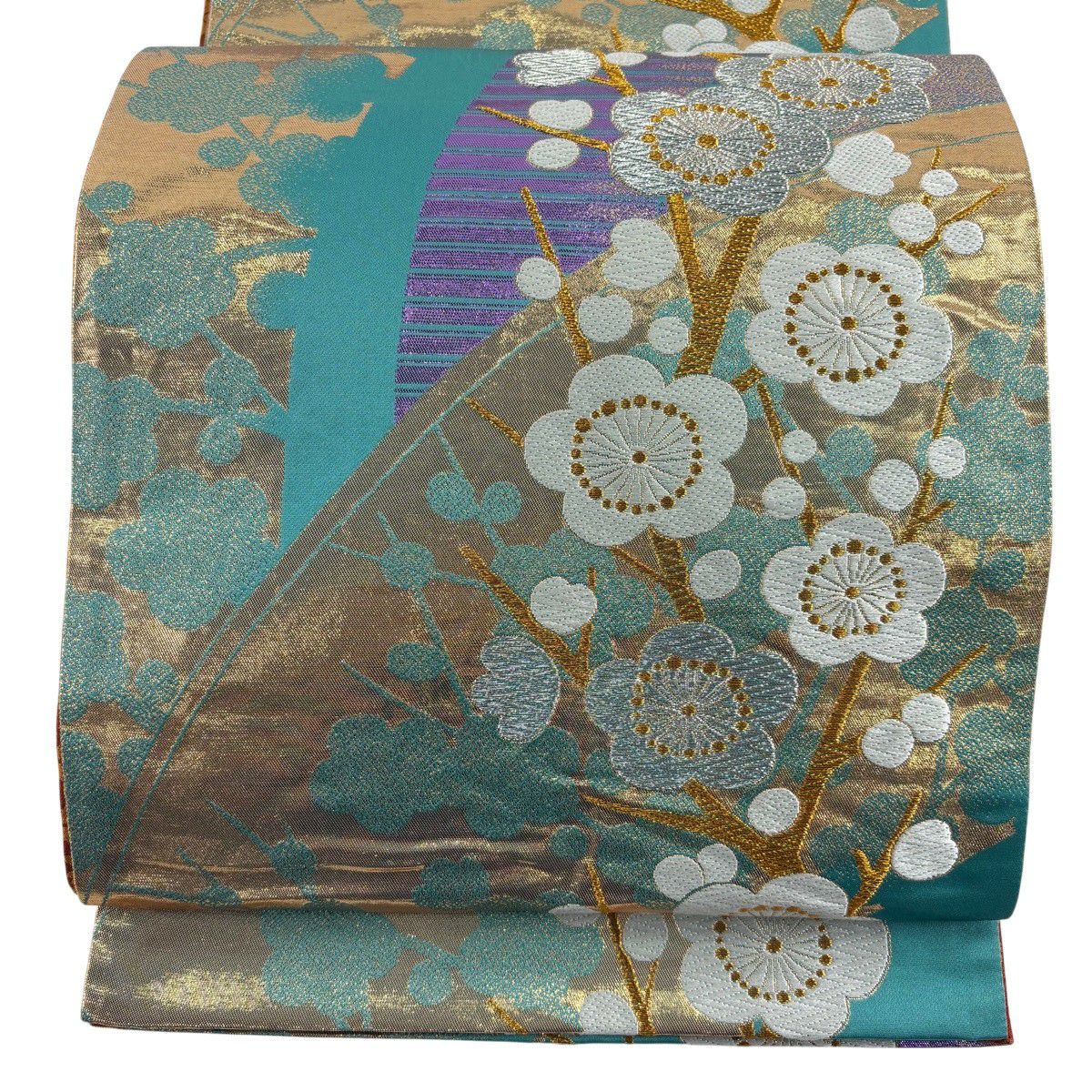 【美品】 袋帯 秀品 振袖向き 枝梅 金銀糸 箔 青緑 六通 正絹