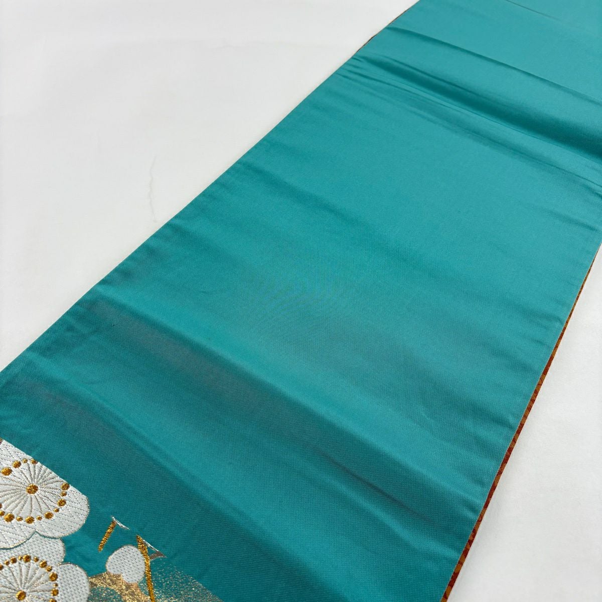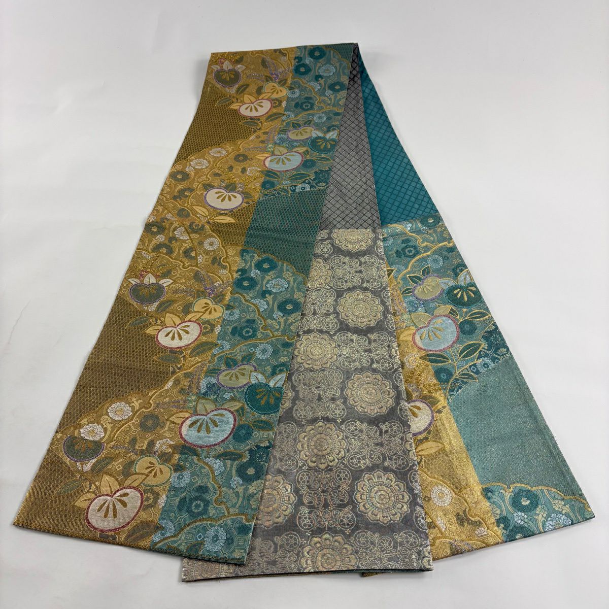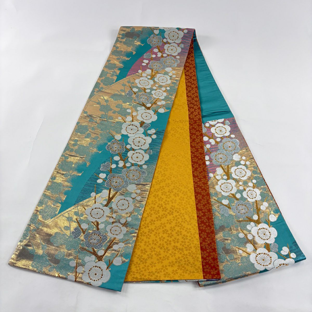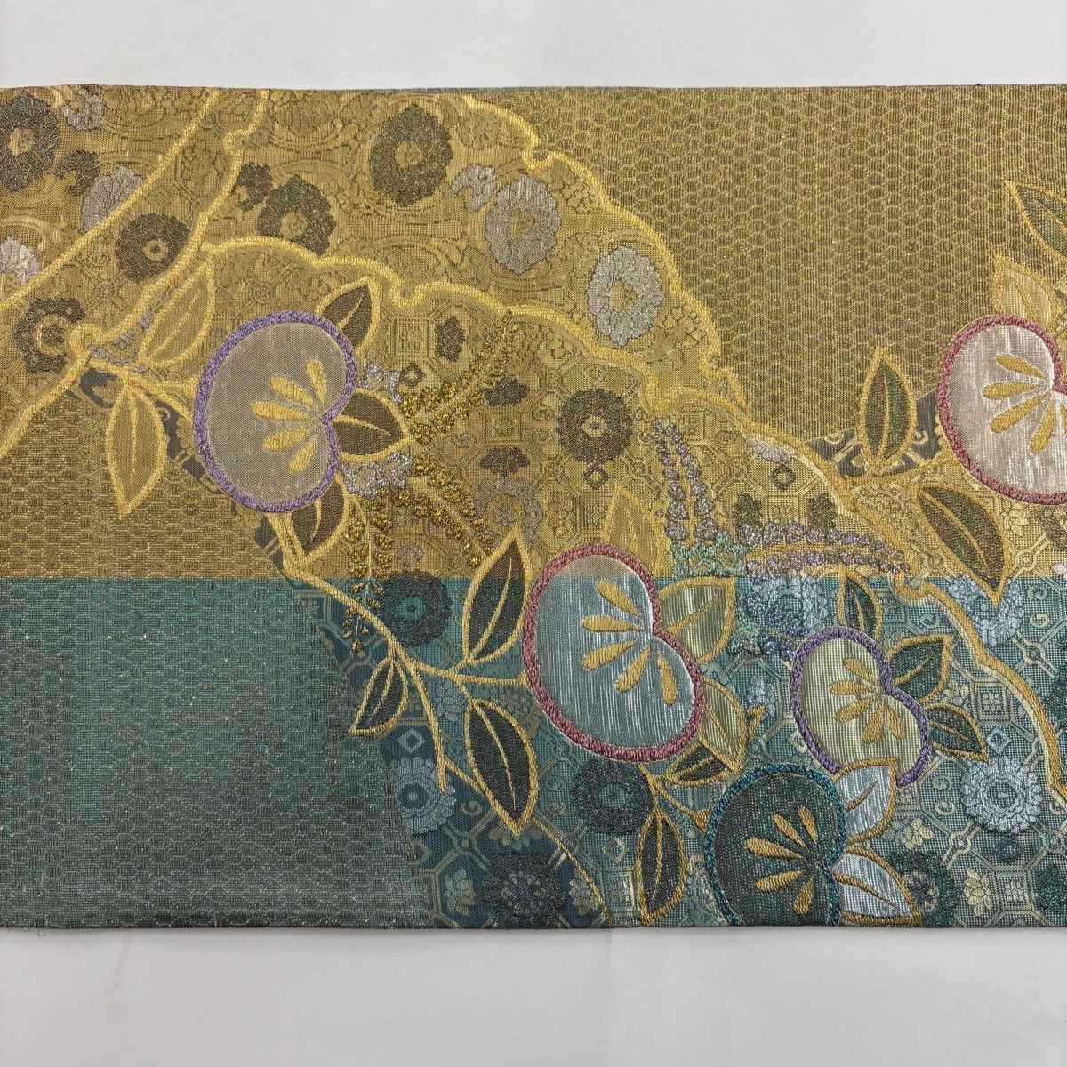 【美品】 袋帯 秀品 振袖向き 枝梅 金銀糸 箔 青緑 六通 正絹