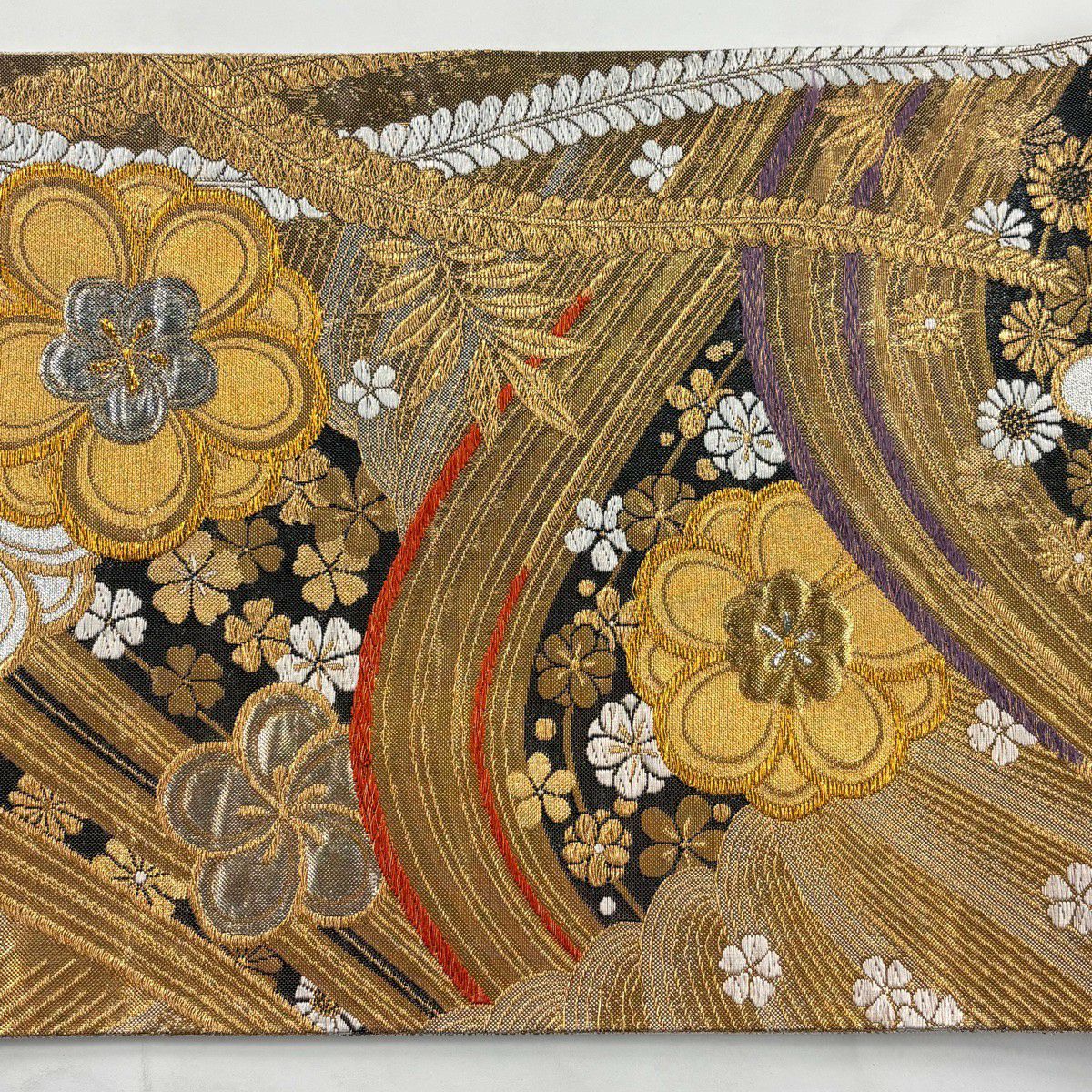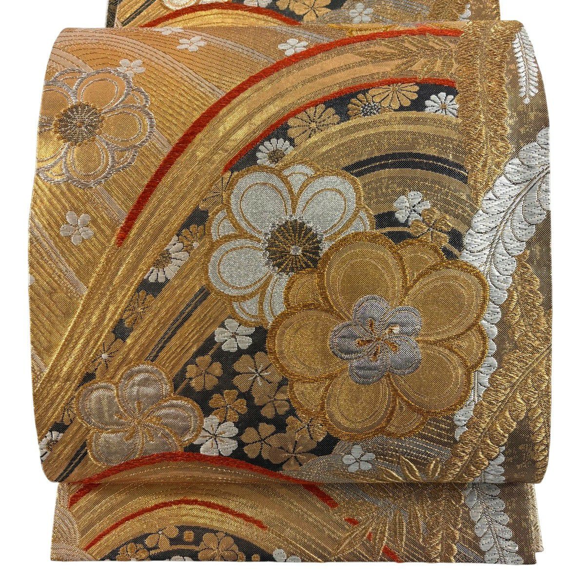 【美品】 袋帯 秀品 振袖向き 梅 波 金銀糸 箔 金色 六通 正絹