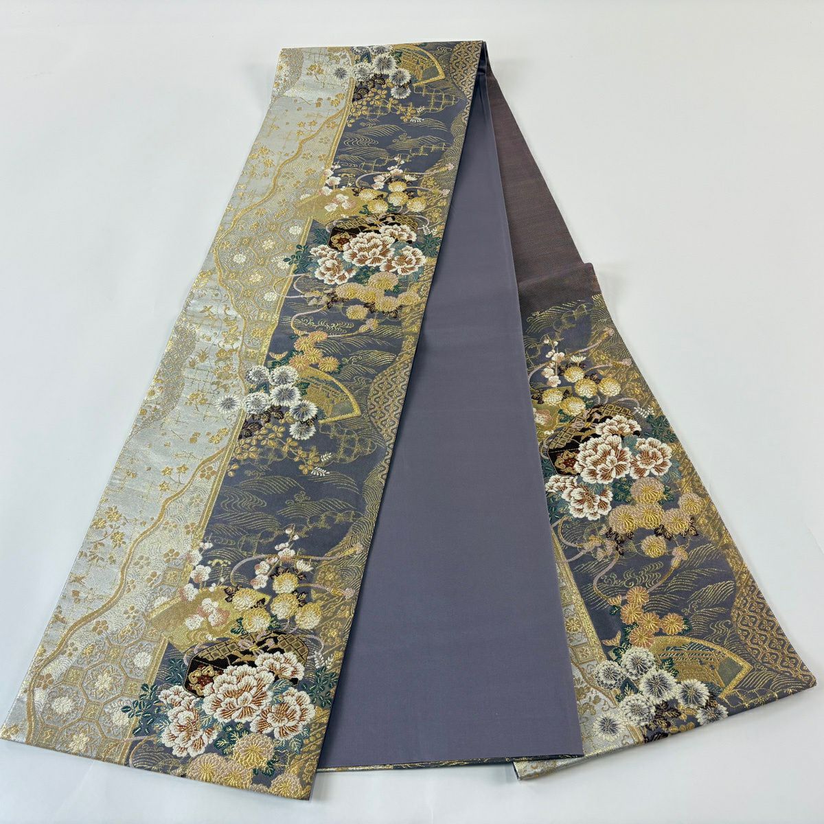 【美品】 袋帯 秀品 やまと 文箱 扇面 金糸 箔 紫 六通 正絹