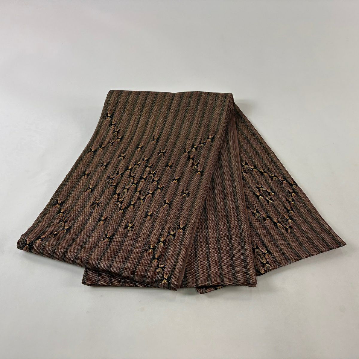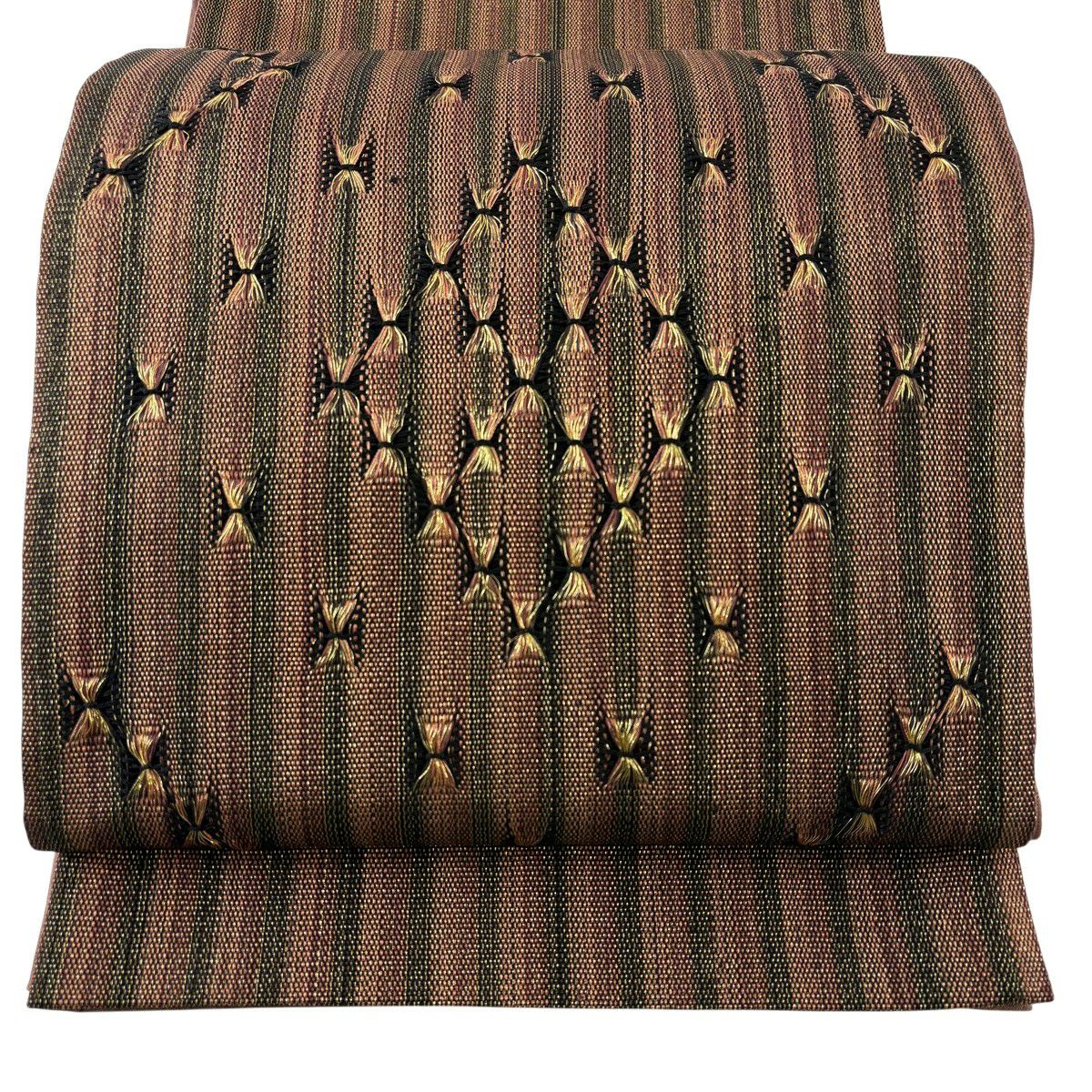 【美品】 袋帯 秀品 紬地 草花 絞り 金彩 茶色 お太鼓柄 正絹