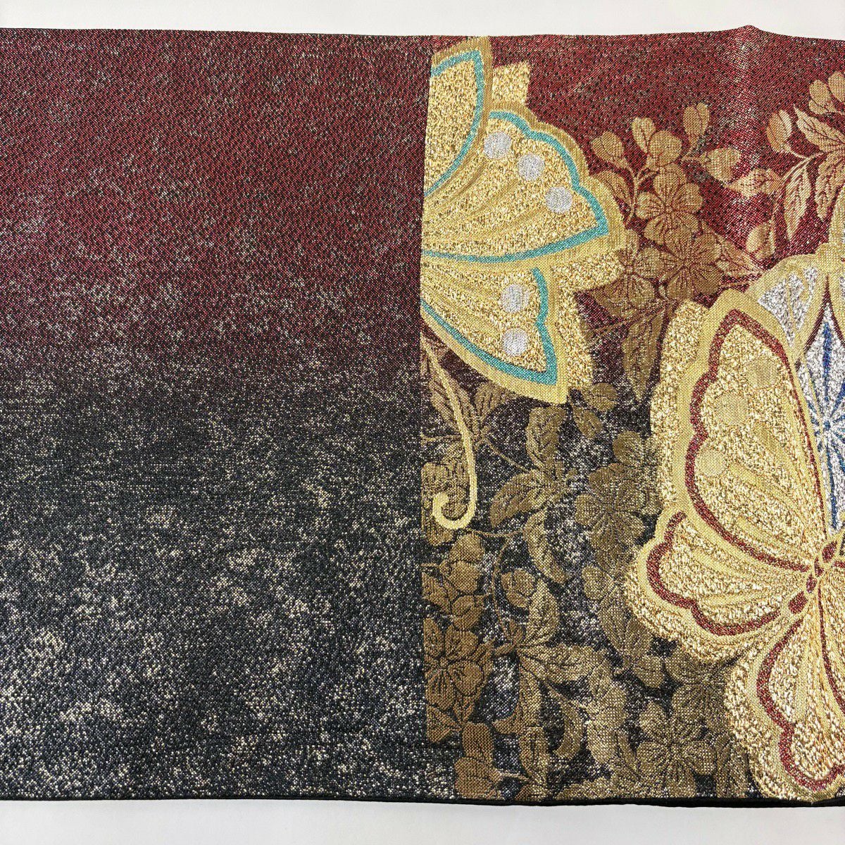 【美品】 袋帯 秀品 振袖向き 草花 蝶 金糸 箔 金色 六通 正絹