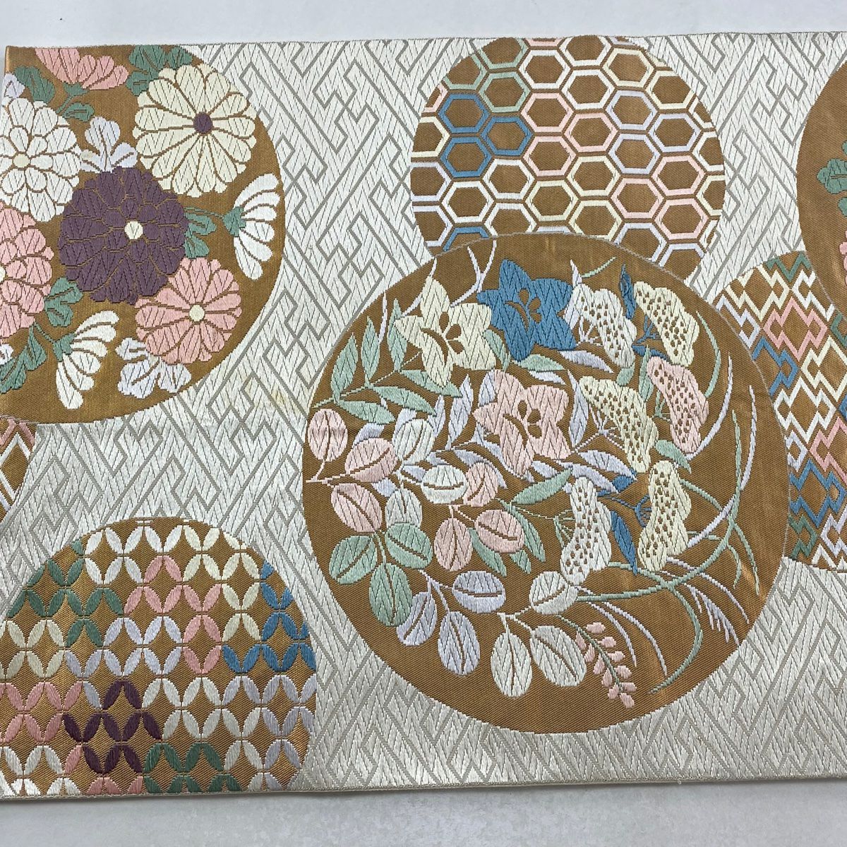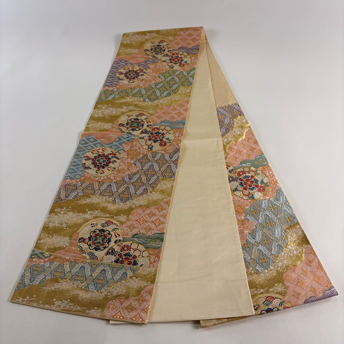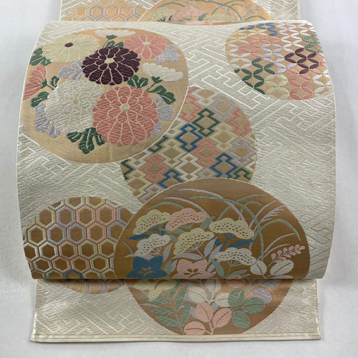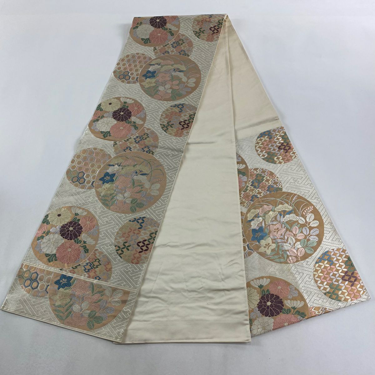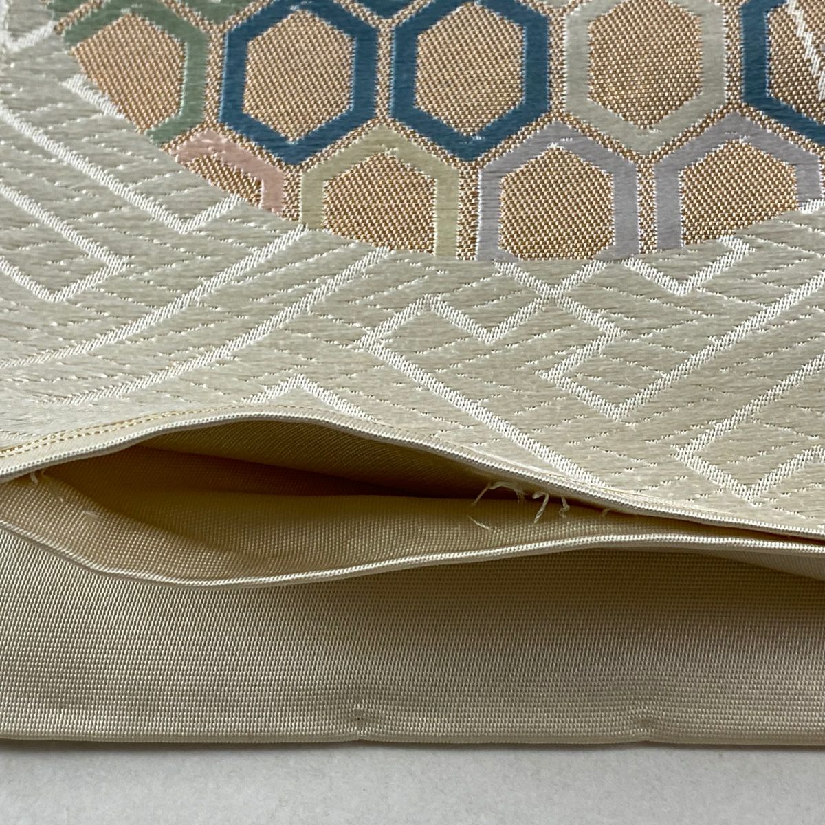 【在庫一掃】 【美品】 袋帯 秀品 幾何学 クリーム お太鼓柄 正絹
