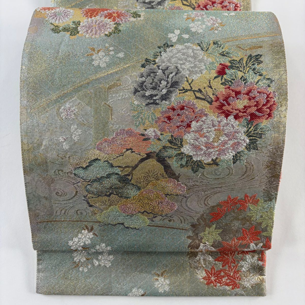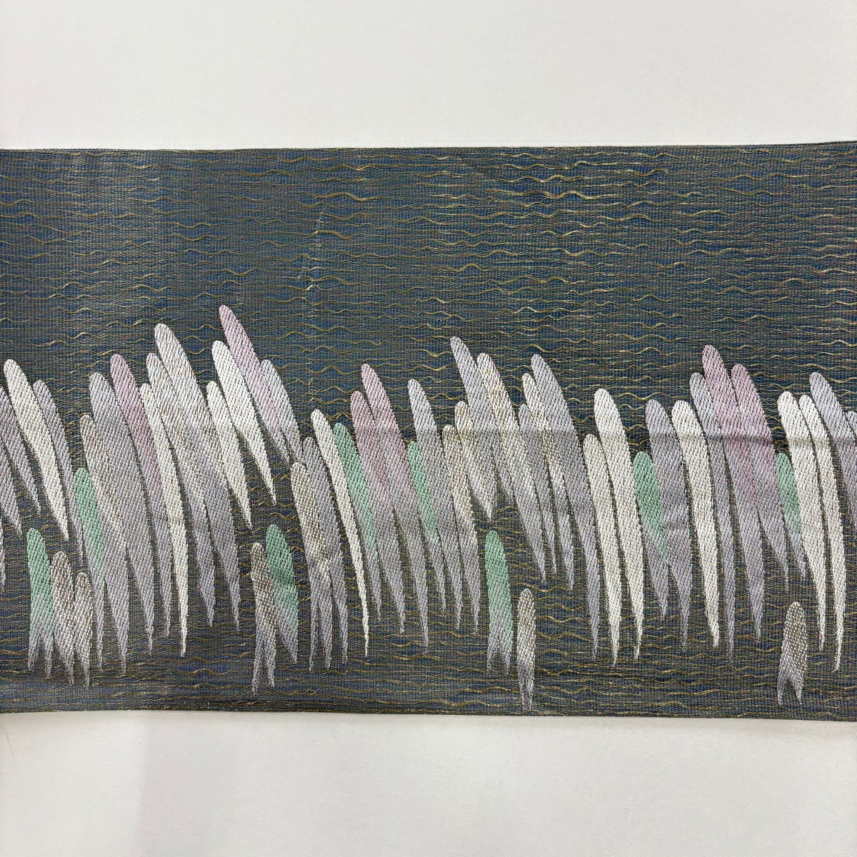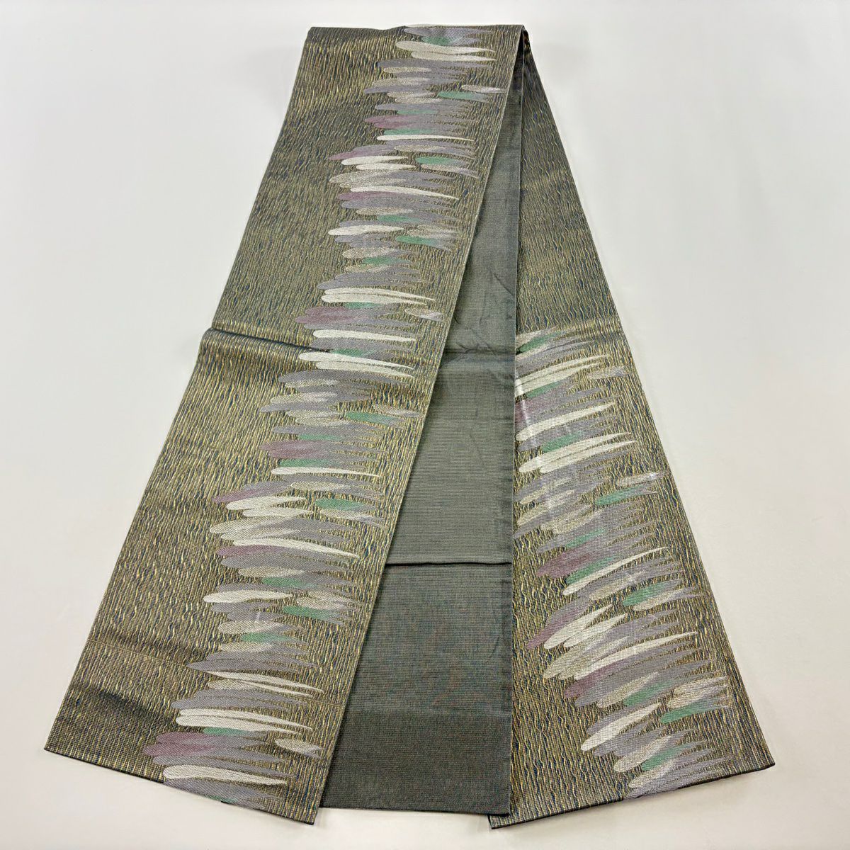 【在庫一掃】 【美品】 袋帯 秀品 山なみ 金銀糸 灰緑 六通 正絹
