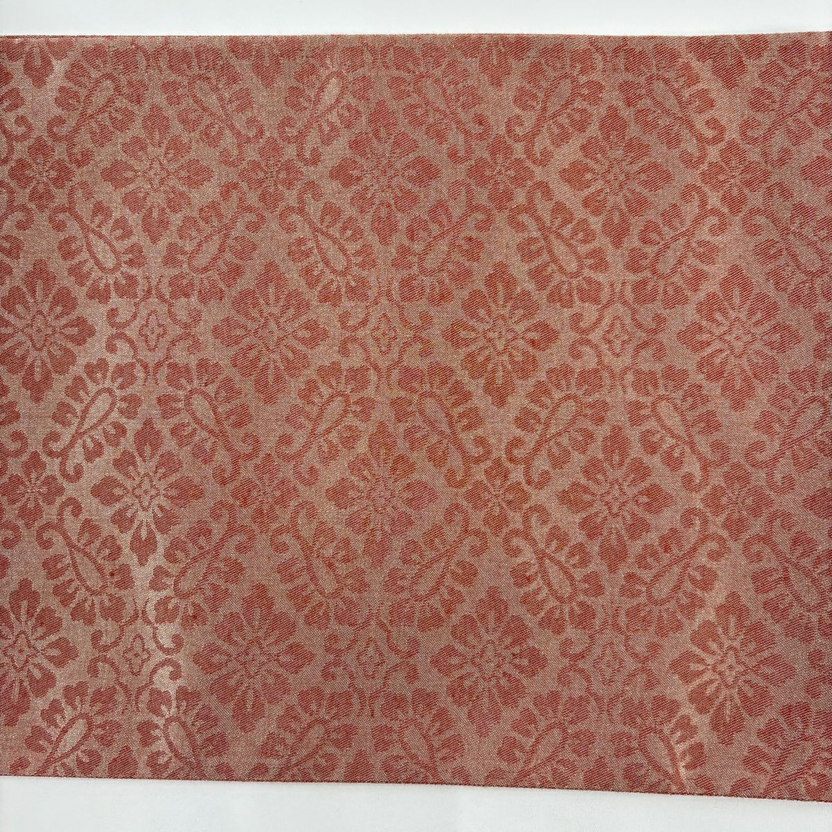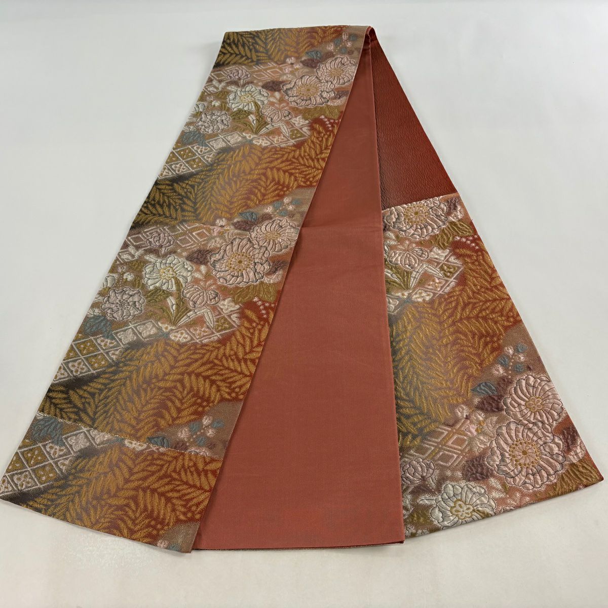 【在庫一掃】 袋帯 秀品 花唐草 幾何学模様 箔 赤茶 六通 正絹