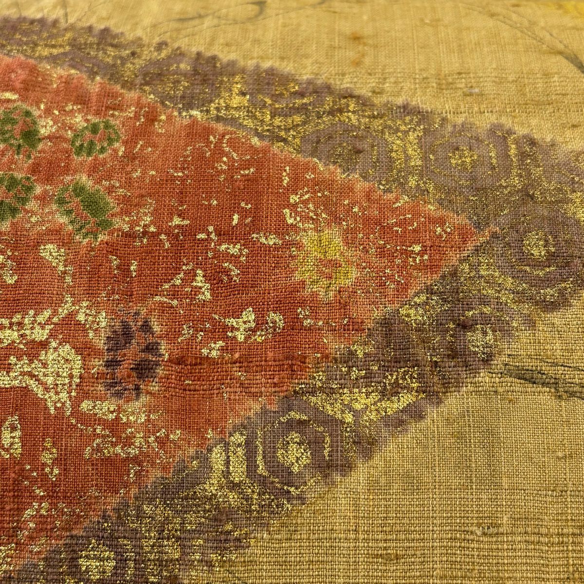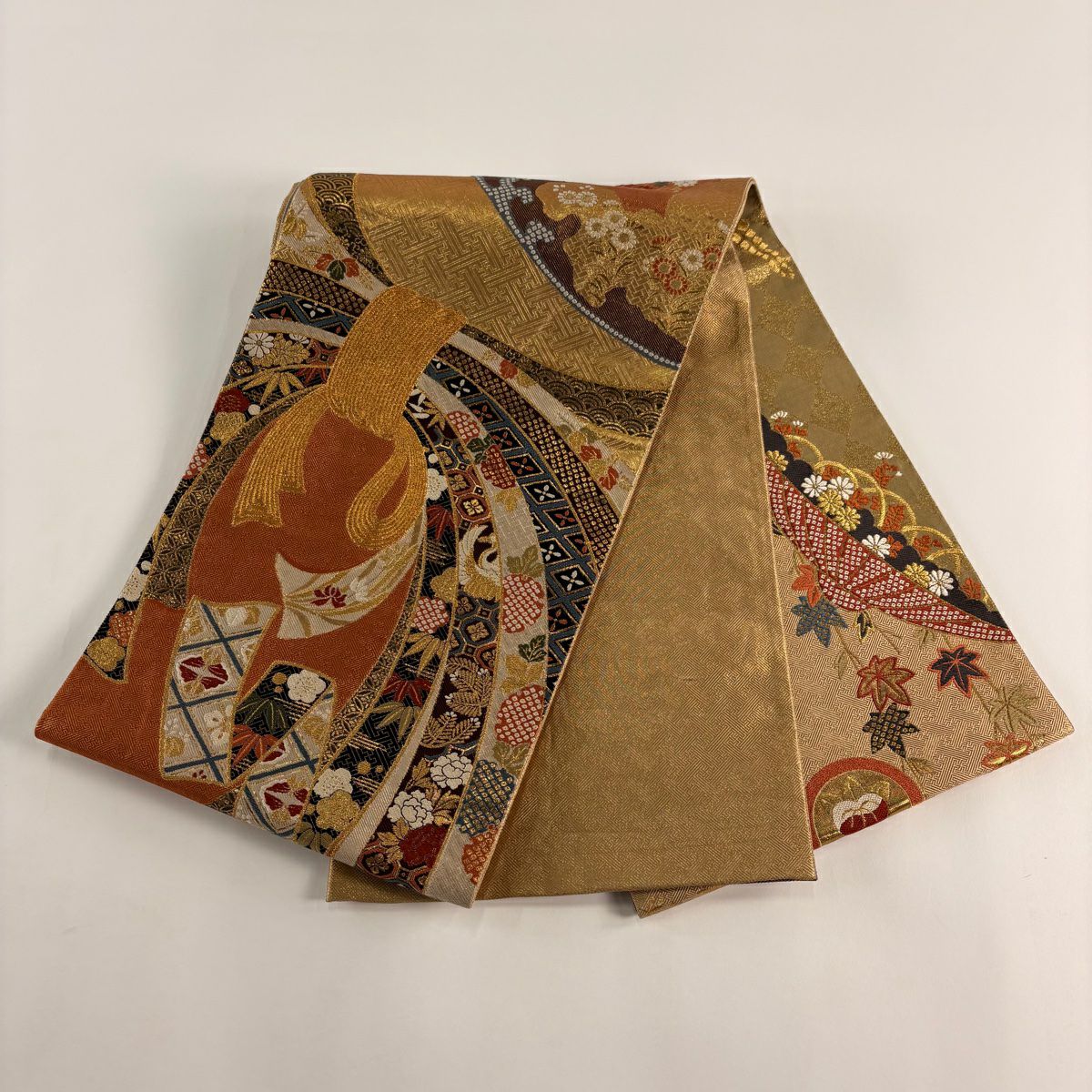 【在庫一掃】 【美品】 袋帯 秀品 幾何学 金糸 箔 金茶 六通 正絹