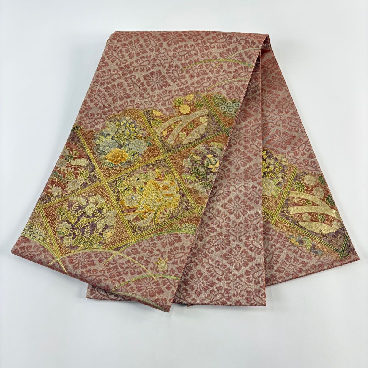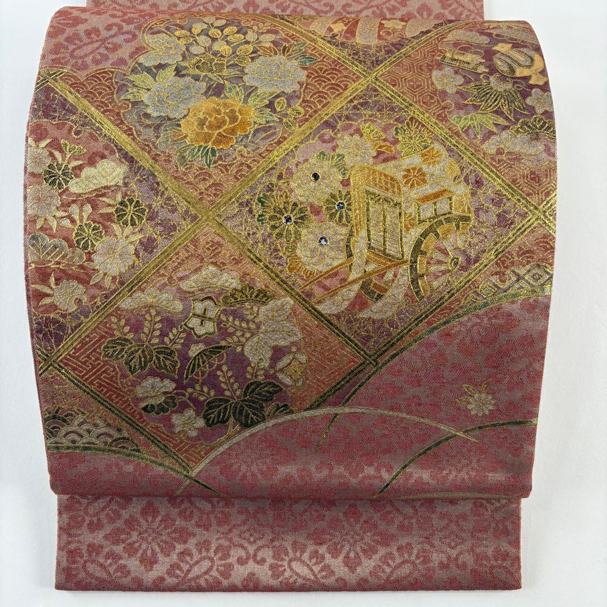 【在庫一掃】 袋帯 秀品 華文 花車 唐織 金糸 赤茶 六通 正絹