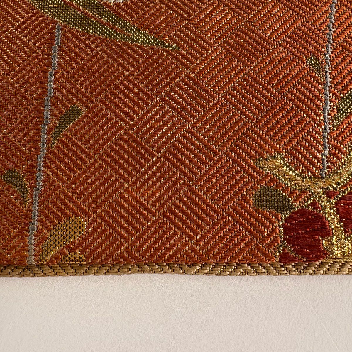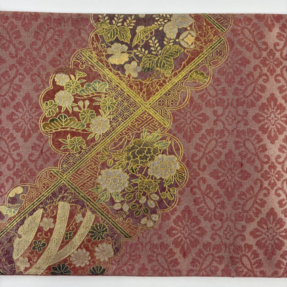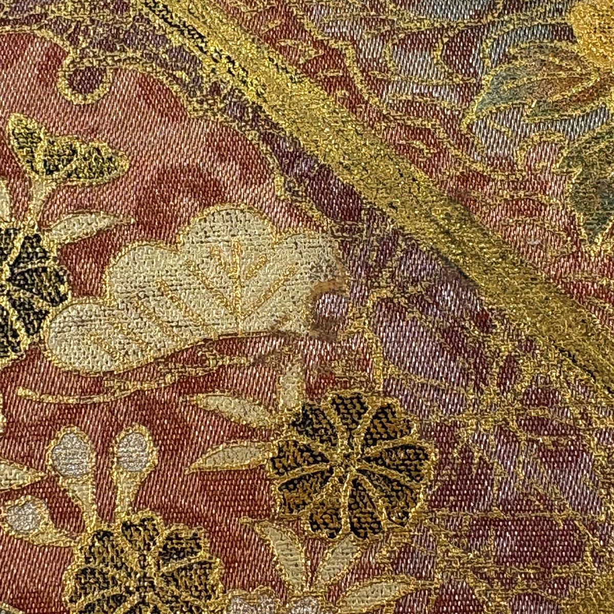 【在庫一掃】 袋帯 秀品 花柄 斜縞 金銀糸 箔 茜色 六通 正絹