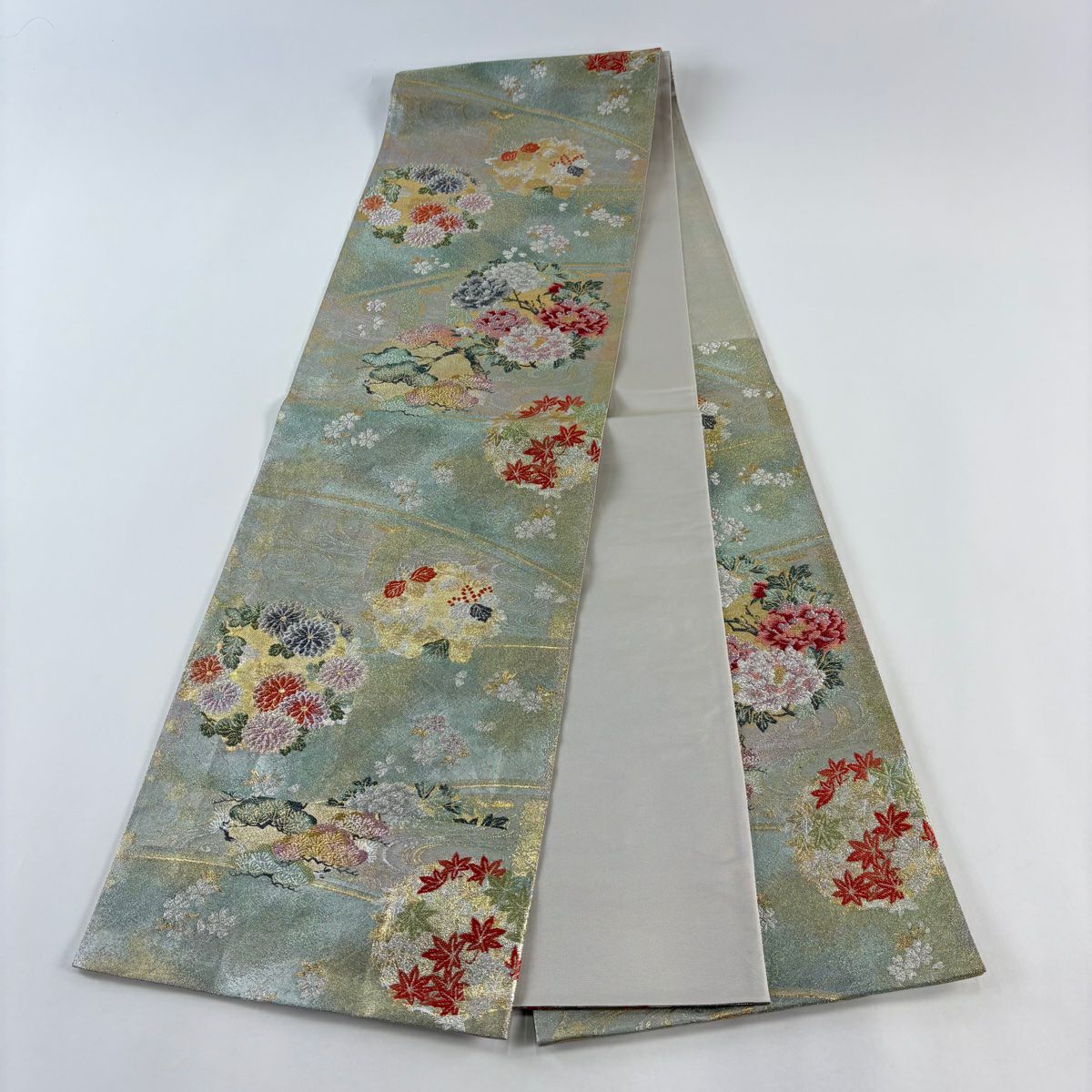 【在庫一掃】 袋帯 秀品 関西仕立て 菊 松梅 薄茶色 六通 正絹
