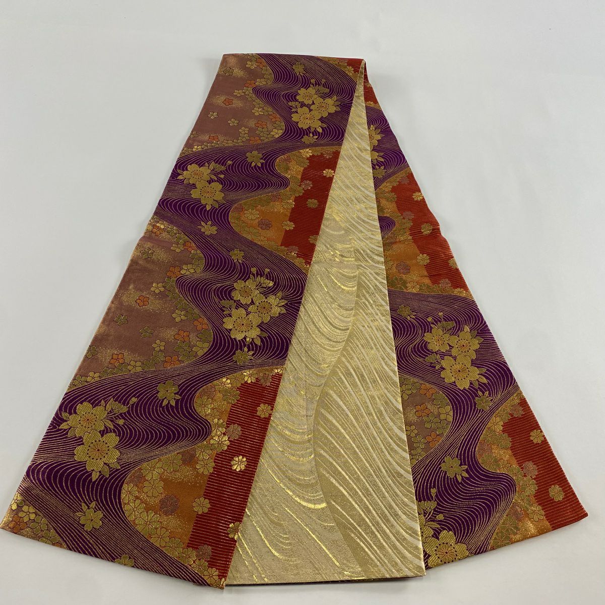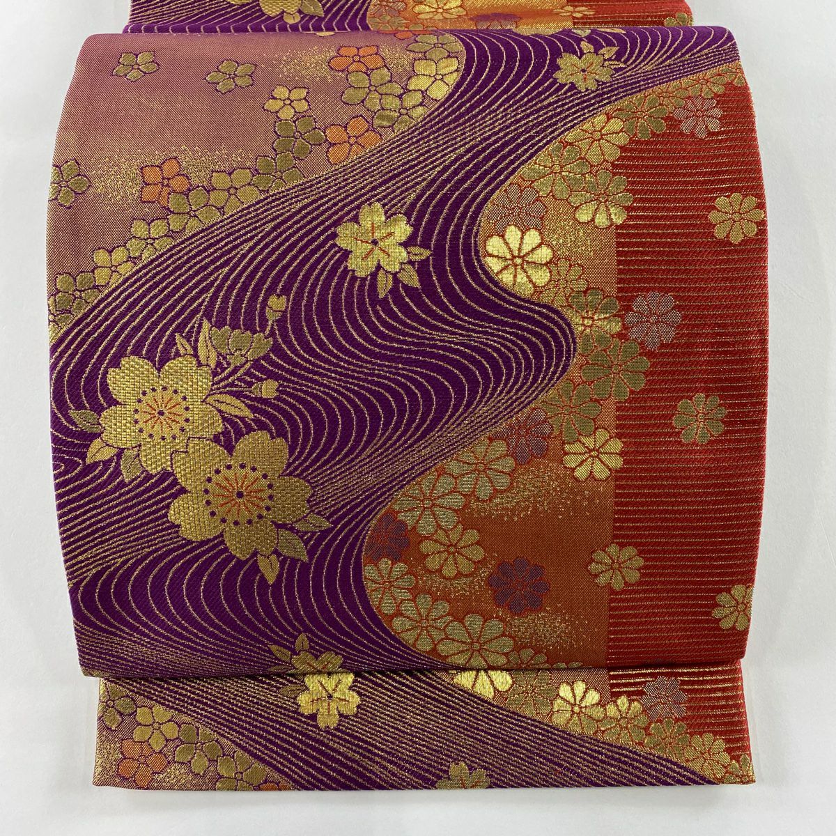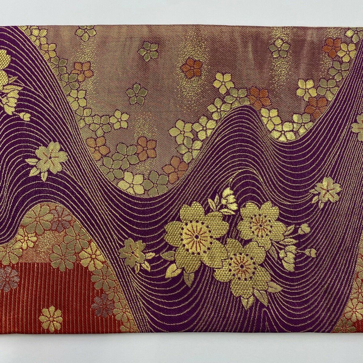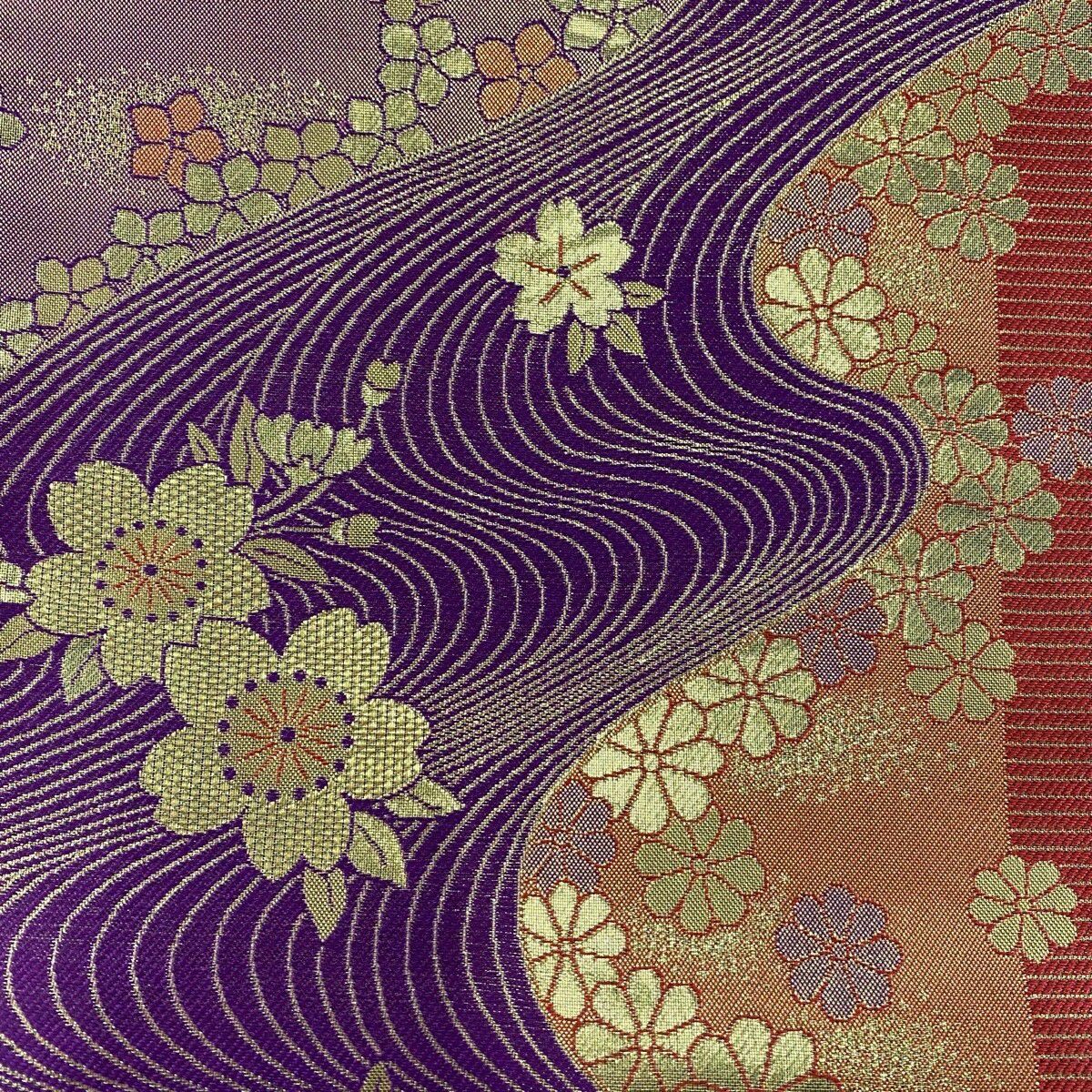 【美品】 袋帯 秀品 振袖向き 桜 流水 金糸 箔 紫 全通 正絹