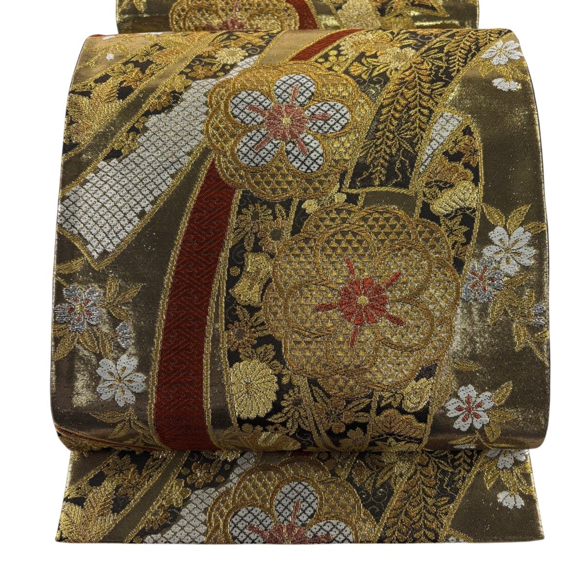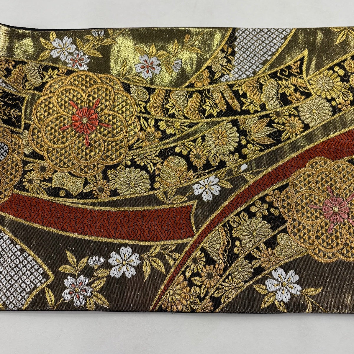 【在庫一掃】 袋帯 秀品 桜 幾何学 箔 金糸 黄土色 六通 正絹