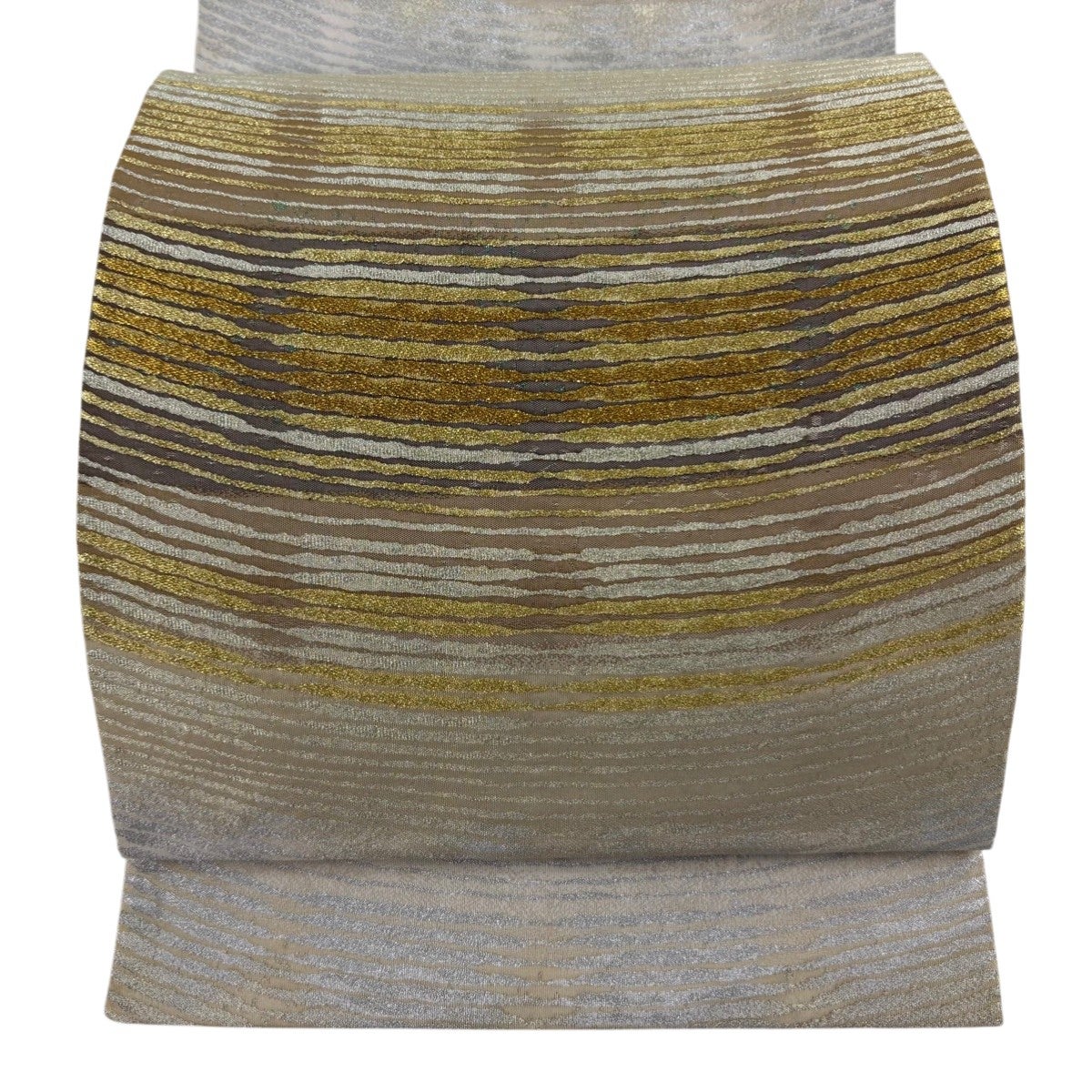 【在庫一掃】 袋帯 秀品 関西仕立て 段縞 金糸 灰色 全通 正絹