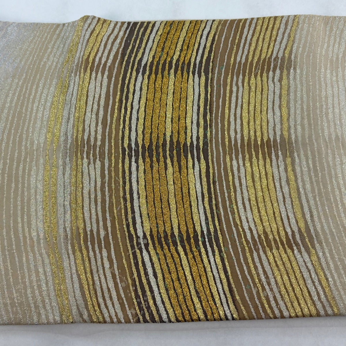 【在庫一掃】 【美品】 袋帯 秀品 段縞 金糸 箔 茶色 六通 正絹
