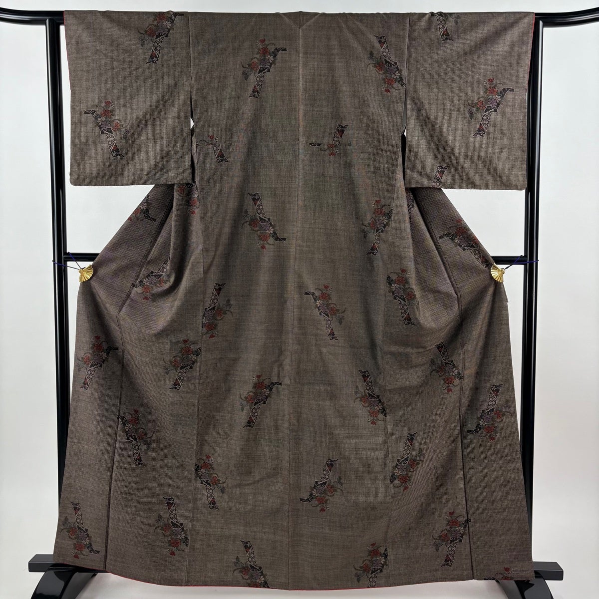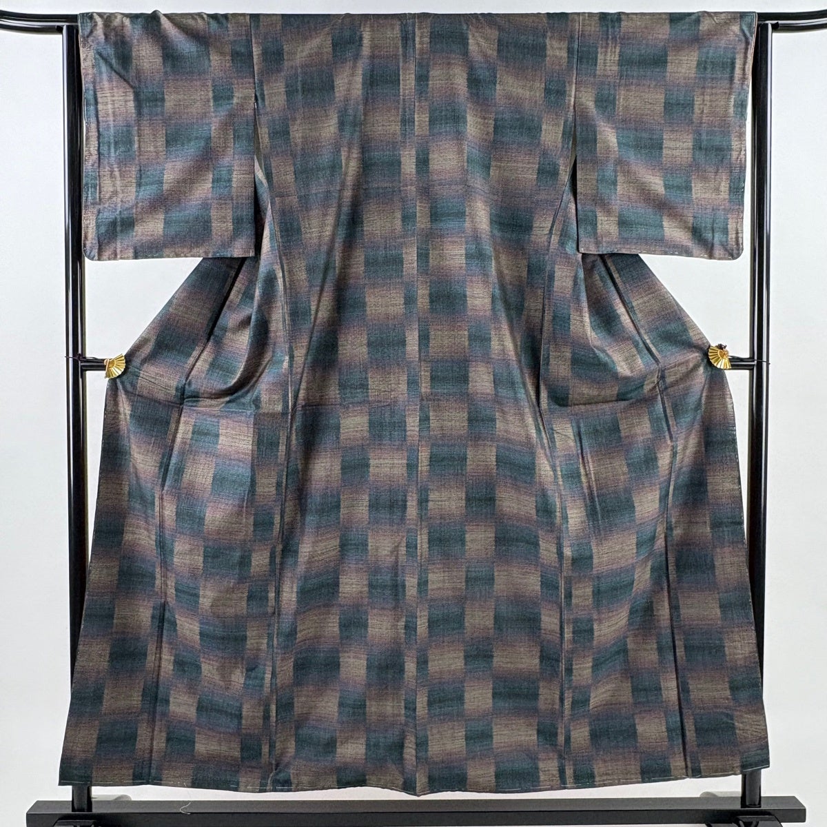 紬 身丈155cm 裄丈64cm M 袷 変わり市松 茶紫 正絹 秀品