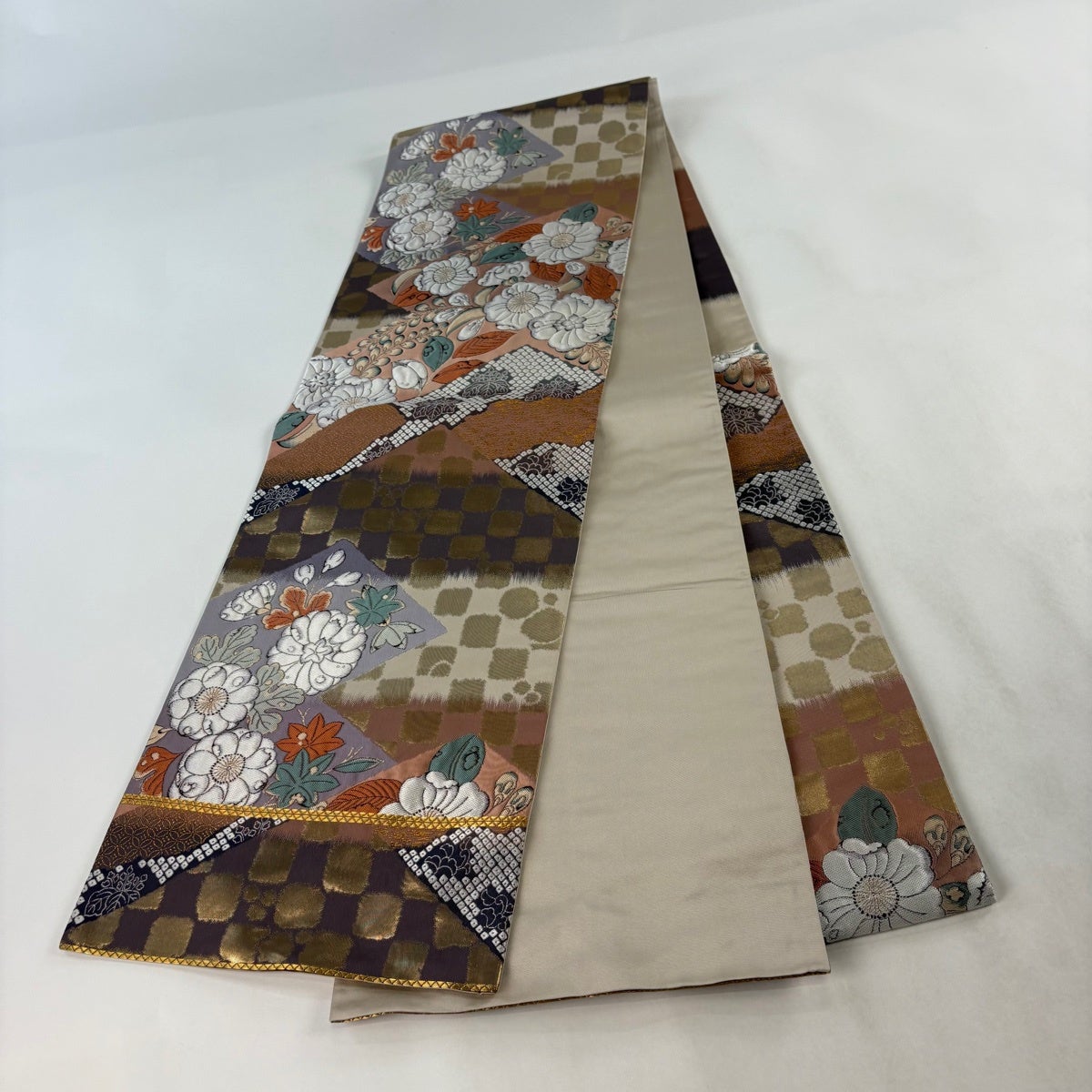 【美品】 袋帯 秀品 花唐草 菱 金糸 箔 ベージュ 六通 正絹
