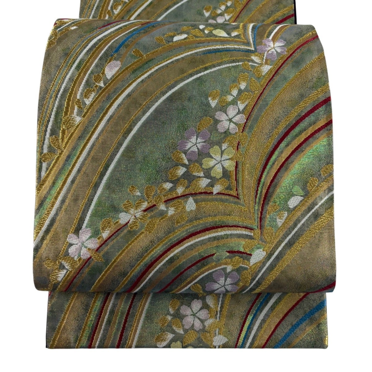 【美品】 袋帯 秀品 華文 草花 金銀彩 螺鈿 灰緑 お太鼓柄 正絹