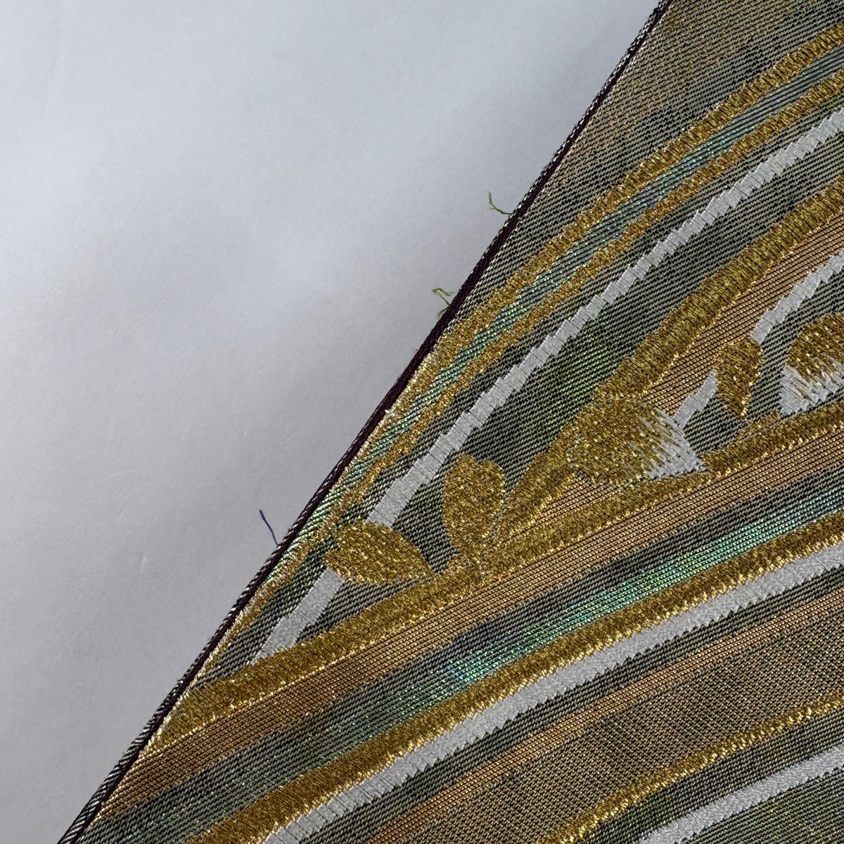 【美品】 袋帯 秀品 落款あり 斜縞 ぼかし 銀糸 鶯色 全通 正絹