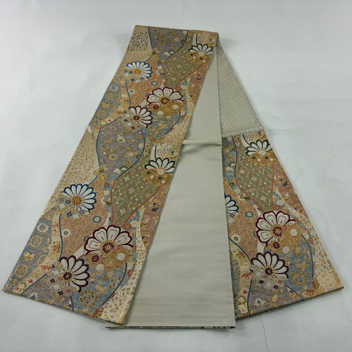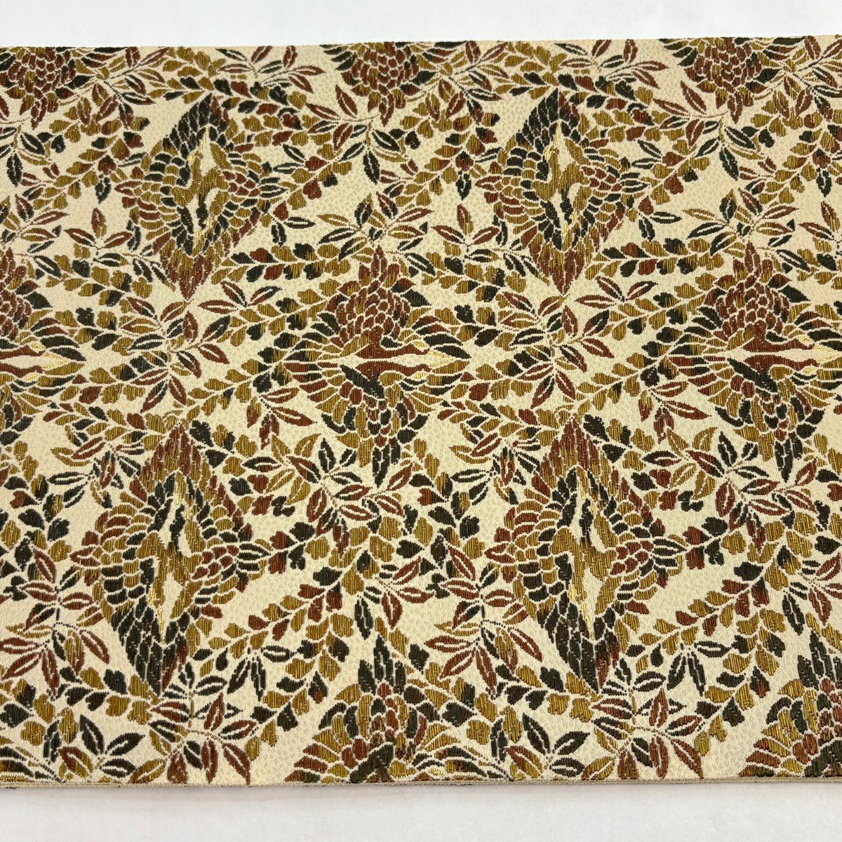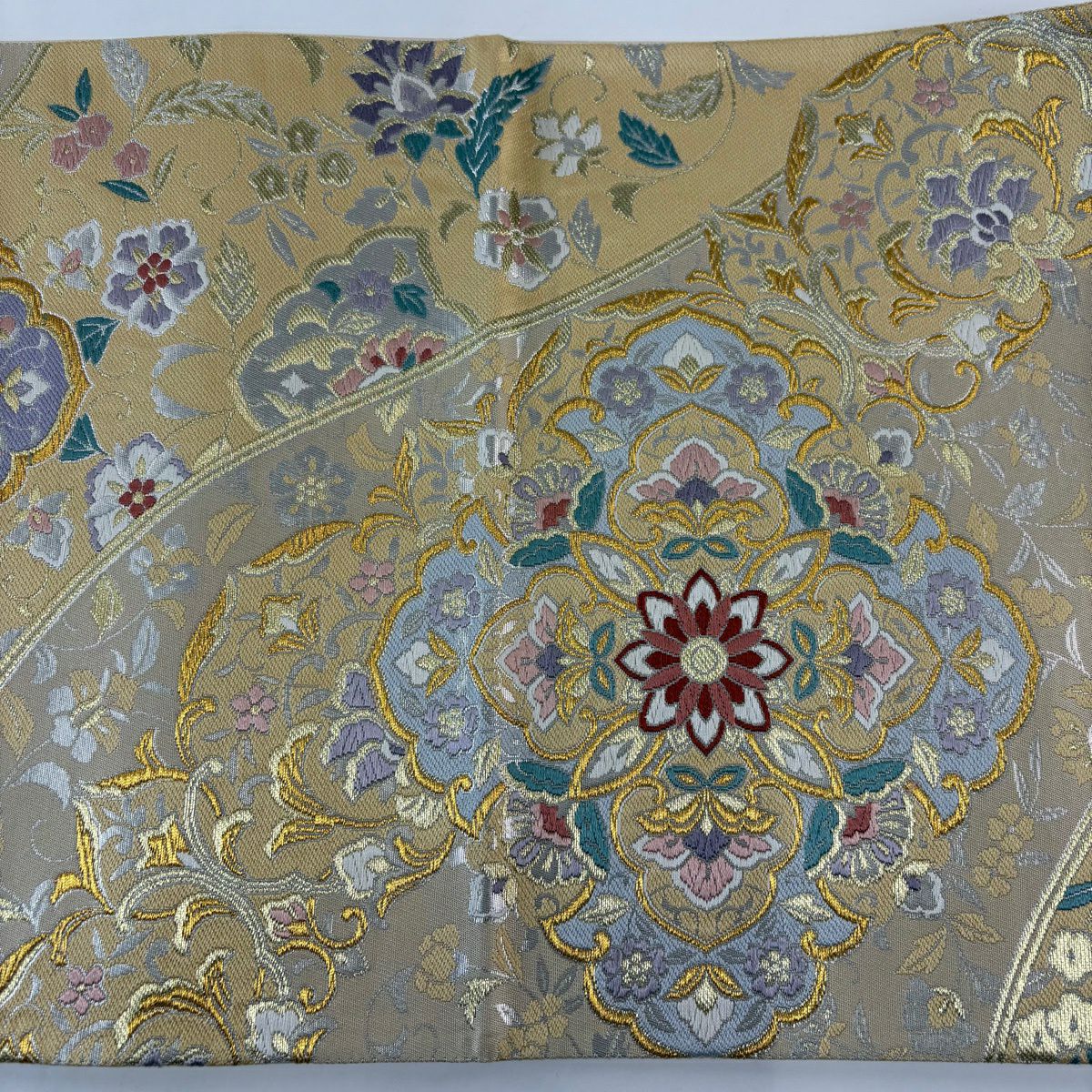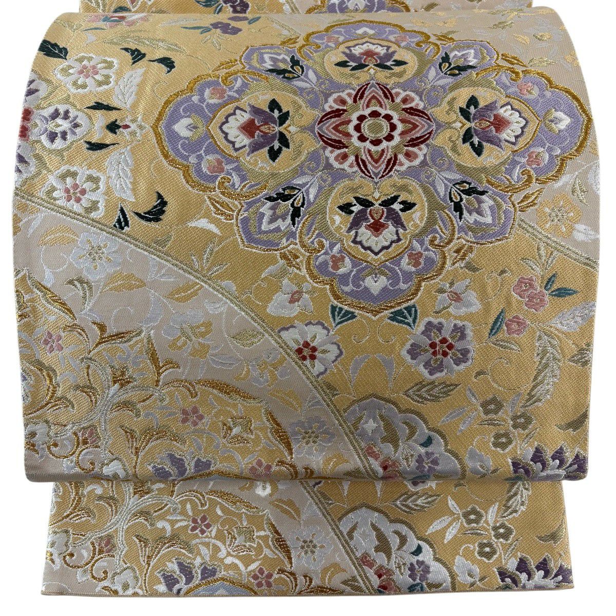【美品】 袋帯 秀品 華文 草花 金糸 箔 ベージュ 六通 正絹
