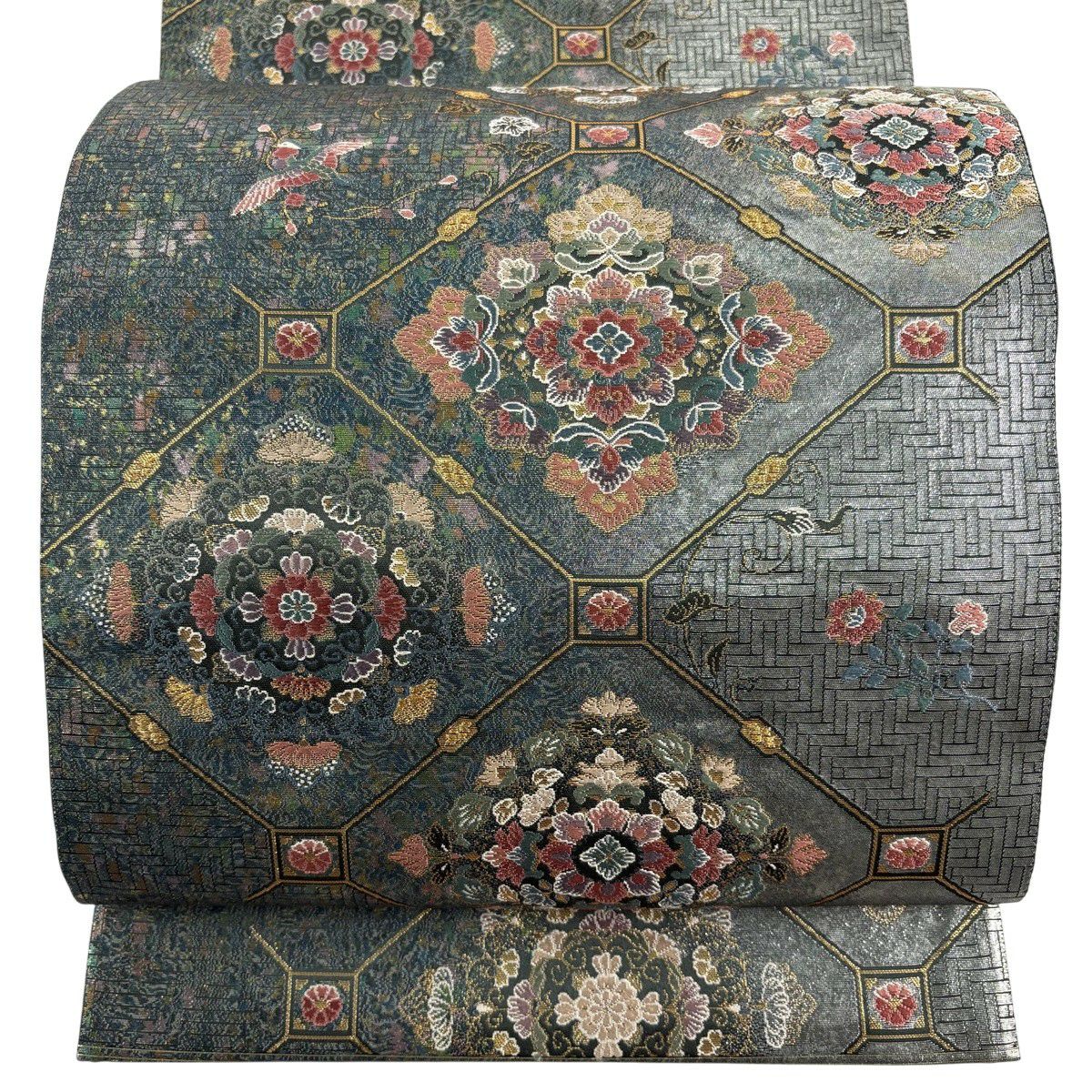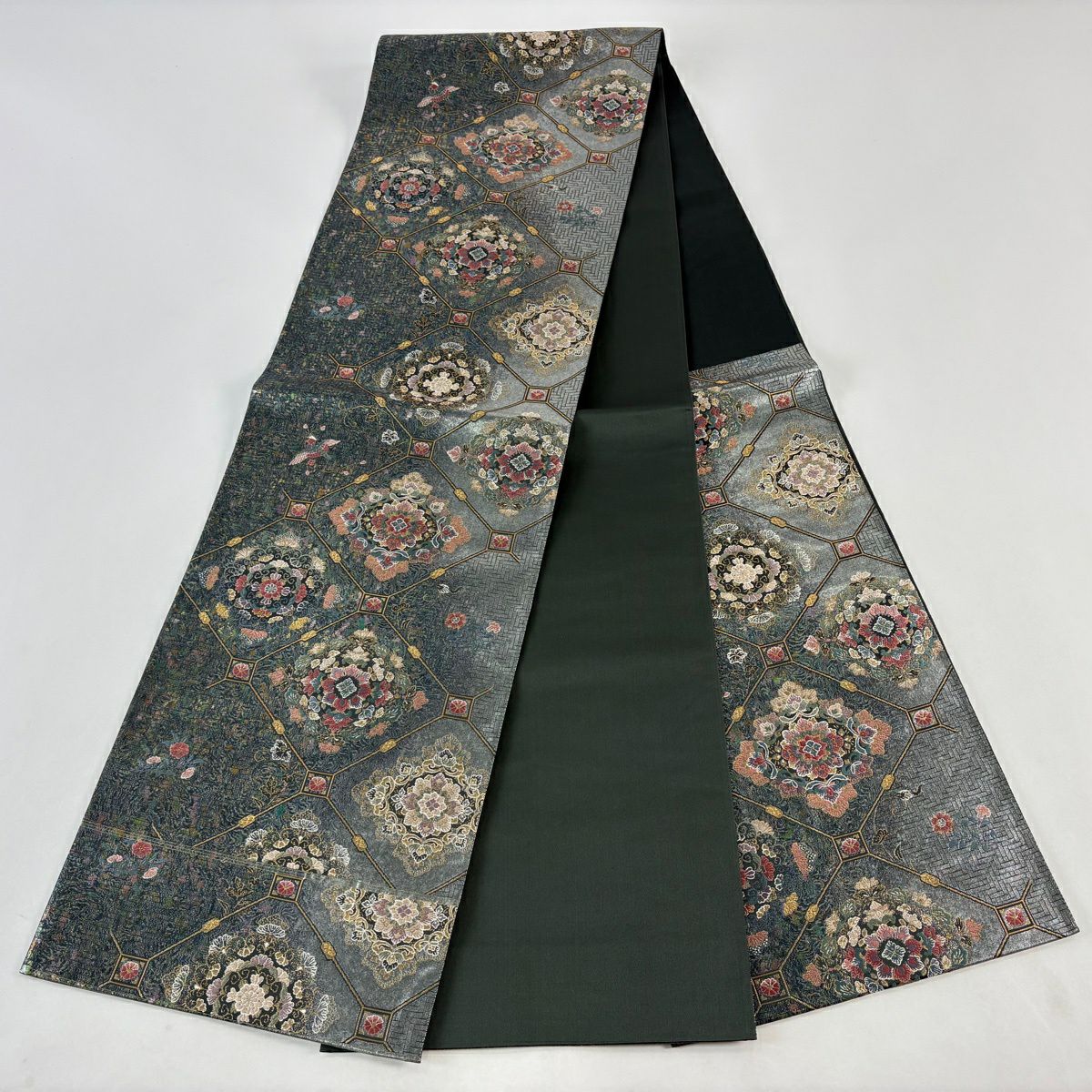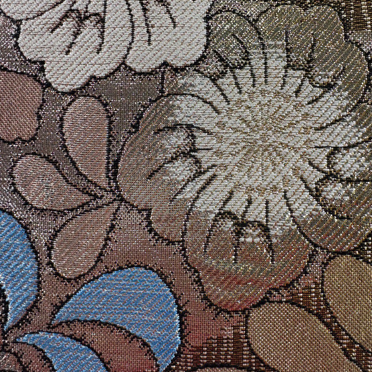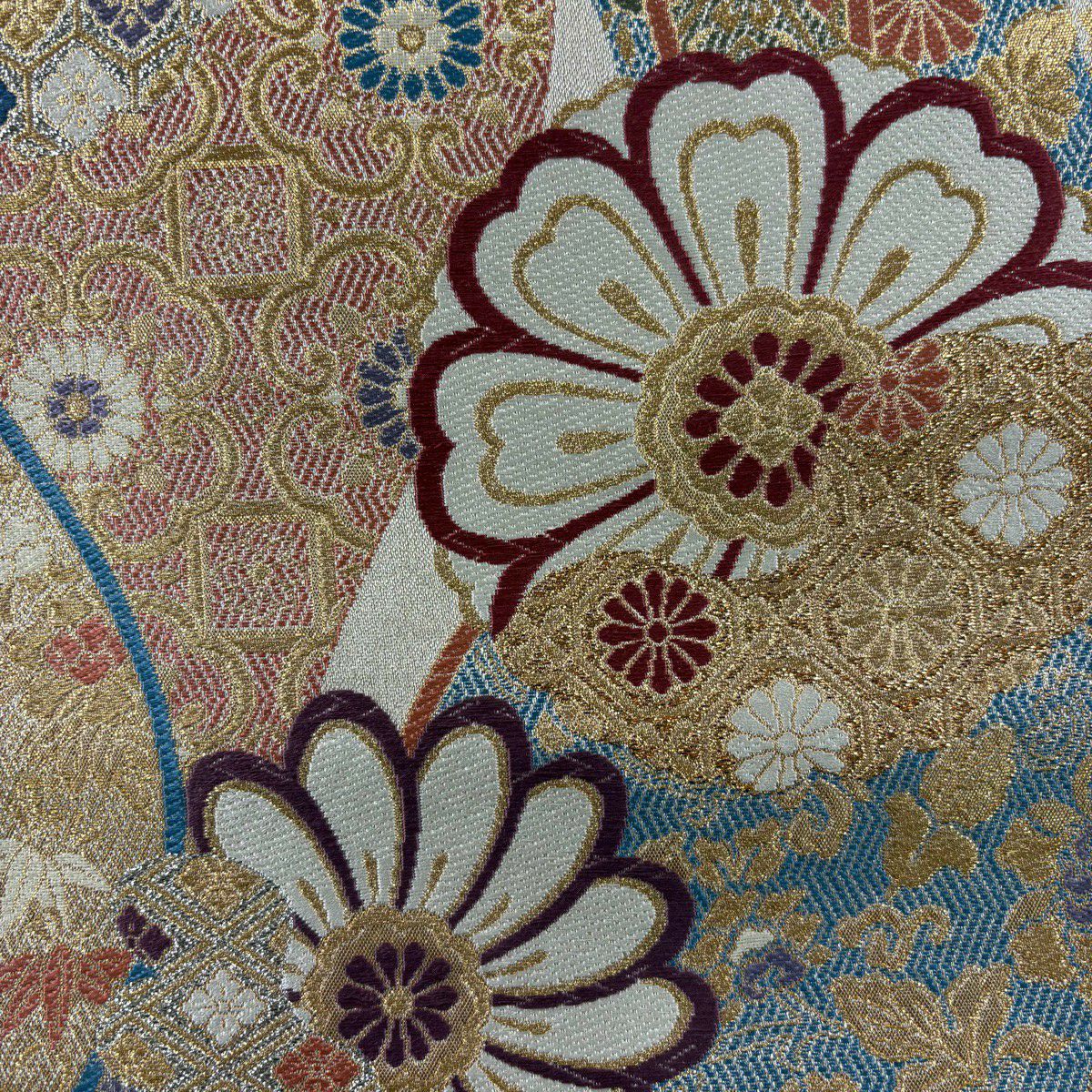 袋帯 秀品 振袖向き 草花 有職文様 金糸 唐織 青灰色 六通 正絹