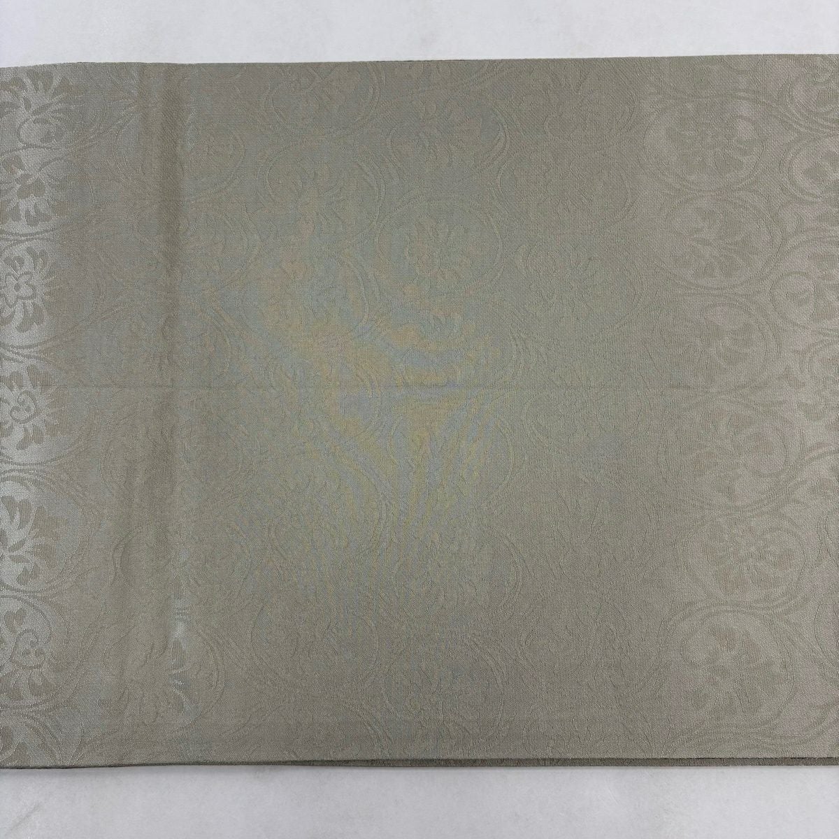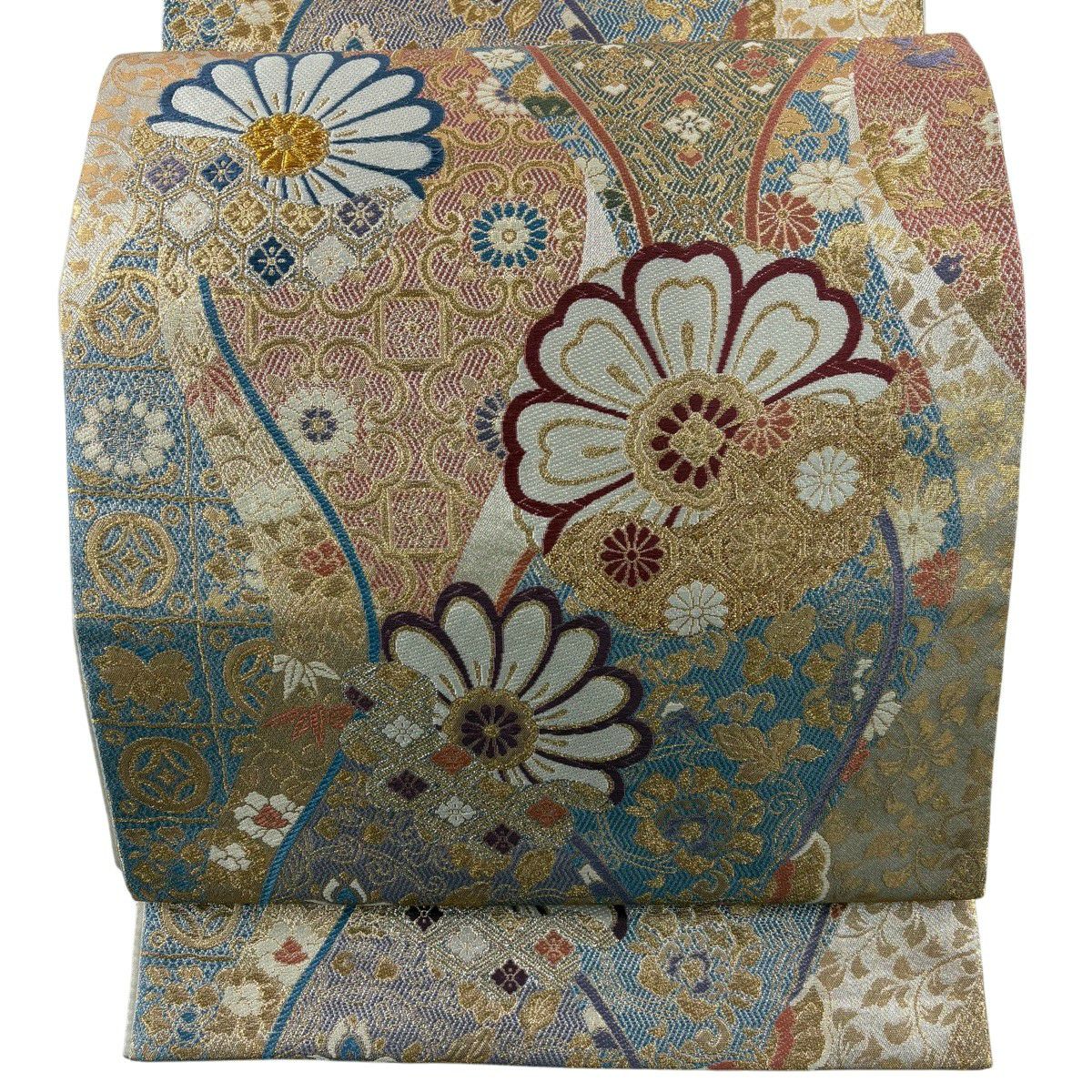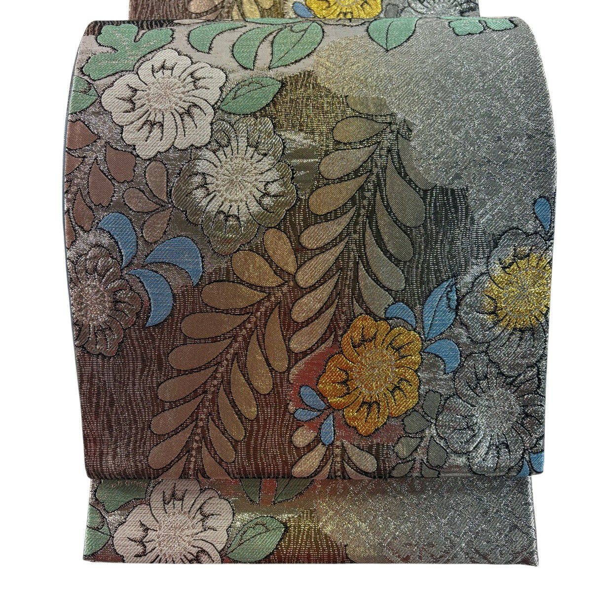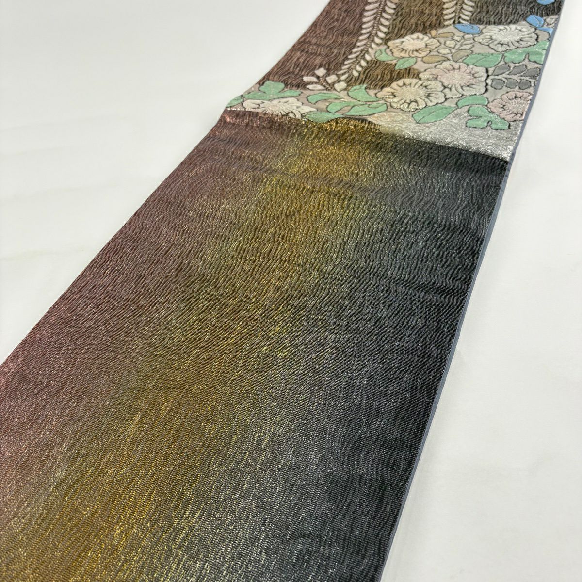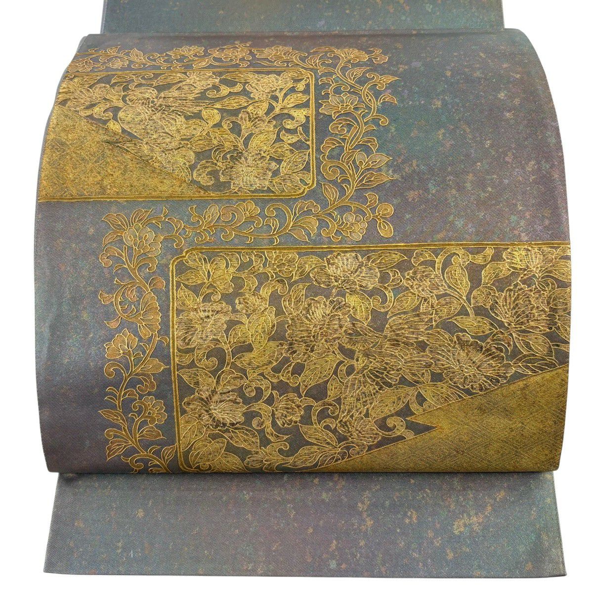 袋帯 秀品 振袖向き 草花 有職文様 金糸 唐織 青灰色 六通 正絹