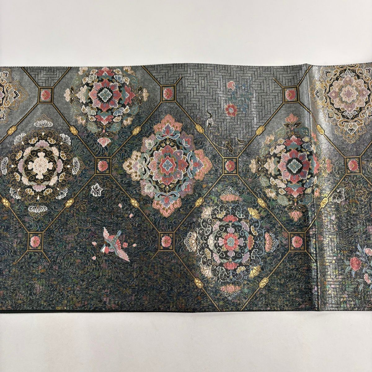 【美品】 袋帯 秀品 花喰い鳥 花唐草 箔 金彩 灰色 お太鼓柄 正絹