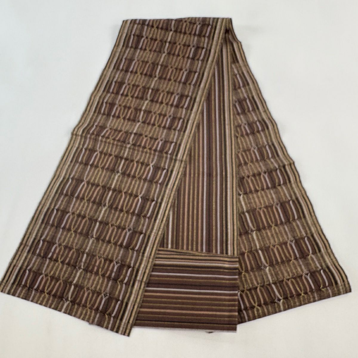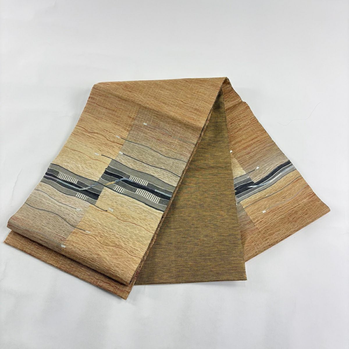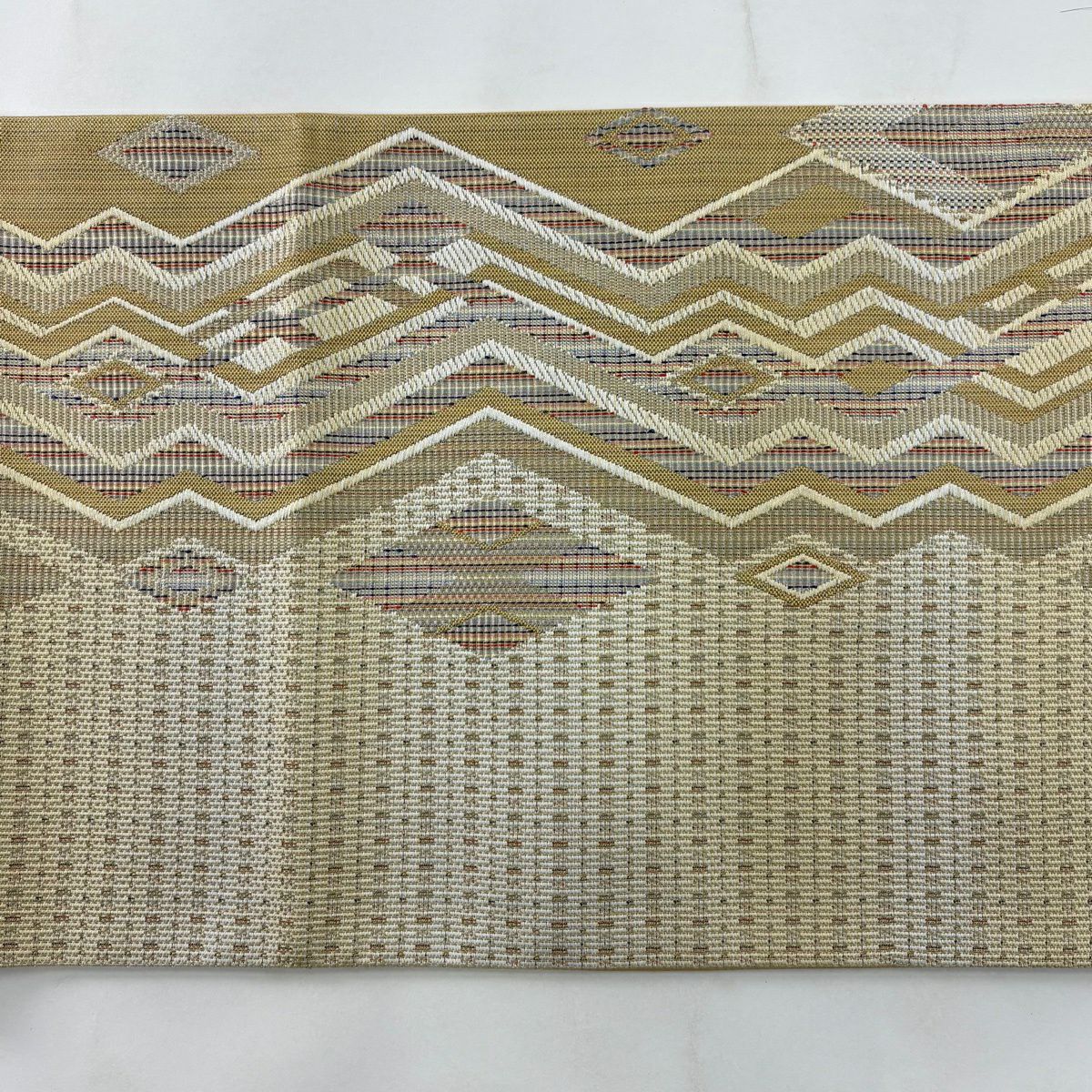 【美品】 袋帯 秀品 よろけ縞 幾何学模様 山吹茶色 お太鼓柄 正絹