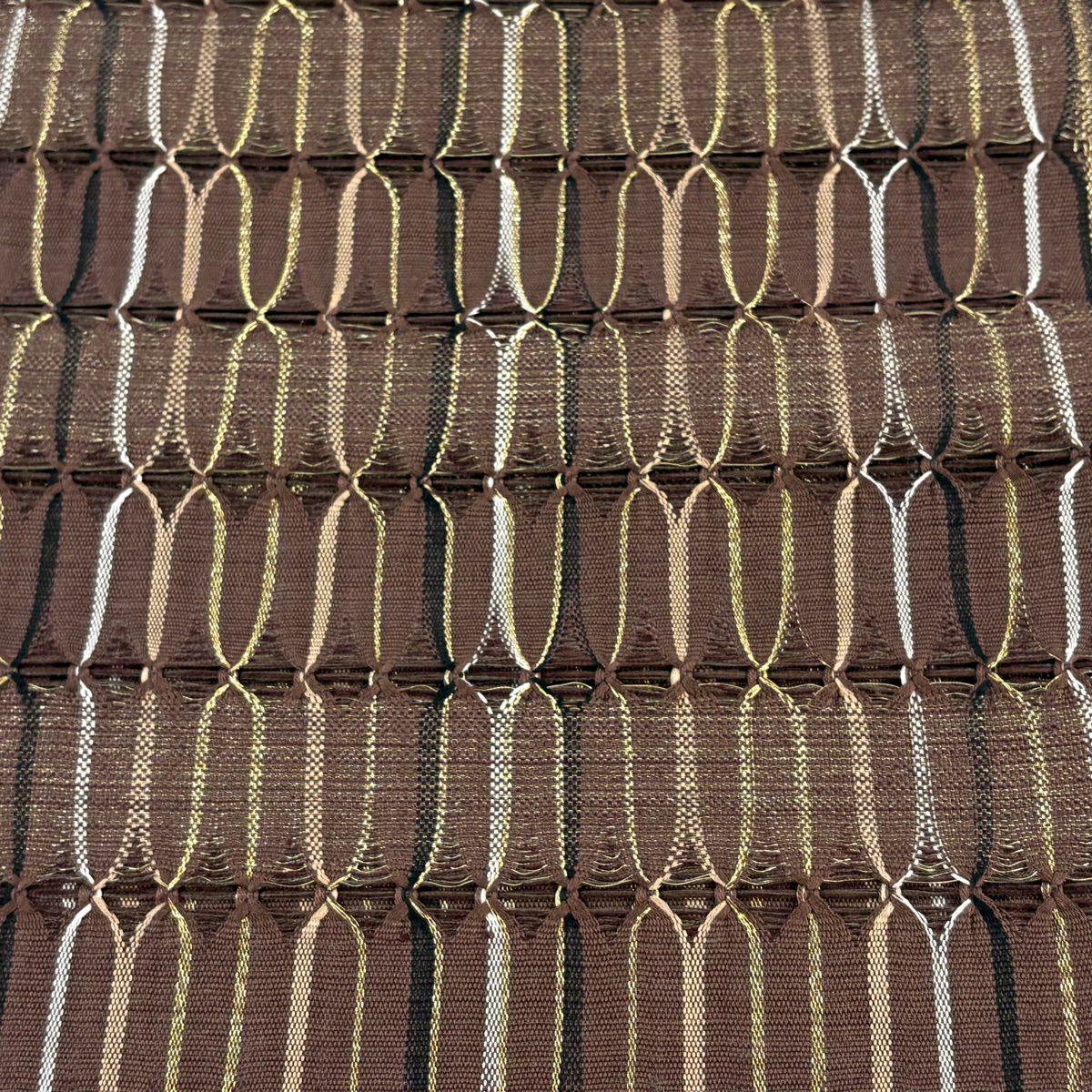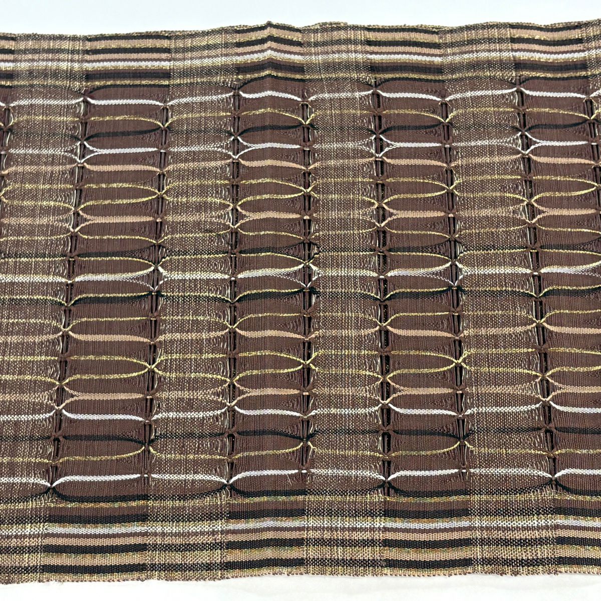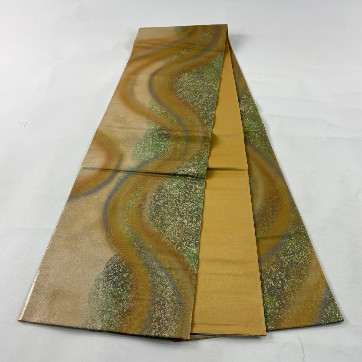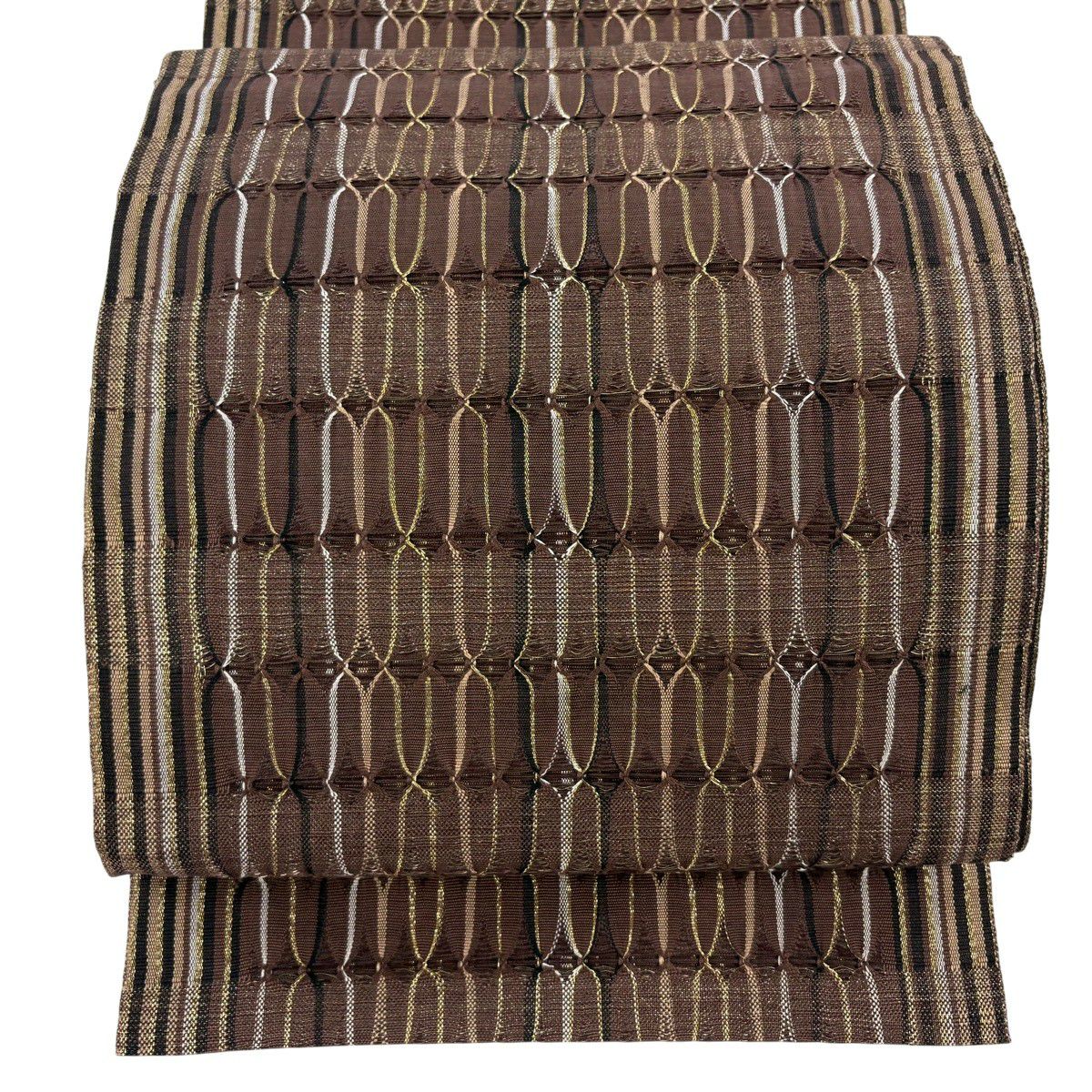 【美品】 袋帯 秀品 よろけ縞 幾何学模様 山吹茶色 お太鼓柄 正絹